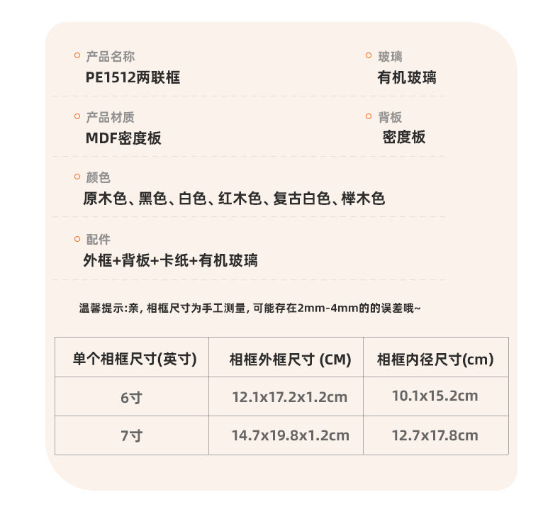 | Frame size | 6inch (can hold 10.1*15.2cm),7inch (can hold 12.7*17.8cm) |