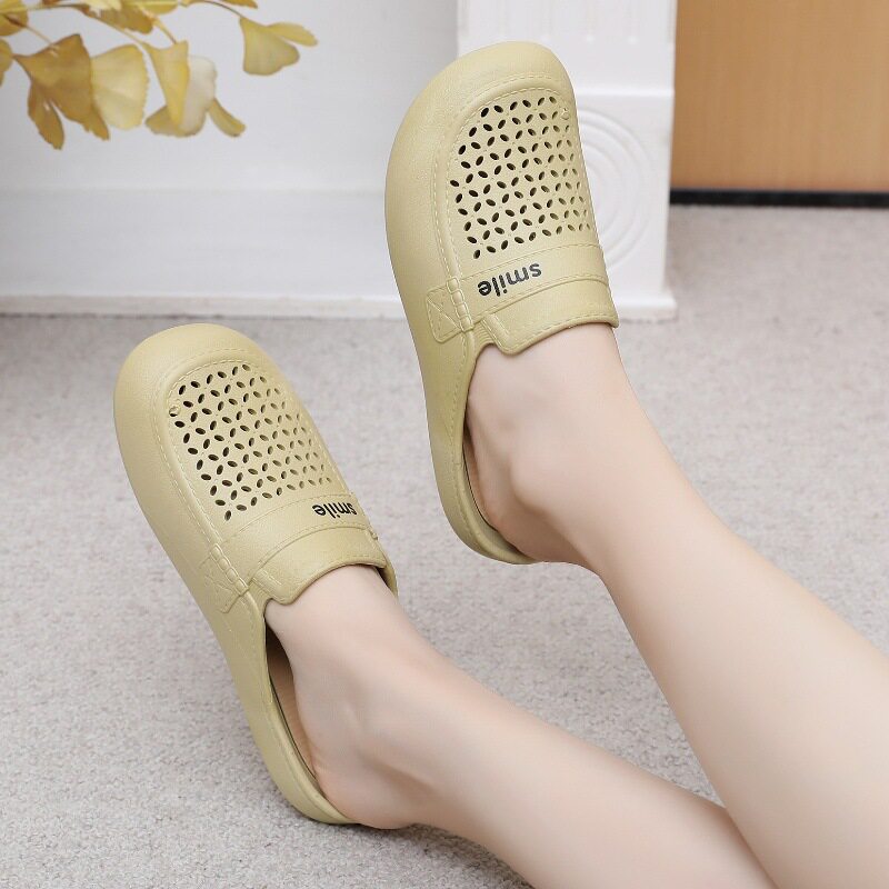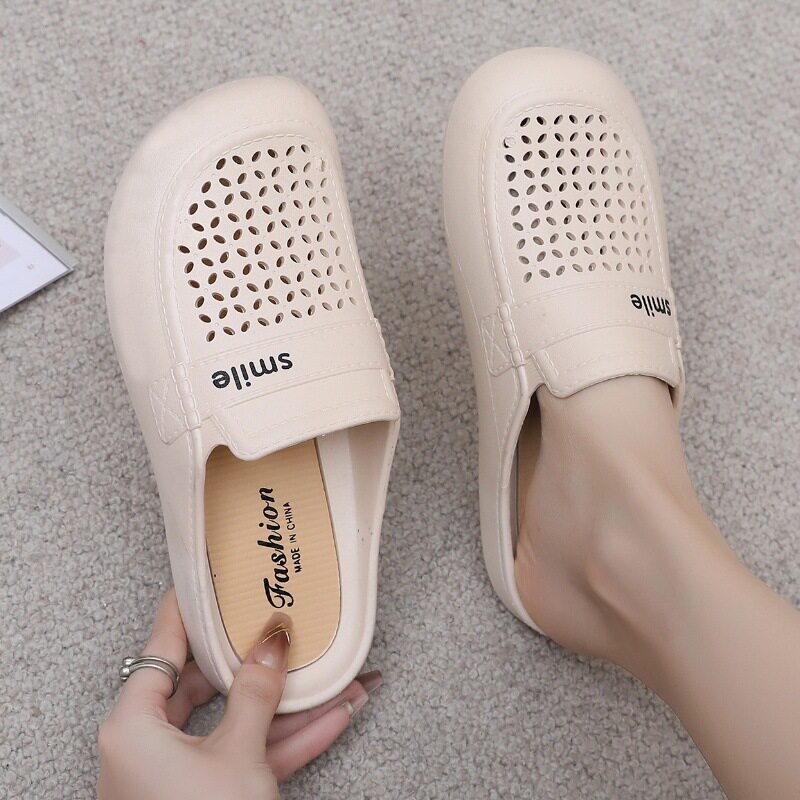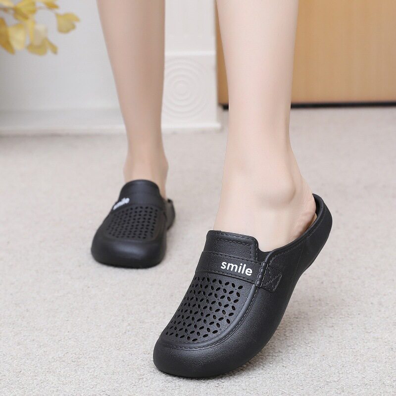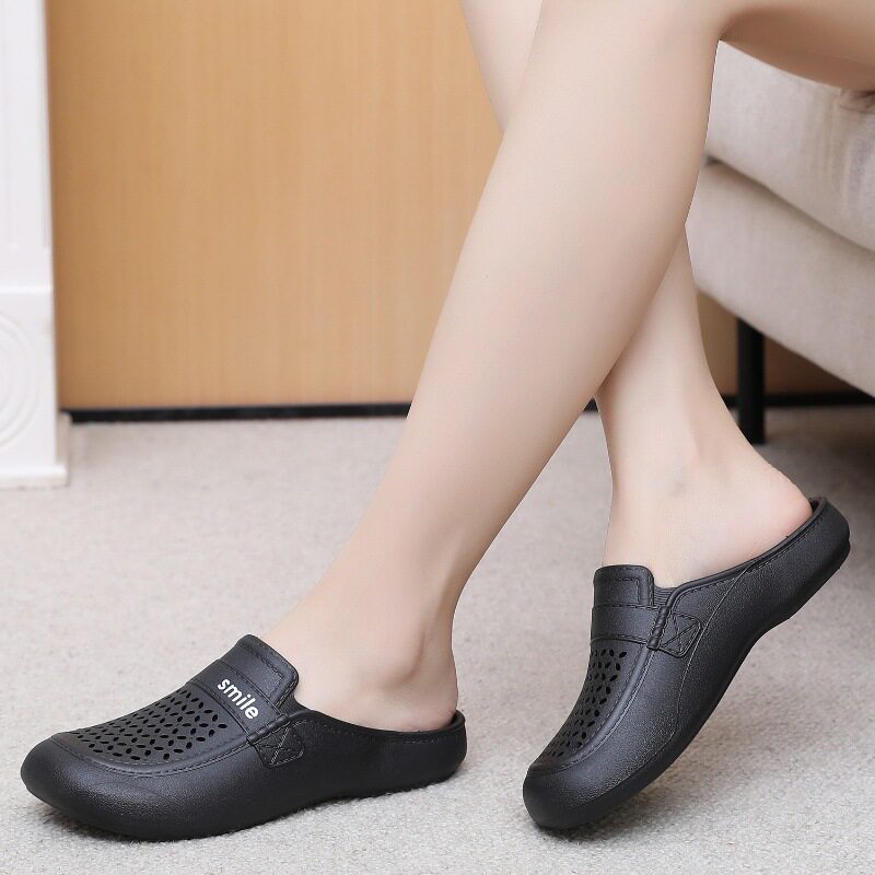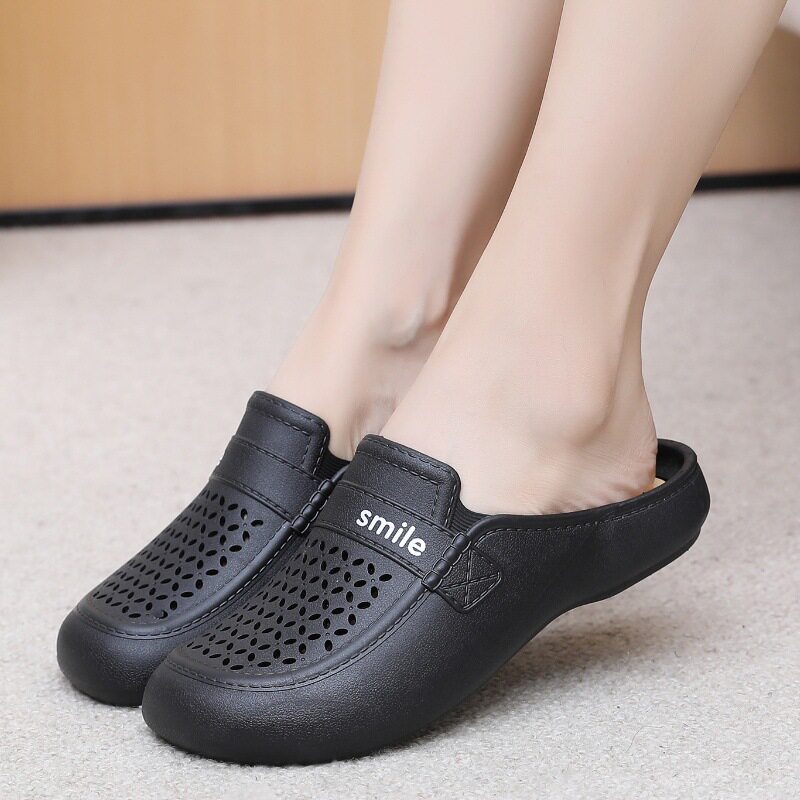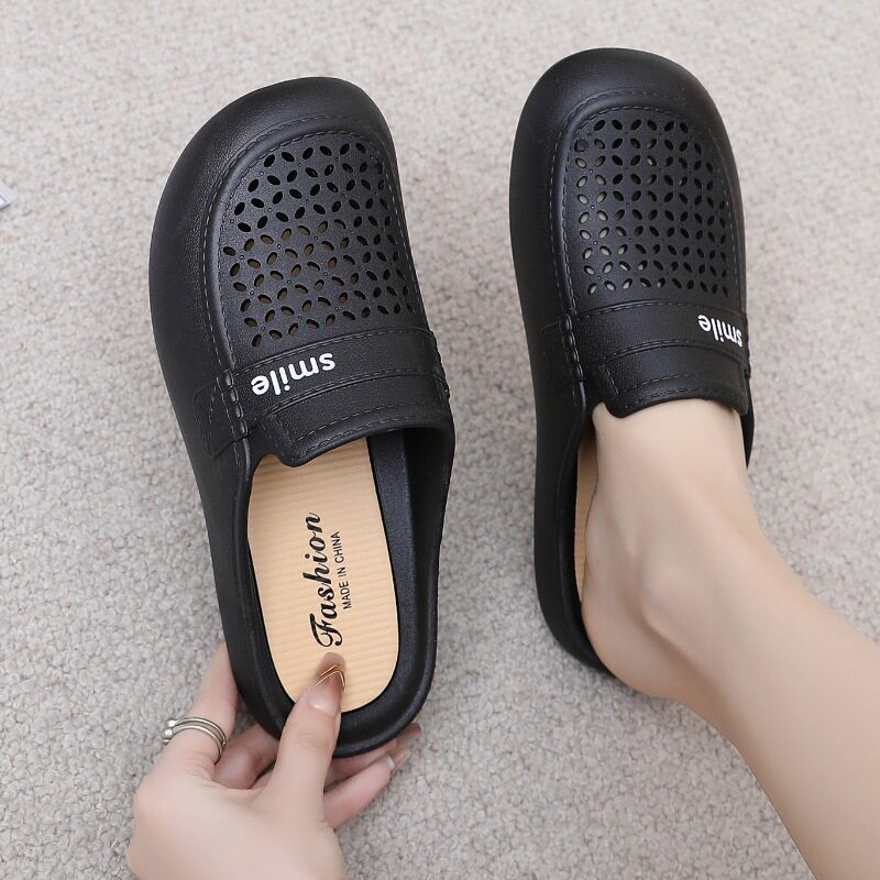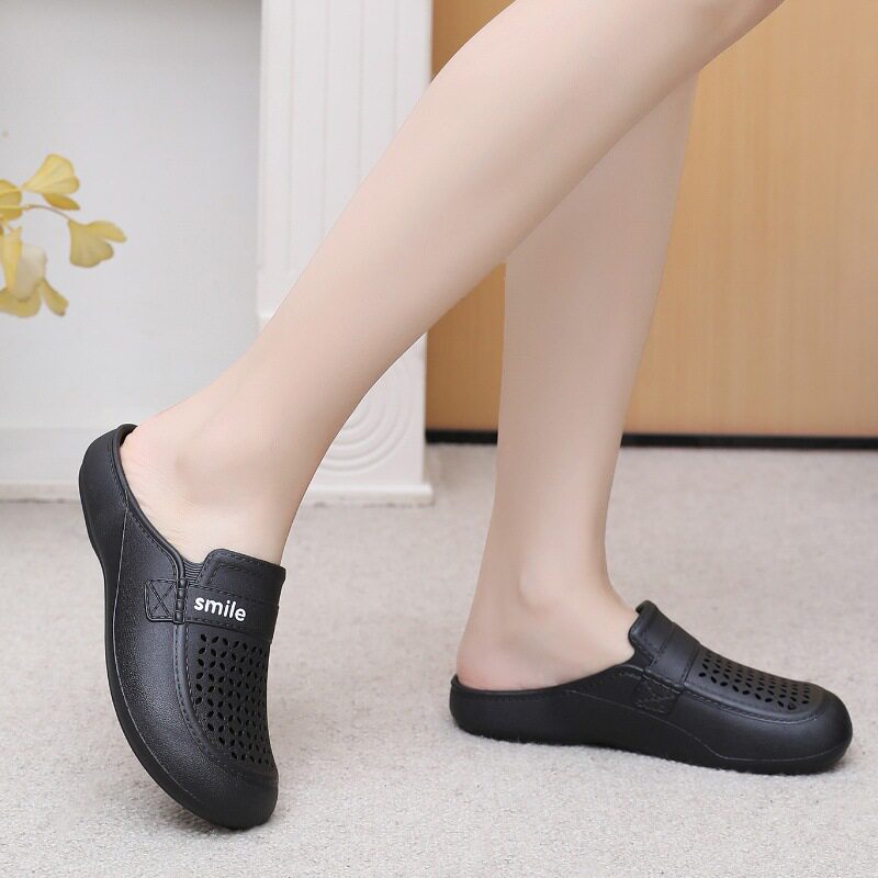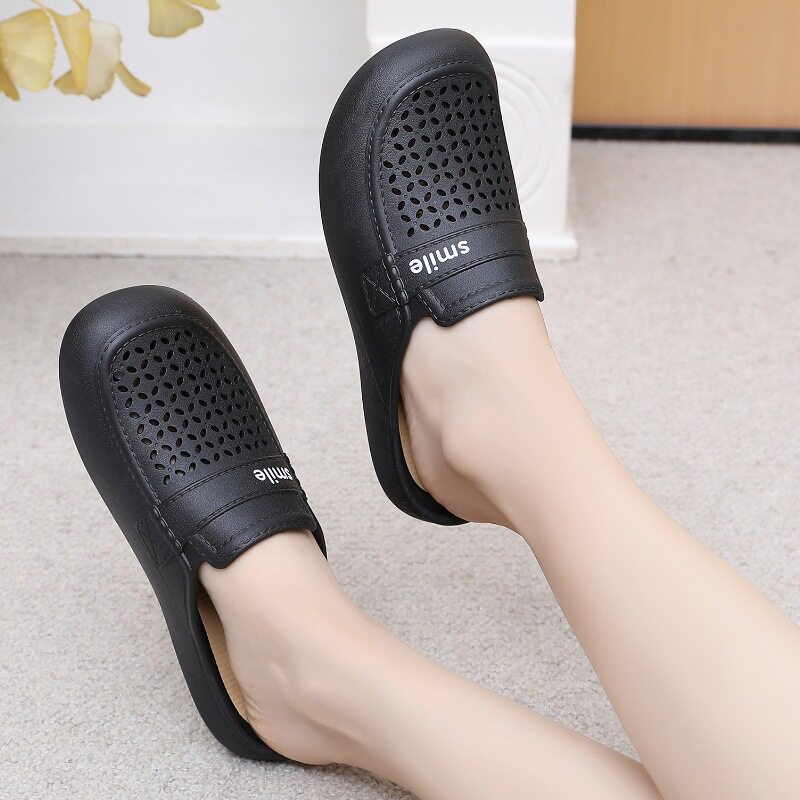 New Flat Non-Slip Middle-Aged Mom Closed-Toe Slippers, Faux Leather Mid-Heel Clogs for Women