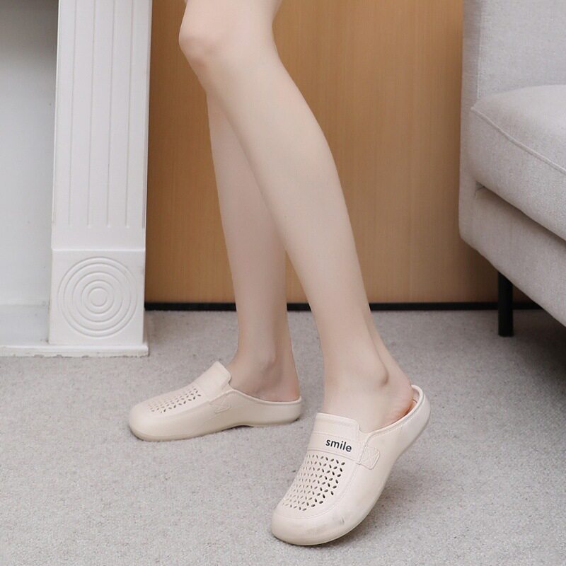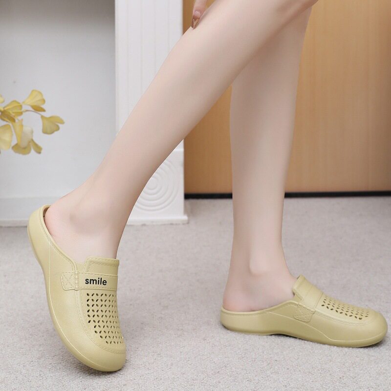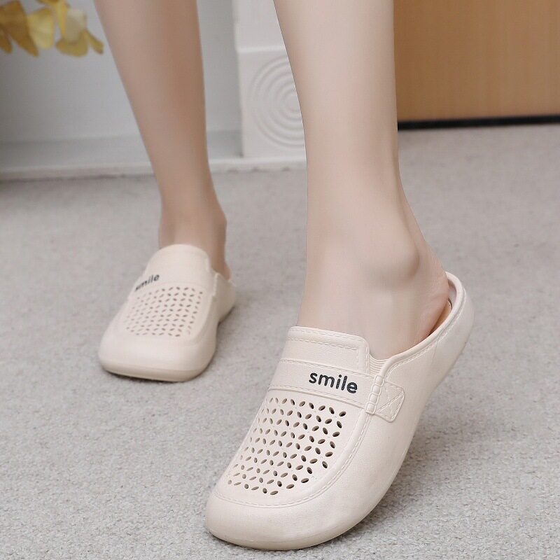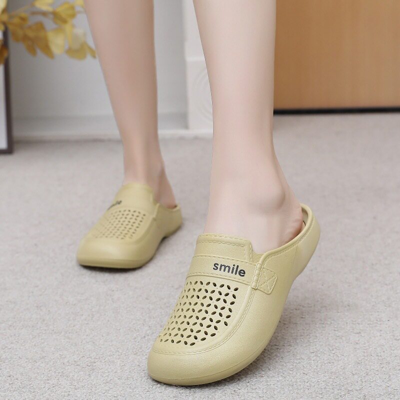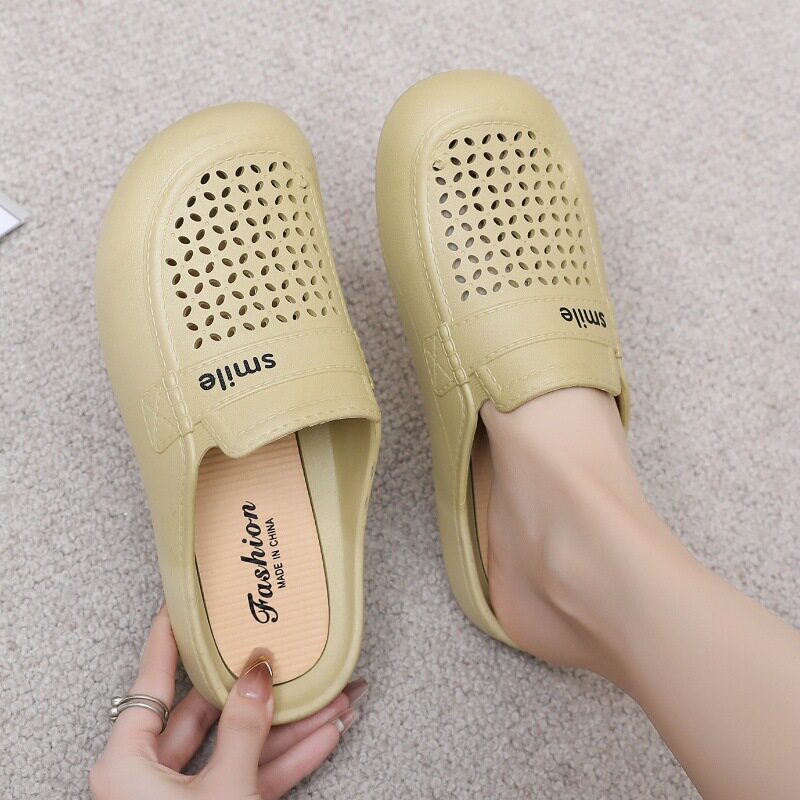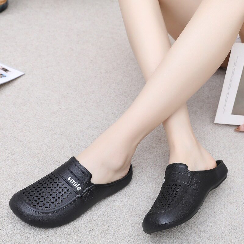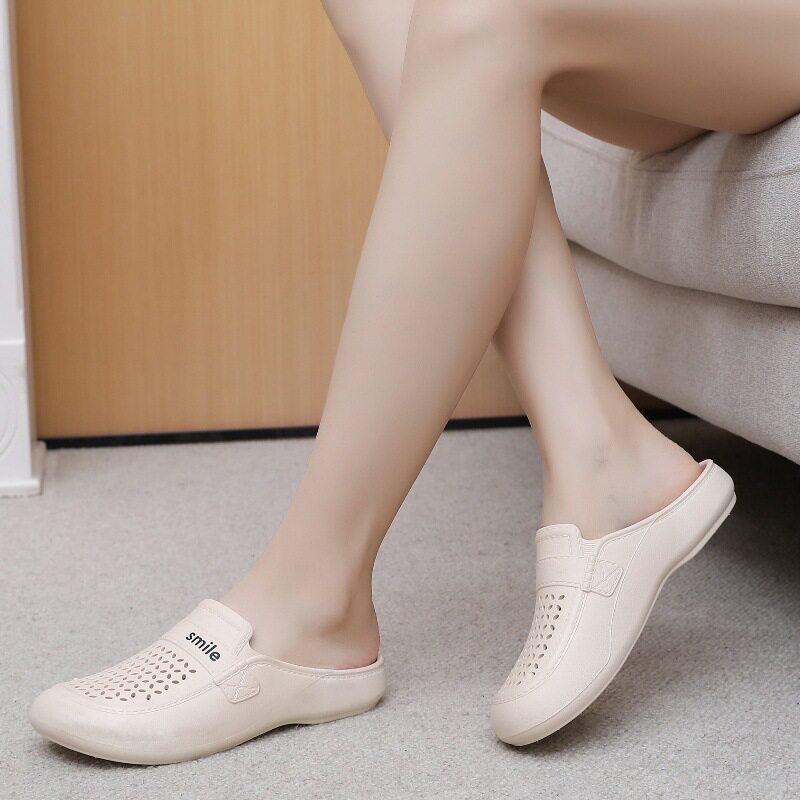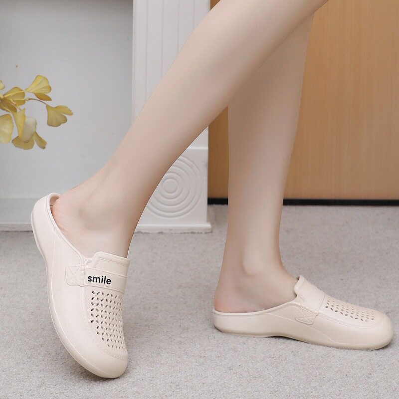 New Flat Non-Slip Middle-Aged Mom Closed-Toe Slippers, Faux Leather Mid-Heel Clogs for Women