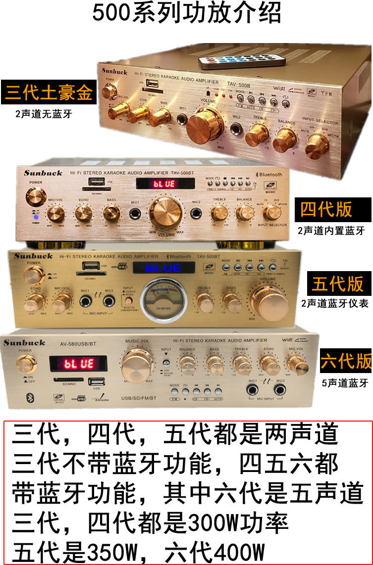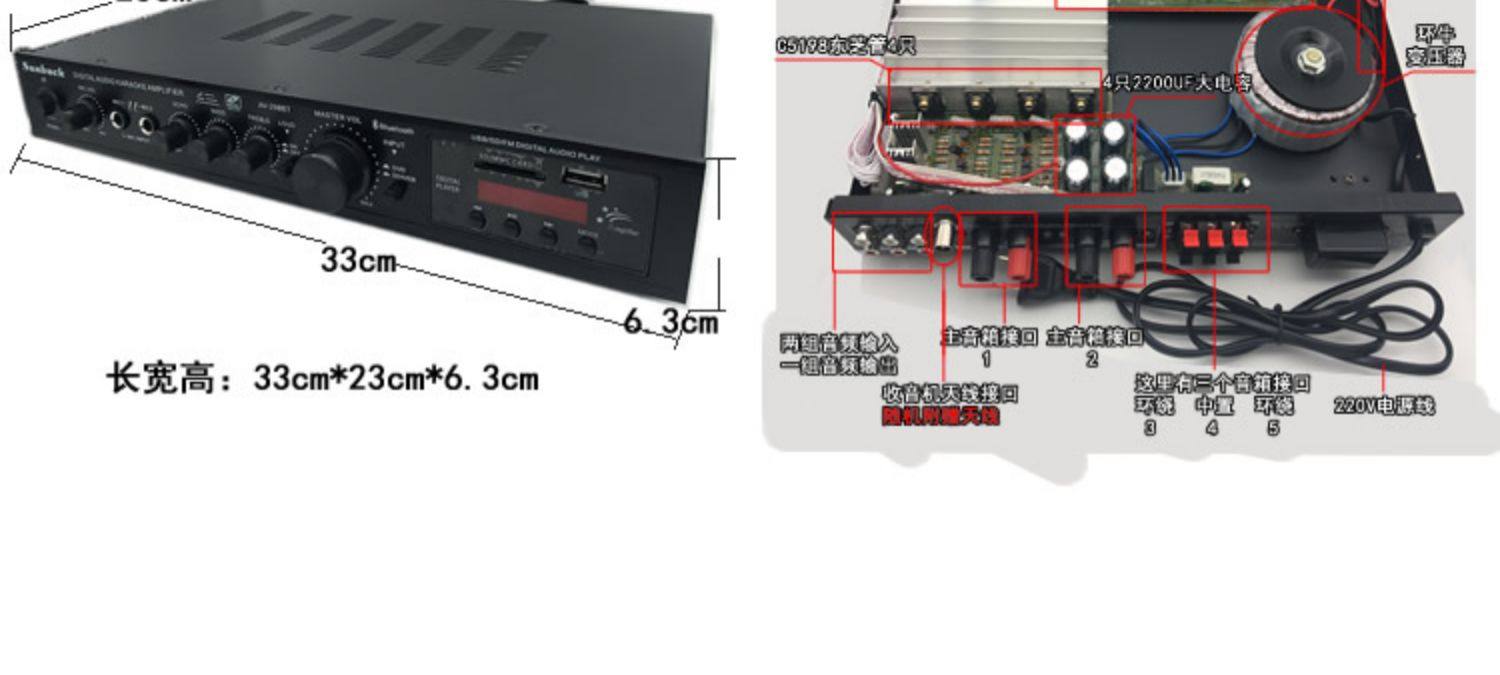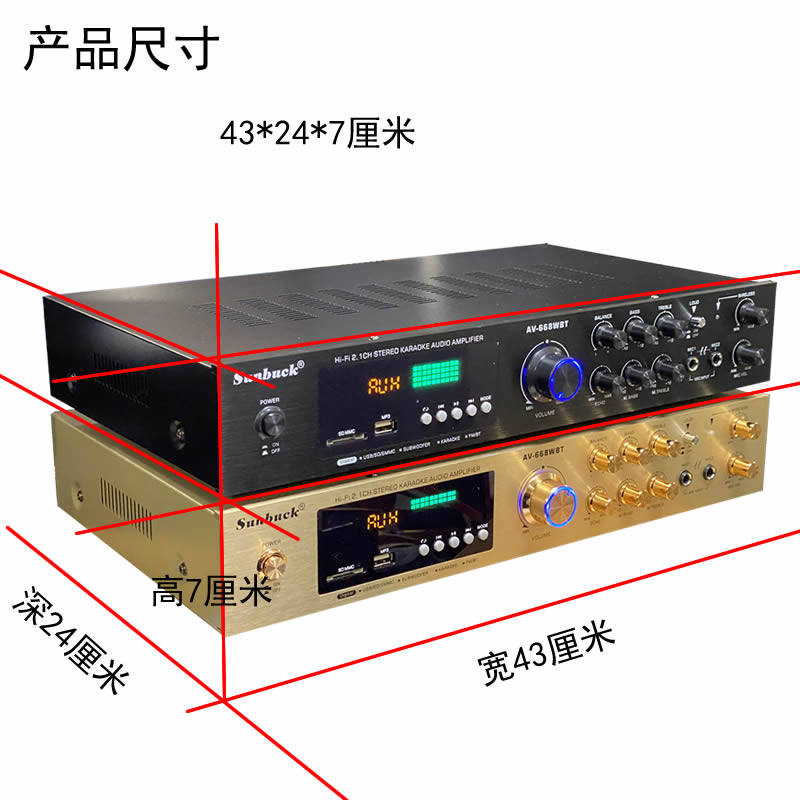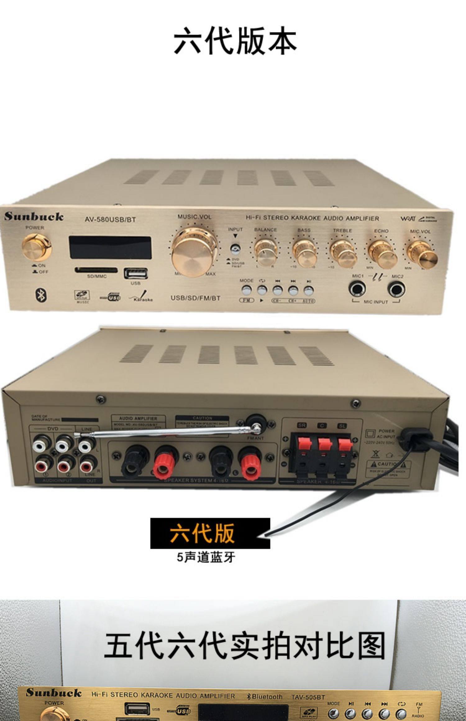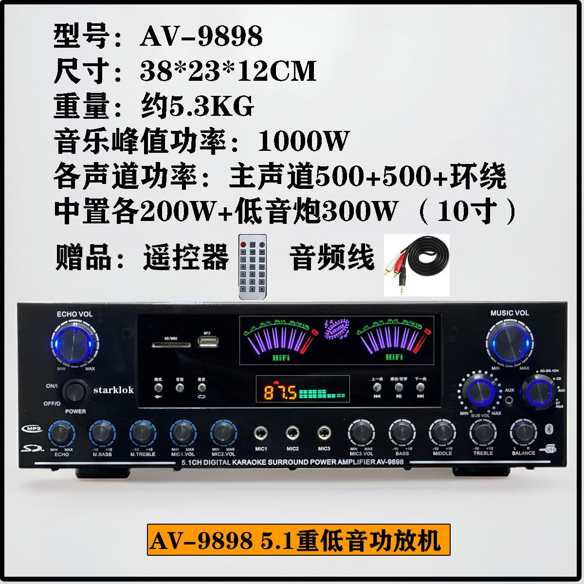 | Color | 338st-400w power amplifier (with bluetooth) comes in random colors,New 338bt gold-500w with screen and left and right balance,New 338bt black-500w with screen and left and right balance,338st-400w (with bluetooth),6th generation 680 black-upgraded large screen optimization line,6th generation 680 gold-upgraded large screen optimization line,Seventh generation gold 298bt-400w (with bluetooth),Seventh generation black 298bt-400w (with bluetooth),Av9898-1000w5.1 independent bass,988bt-8 tube 5.1 independent bass port,Ka8900 mixer amplifier host-1000w,999 fever double bull ultimate edition-1200w,Golden eleventh generation 6399bt-1000w upgraded version,Black eleventh generation 6288-1000w,Gold eleventh generation 6288bt-1000w,The eighth generation 669bt-aluminum alloy panel dynamic screen,Ninth generation 666bt-800w (bluetooth),Tenth generation version 6060-1000w bluetooth,326bt flagship-600w (bluetooth),326z exclusive edition-800w bluetooth,5.1 green screen version-sr8800 independent bass,5.1 independent bass-8 tube large screen 555,5.1 blue screen version-sr8800 independent bass,5.1 red screen version-sr8800 independent bass |