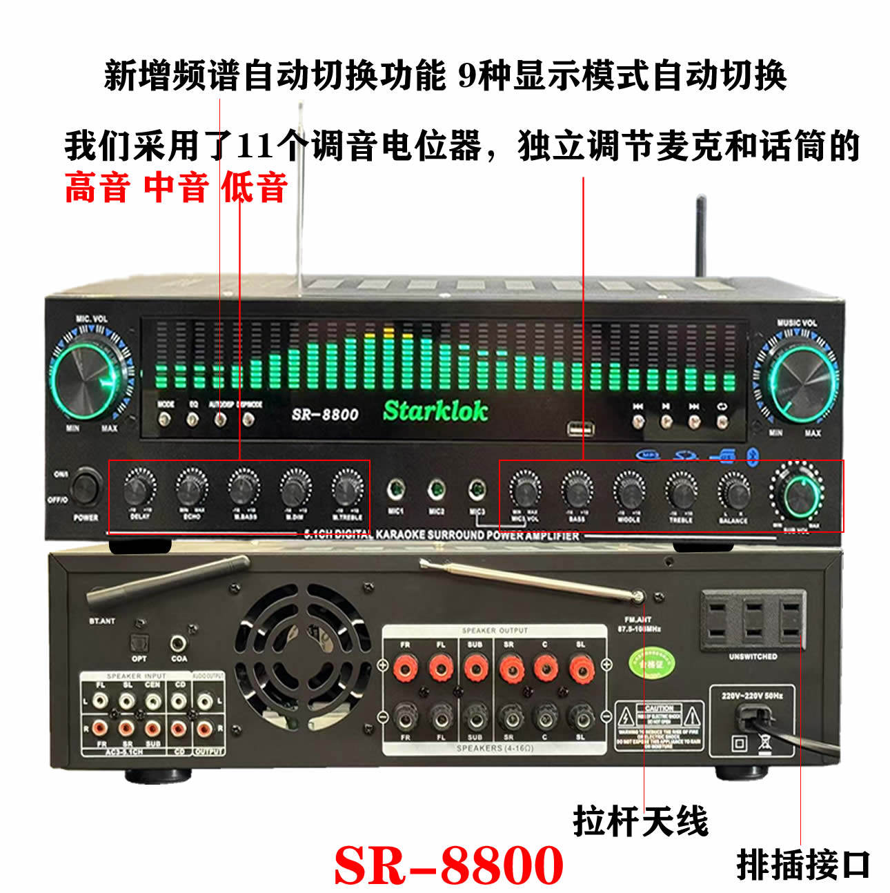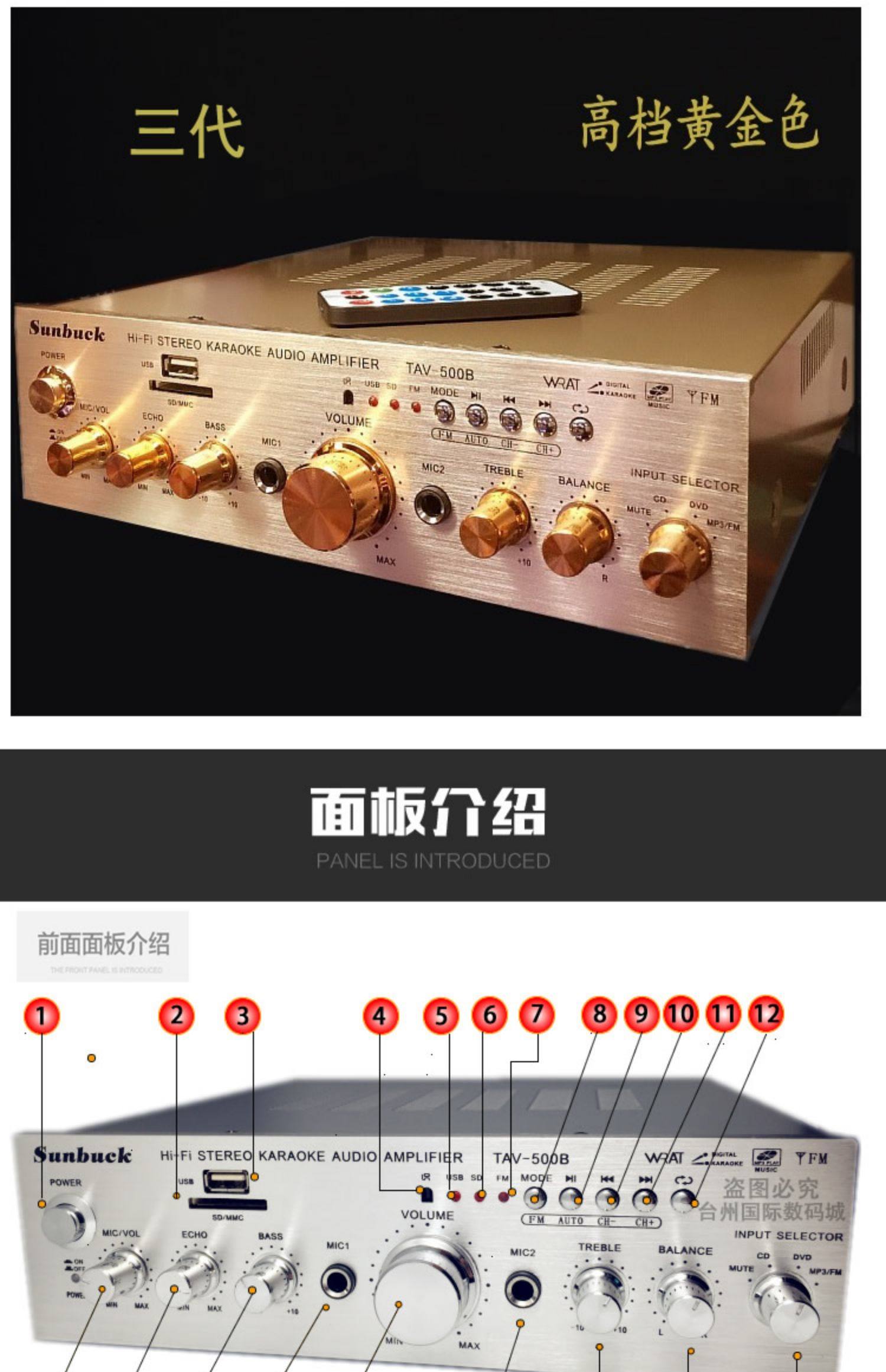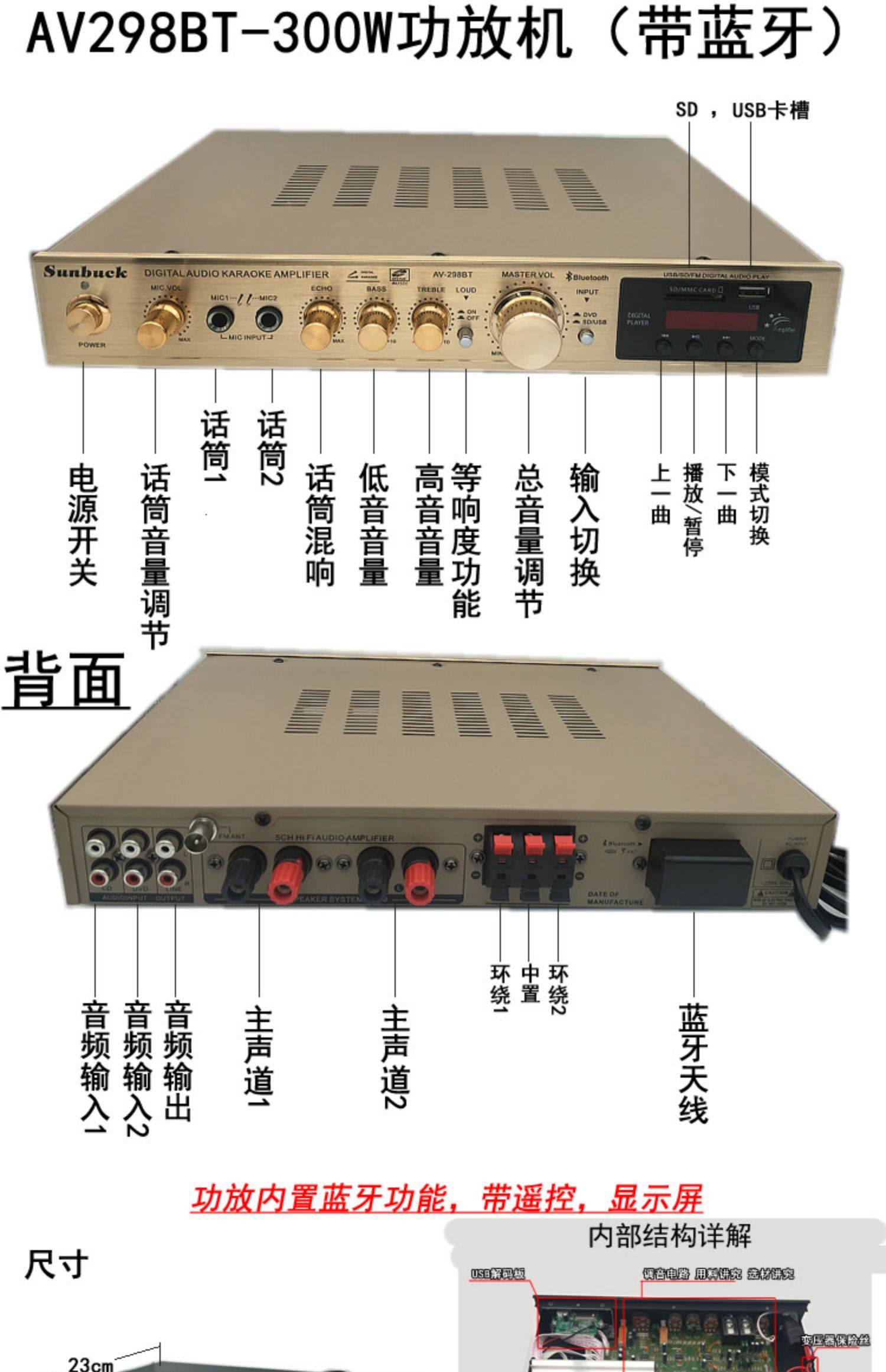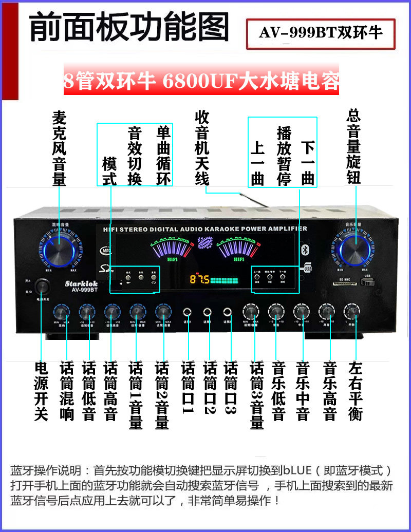 | Color | 338st-400w power amplifier (with bluetooth) comes in random colors,New 338bt gold-500w with screen and left and right balance,New 338bt black-500w with screen and left and right balance,338st-400w (with bluetooth),6th generation 680 black-upgraded large screen optimization line,6th generation 680 gold-upgraded large screen optimization line,Seventh generation gold 298bt-400w (with bluetooth),Seventh generation black 298bt-400w (with bluetooth),Av9898-1000w5.1 independent bass,988bt-8 tube 5.1 independent bass port,Ka8900 mixer amplifier host-1000w,999 fever double bull ultimate edition-1200w,Golden eleventh generation 6399bt-1000w upgraded version,Black eleventh generation 6288-1000w,Gold eleventh generation 6288bt-1000w,The eighth generation 669bt-aluminum alloy panel dynamic screen,Ninth generation 666bt-800w (bluetooth),Tenth generation version 6060-1000w bluetooth,326bt flagship-600w (bluetooth),326z exclusive edition-800w bluetooth,5.1 green screen version-sr8800 independent bass,5.1 independent bass-8 tube large screen 555,5.1 blue screen version-sr8800 independent bass,5.1 red screen version-sr8800 independent bass |