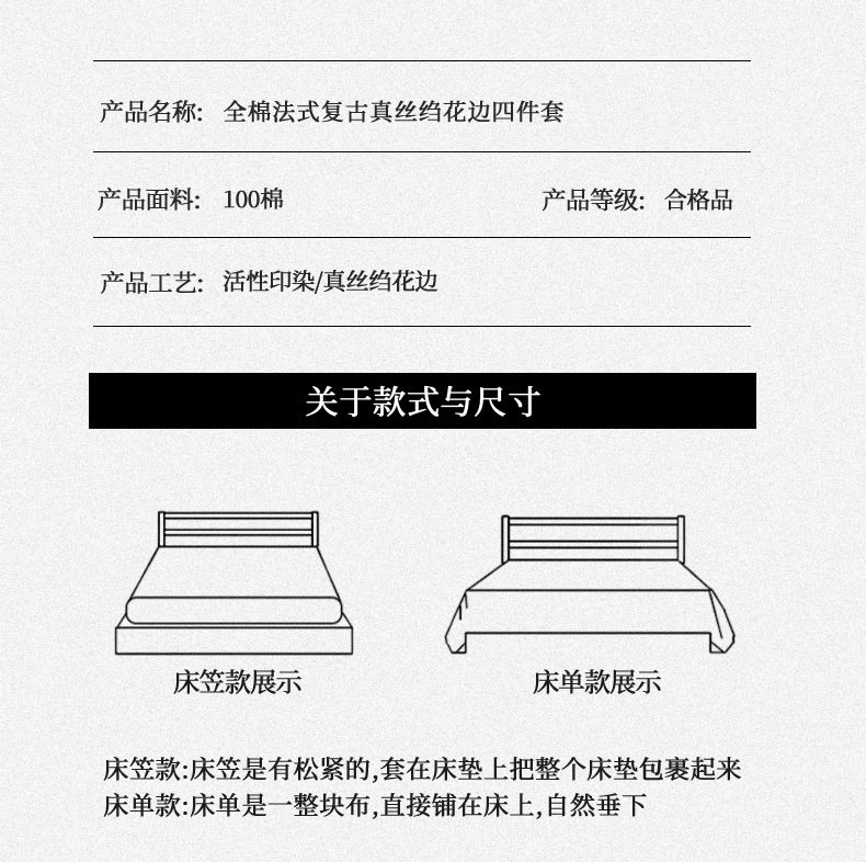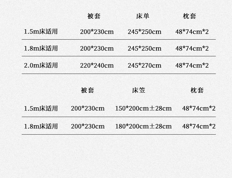 | Dimensions | 1.2m bed sheet three-piece set [quilt cover 150*200cm],1.5m bed sheet four-piece set [quilt cover 200*230cm],1.8m bed sheet four-piece set [quilt cover 200*230cm],2.0m bed sheet four-piece set [quilt cover 220*240cm],1.5m fitted sheet set of four [quilt cover 200*230cm],1.8m fitted sheet set of four [quilt cover 200*230cm] |