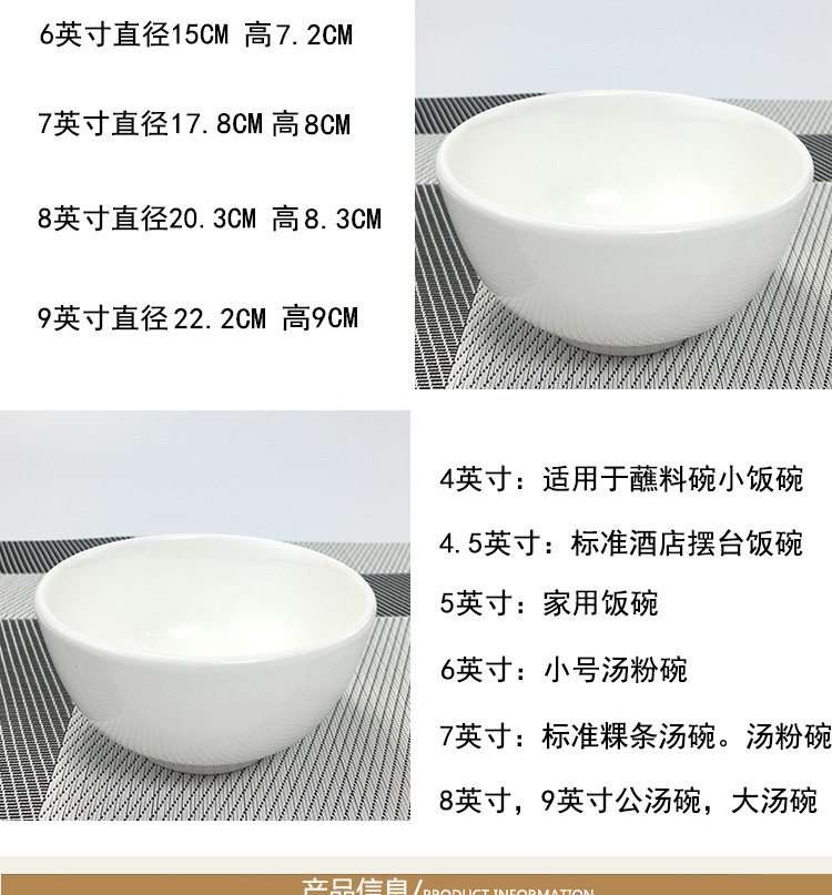 Pure White Ceramic Rice Bowl for Restaurants, Hotels, and Dining Establishments; Small Soup Bowl, Noodle Bowl, Rice Noodle Soup Bowl, Large Noodle Bowl, Household Anti-Scalding