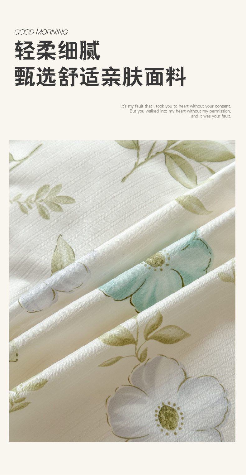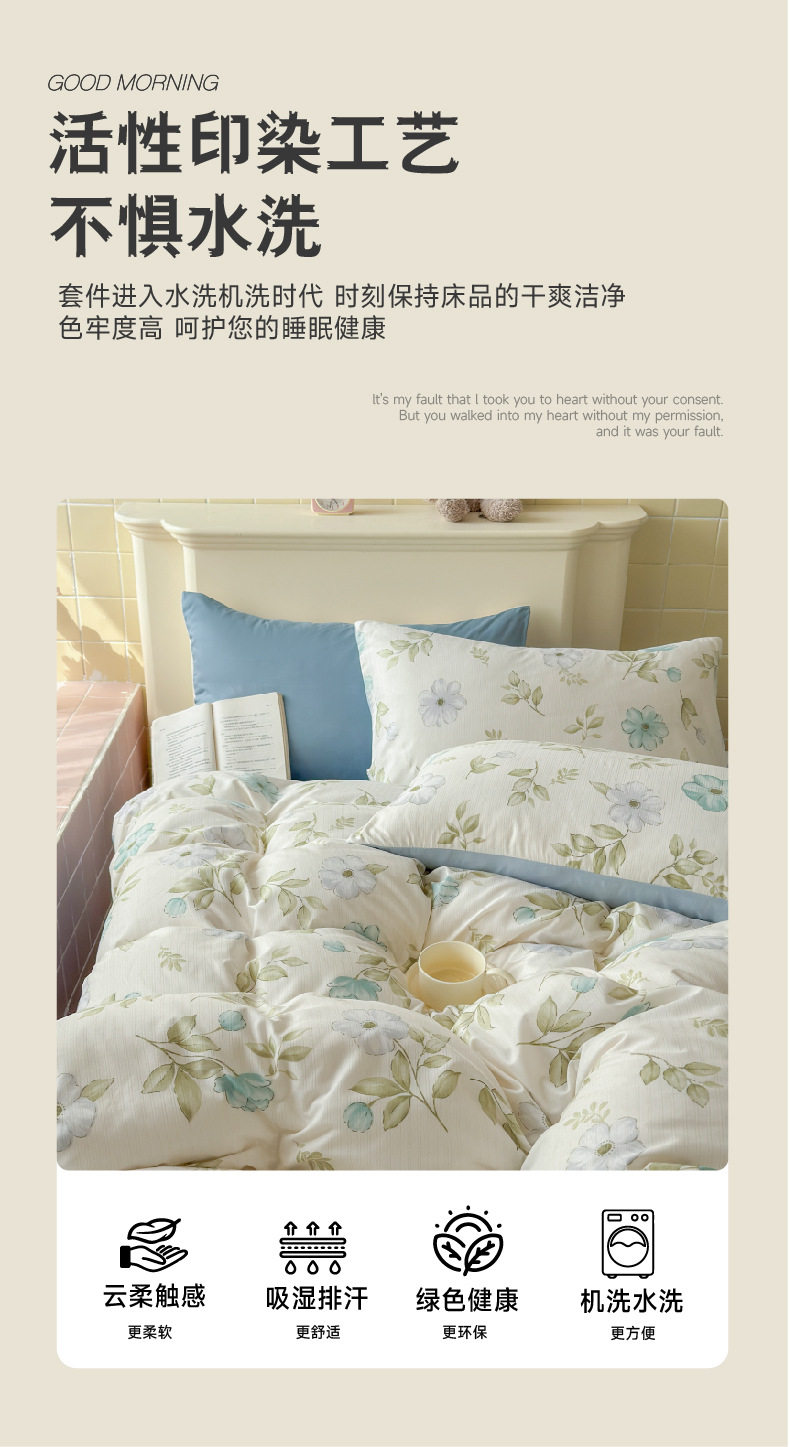 | Dimensions | 1.2 bed sheets three-piece quilt cover 150*200,1.5-sheet four-piece quilt cover 150*200,1.8-sheet four-piece quilt cover 180*220,2.0 bed sheet four-piece quilt cover 200*230,2.2 bed sheets four-piece quilt cover 220*240,Quilt cover single piece 150*200,Quilt cover single piece 180*220,Quilt cover single piece 200*230 |
