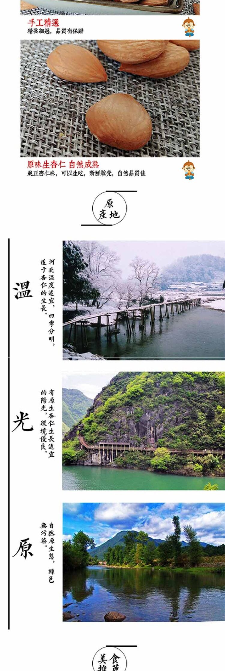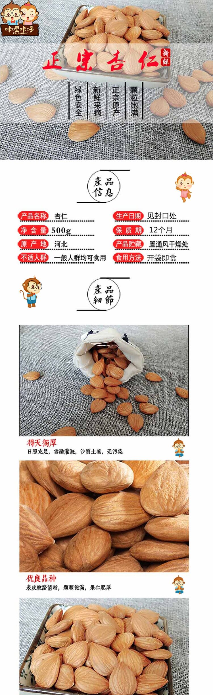 | Packaging specifications | 500g (raw almonds),500g (cooked almonds),200g (raw almonds),200g (cooked almonds) |