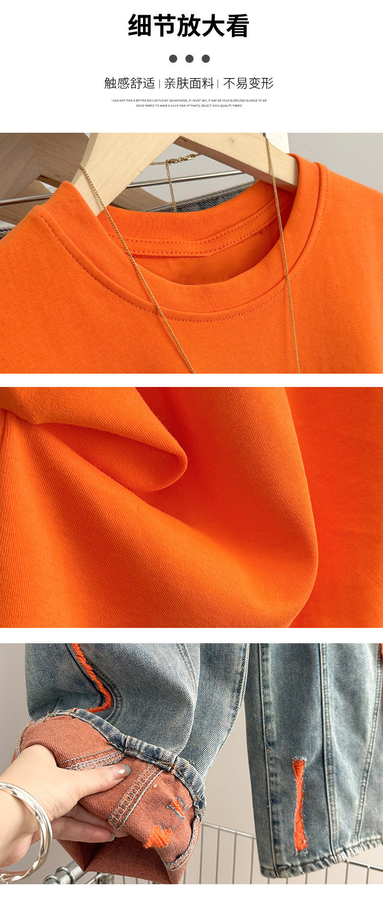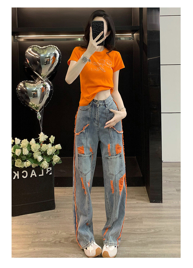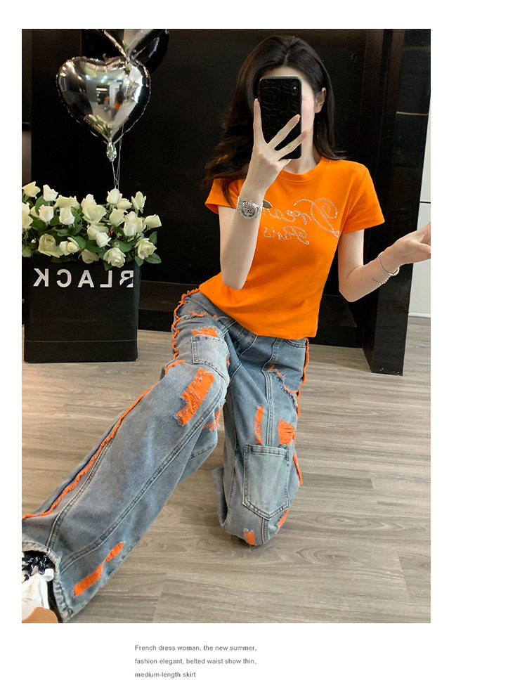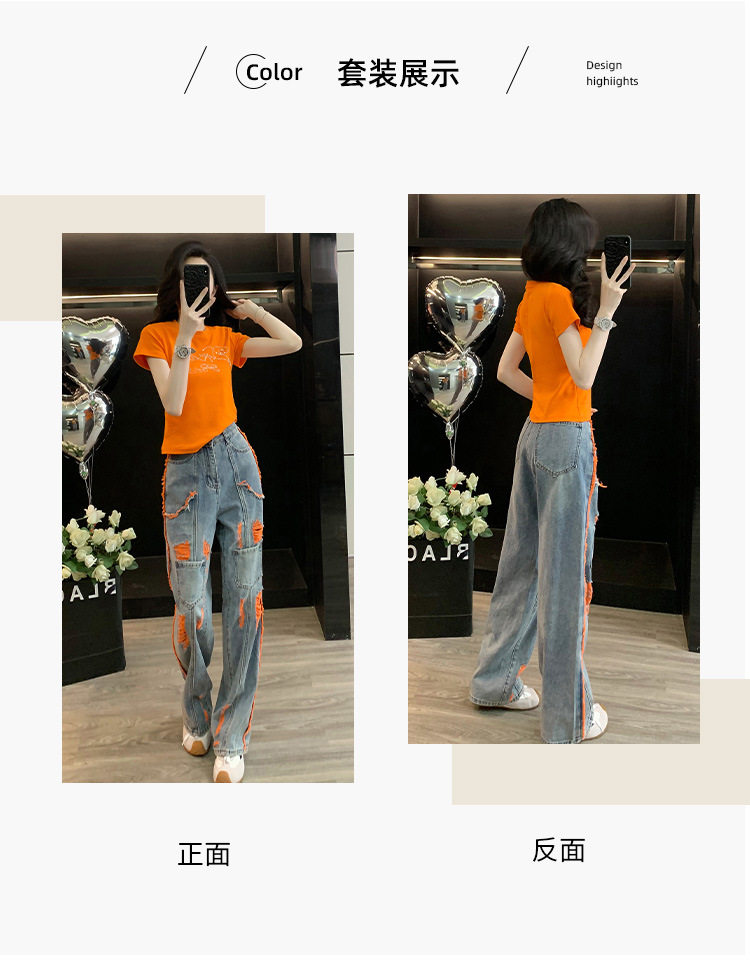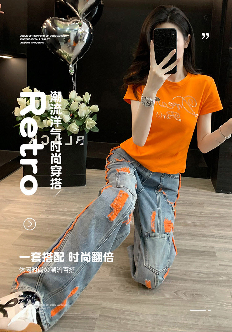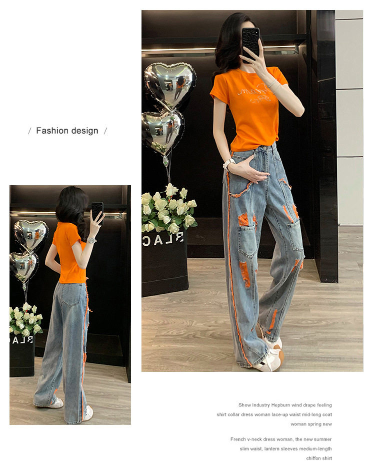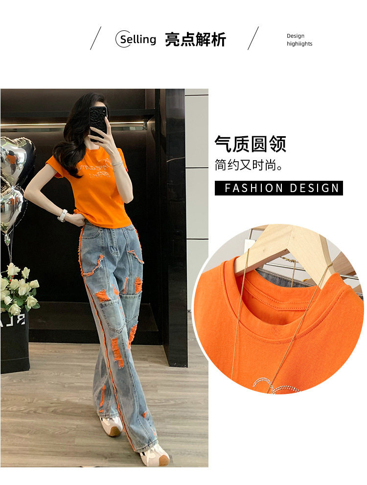 Street-Style Short-Sleeved T-Shirt Fashion Suit for Women Summer New Slim-Fitting Short Fashionable Jeans Orange Edge Two-Piece Set