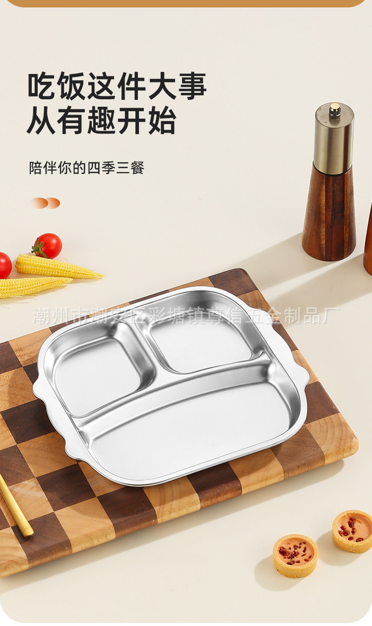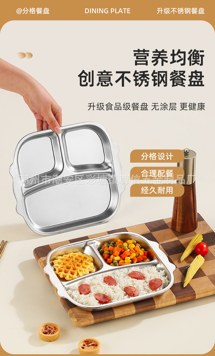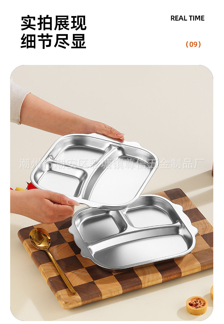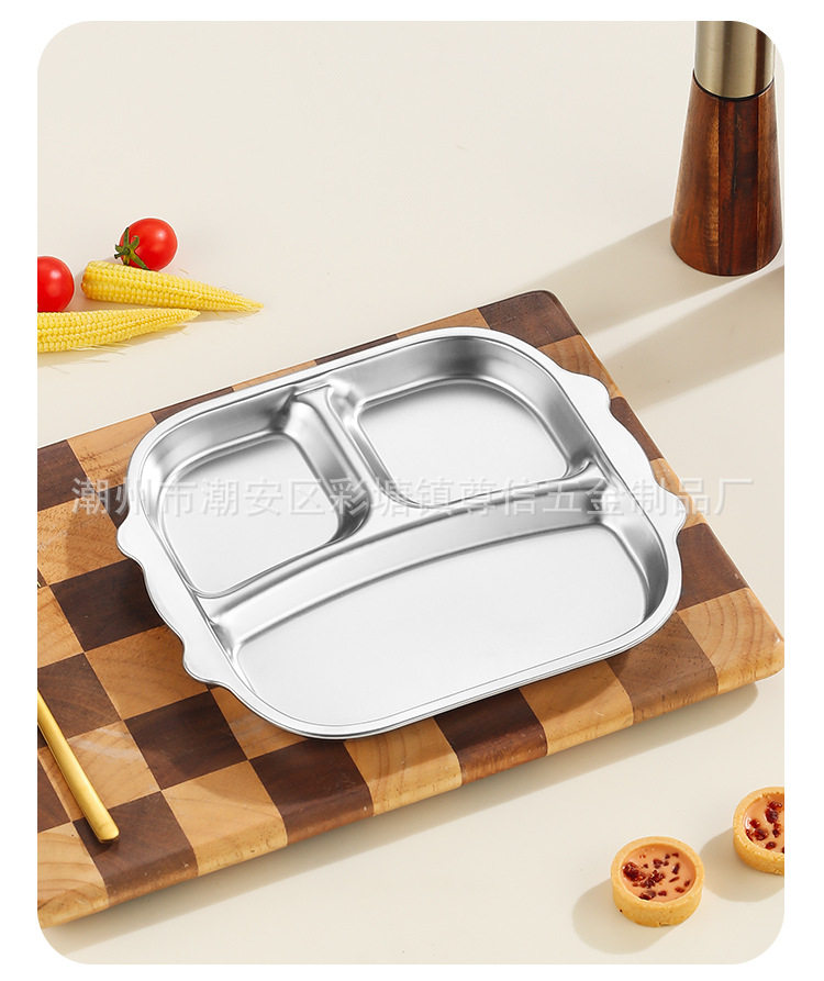 Temu Cross-Border Direct Sales 304 Stainless Steel Fat-Reducing Plate Double-Eared Square Three-Compartment Plate Household Quantitative Divided Meal Plate