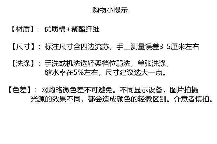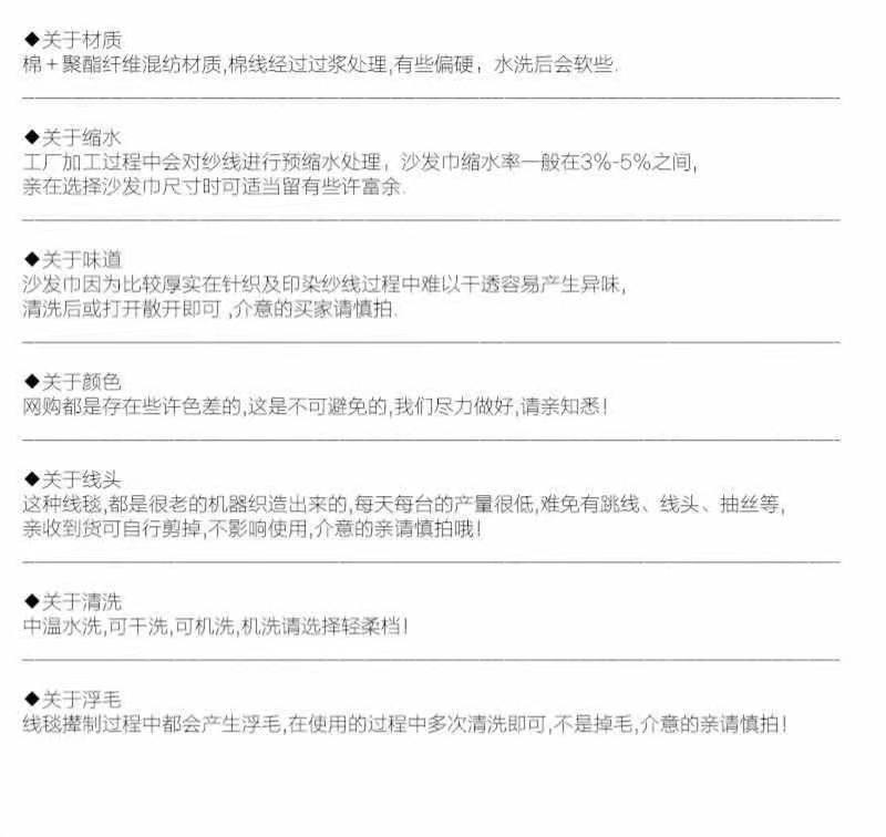| Size | 90*90cm small square towel,90*150cm only covers the seat cushion,90*180cm only covers the seat cushion,90*210cm only covers the seat cushion,90*240cm can be used as bed towel,180*130cm small single full cover,180*180cm tiger chair full cover,180*230cm small double full cover,180*260cm double or imperial concubine full cover,180*300cm three-person full cover,180*340cm large three-person full cover,180*380cm four persons full cover |