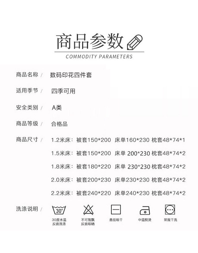 | Dimensions | 0.9—1.2m bed sheet three-piece set [quilt cover 150x200 sheets 160x230 pillowcase],1.5m bed sheet four-piece set [quilt cover 150x200 sheets 200x230 pillowcases two],1.8m bed sheet four-piece set [quilt cover 180x220 sheets 230x230 pillowcases two],2.0m bed sheet four-piece set [quilt cover 200x230 sheets 230x230 pillowcases two],150x200cm [single quilt cover],180x220cm [single quilt cover],200x230cm [single quilt cover] |