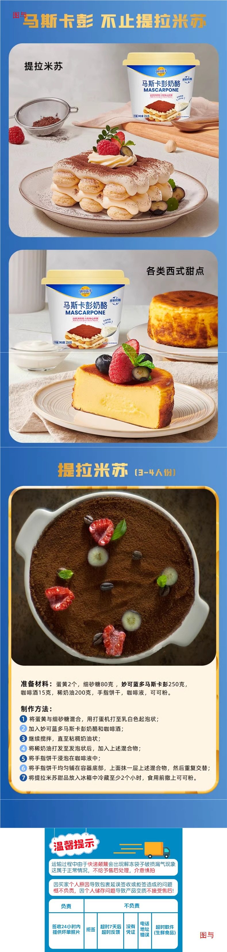 | Packaging specifications | Mascarpone 250g,Mascarpone 250g*2 boxes,Mascarpone 500g,Mascarpone 500g*2 boxes |