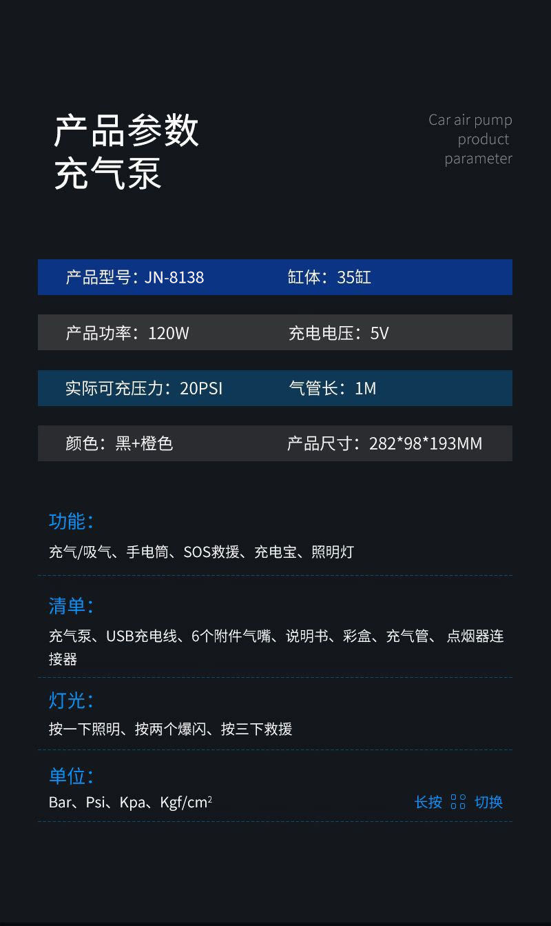 | Additional features | Lighting,Tire pressure gauge,Warning light |