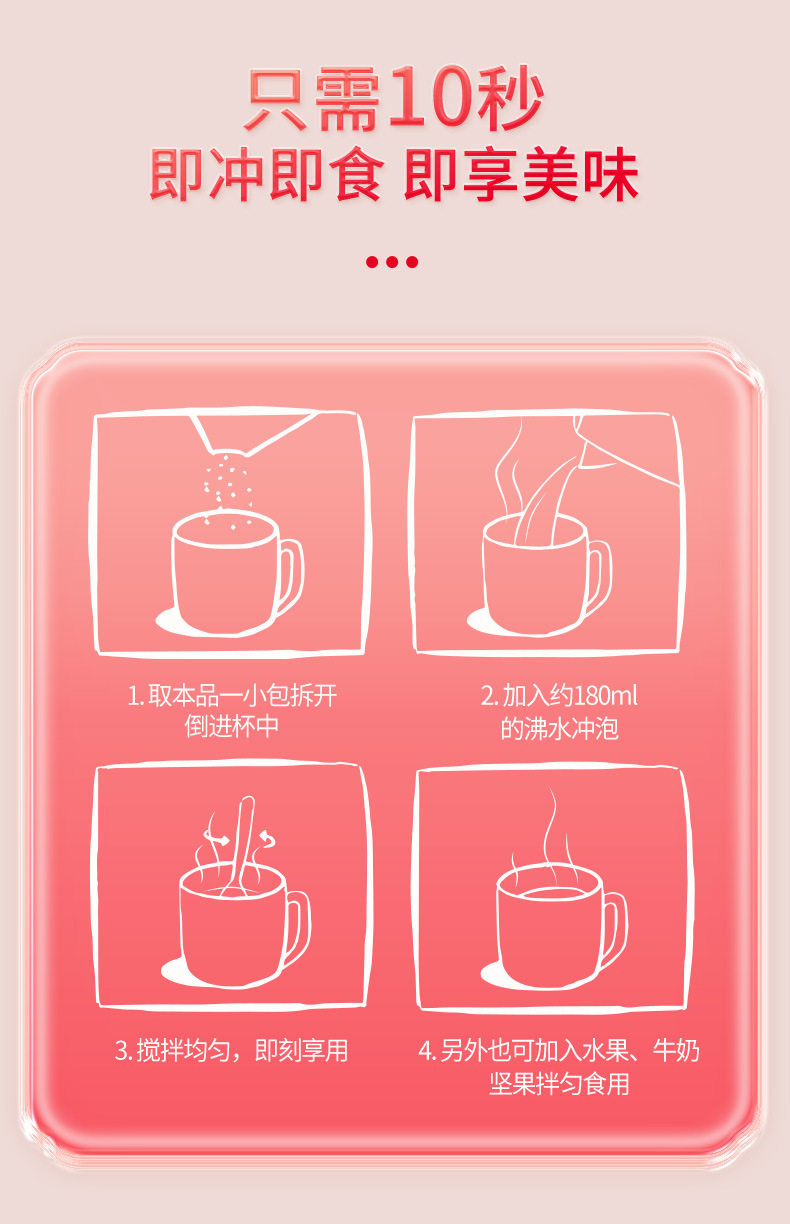 | How to eat | Take a small package of this product, open it and pour it into a cup, add about 180 ml of boiling water, stir evenly, and then eat |