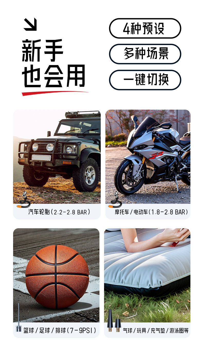 | Additional features | Lighting,Tire pressure gauge,Usb charging |