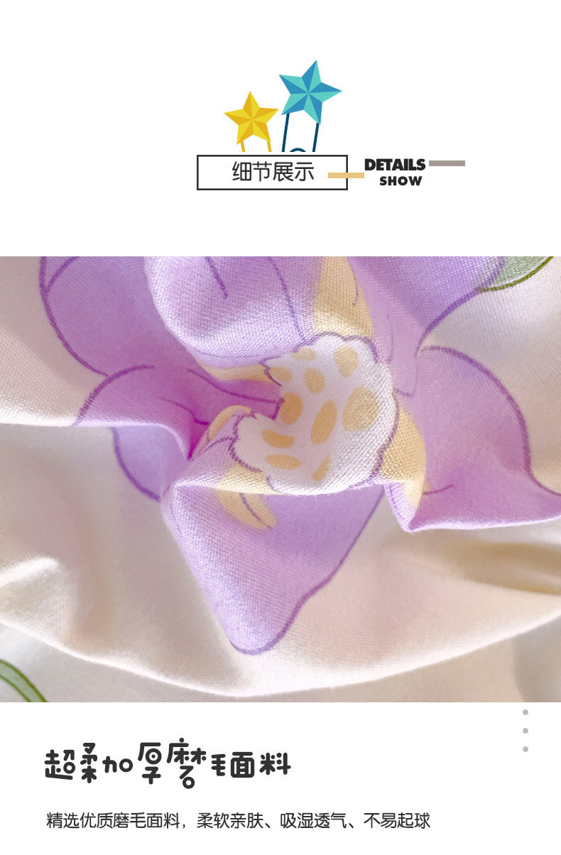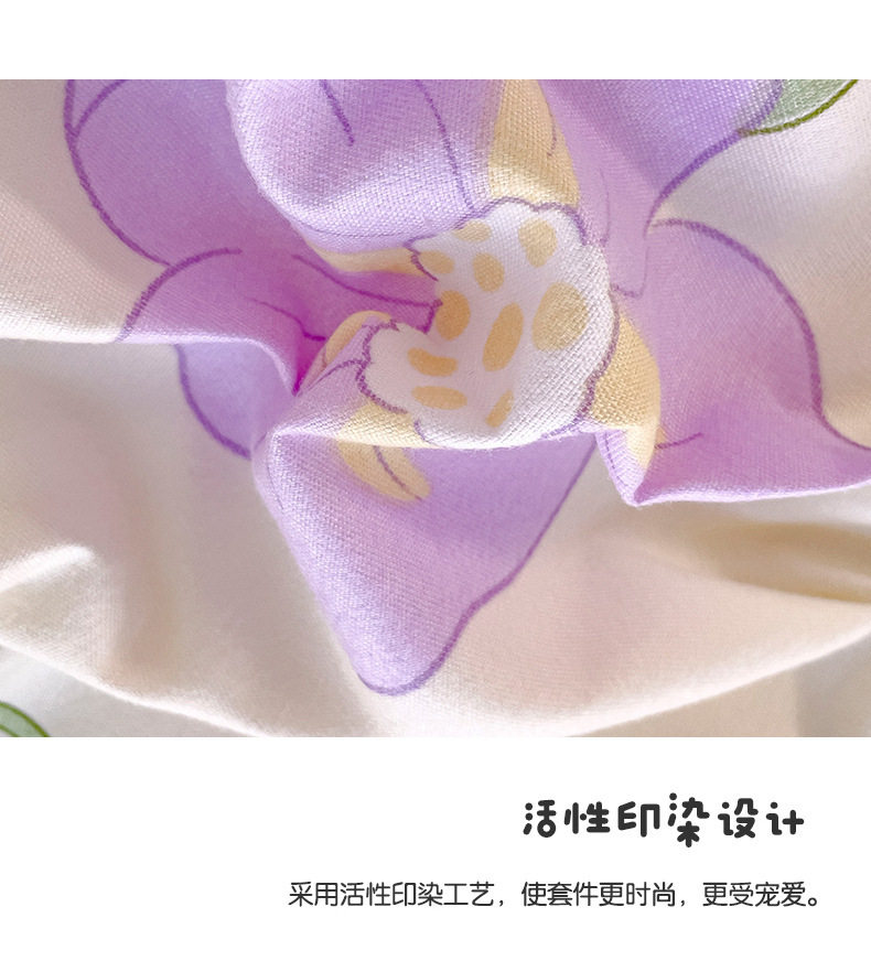 | Dimensions | 1.5m piece set [quilt cover 150*200cm, bed sheet 160*230cm, pillowcase 48*74cm*1],1.9m piece set [quilt cover 150*200cm bed sheet 200*230cm pillowcase 48*74cm*2],2.2m piece set [quilt cover 180*220cm bed sheet 230*230cm pillowcase 48*74cm*2],2.4m piece set [quilt cover 200*230cm sheets 230*230cm pillowcase 48*74cm*2],Single quilt cover [150*200cm],Single quilt cover [180*220cm],Single quilt cover [200*230cm] |