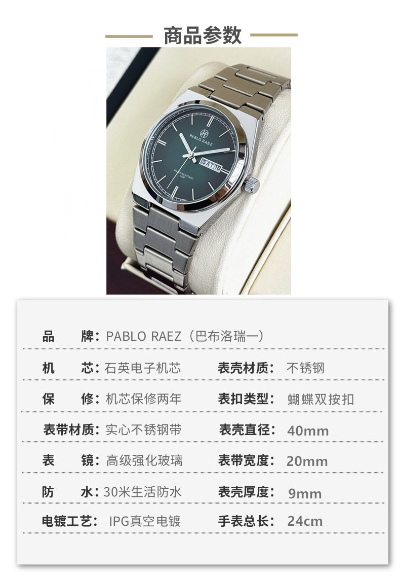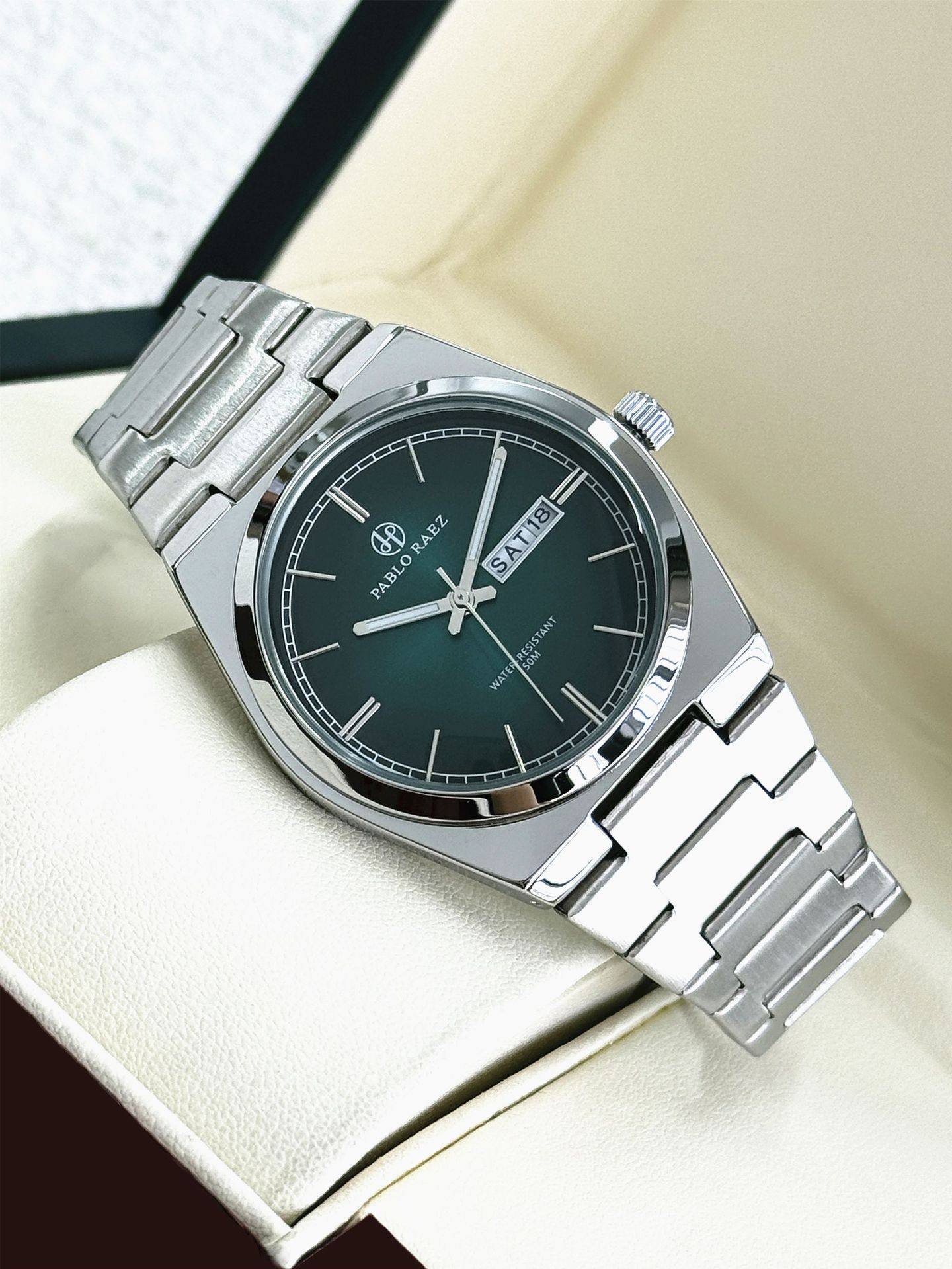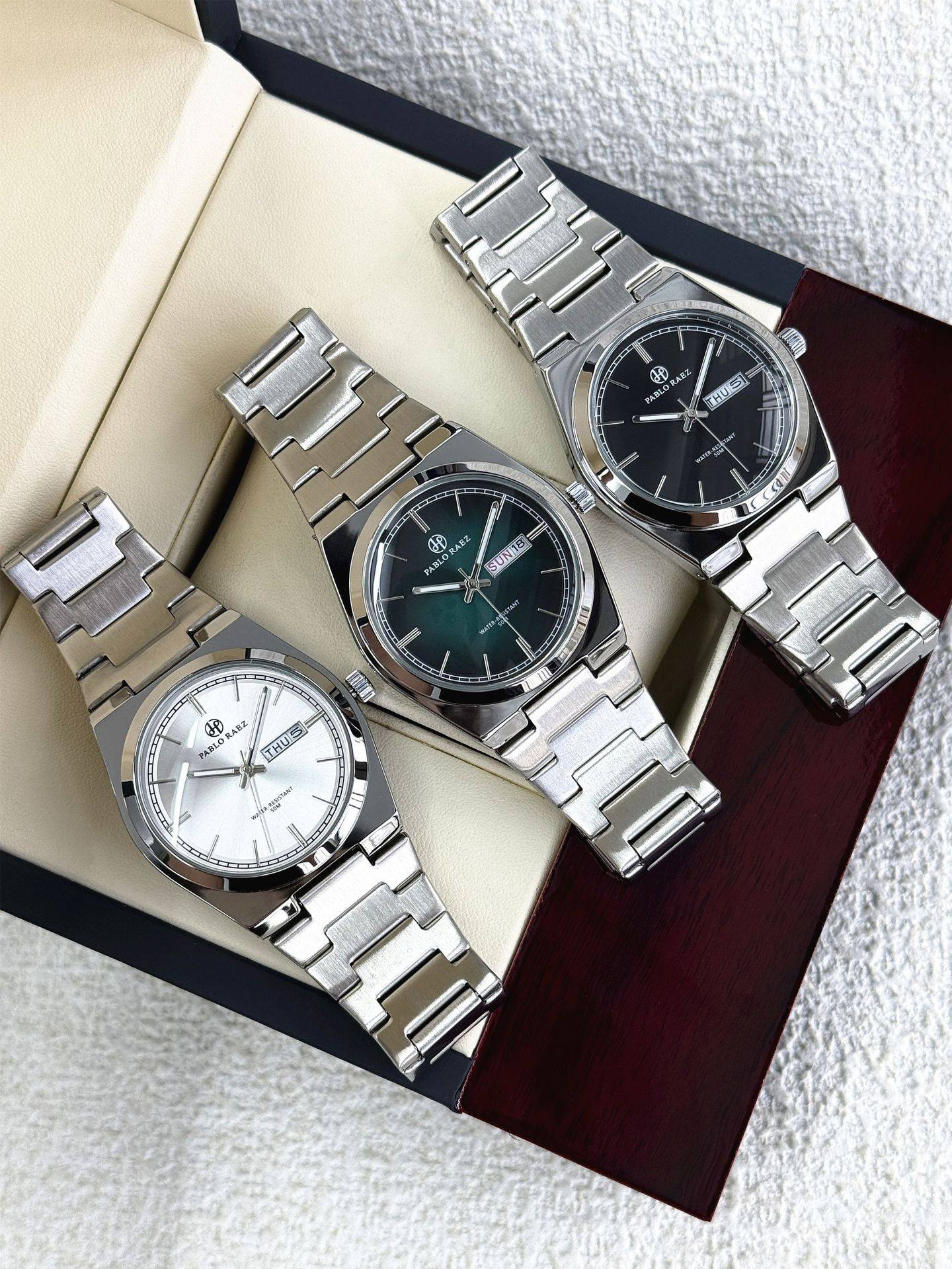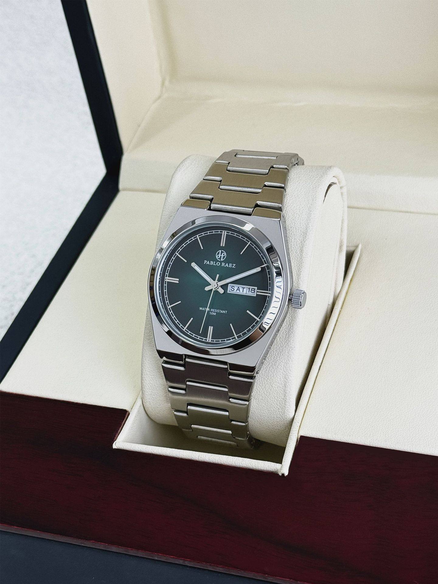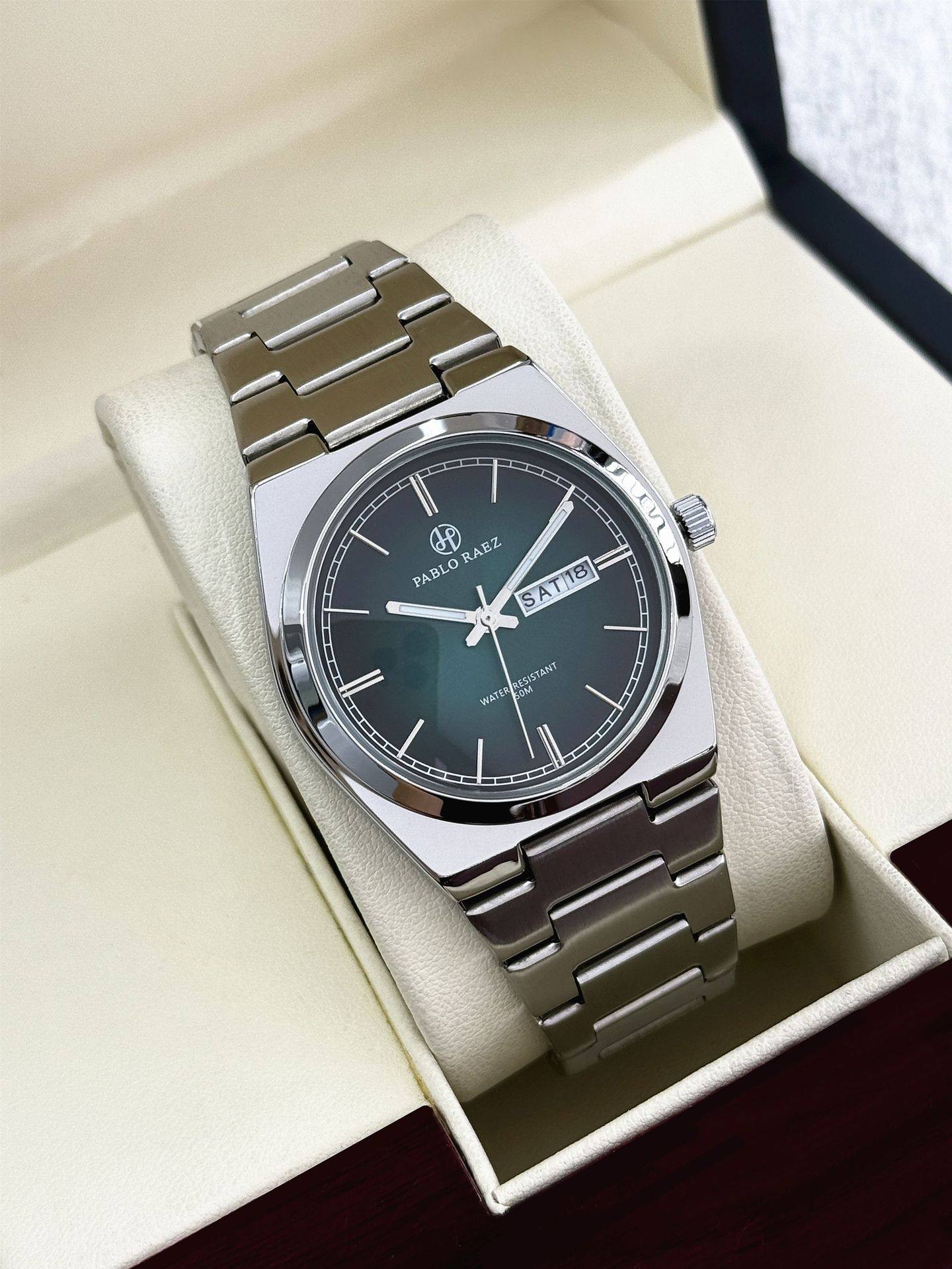 New Pablo Raez Steel Band Men's Watch with Gradient Green Dial, Butterfly Clasp, Dual Calendar, Cross-Border Hot Sale P36