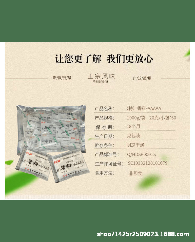 | Packaging specifications | Kitchen seasoning (special) spices-aaaaa20g*4 packs,Kitchen seasoning (special) spices-aaaaa20g*10 packs,Kitchen seasoning (special) spice aaaaa 20g*50 packs |