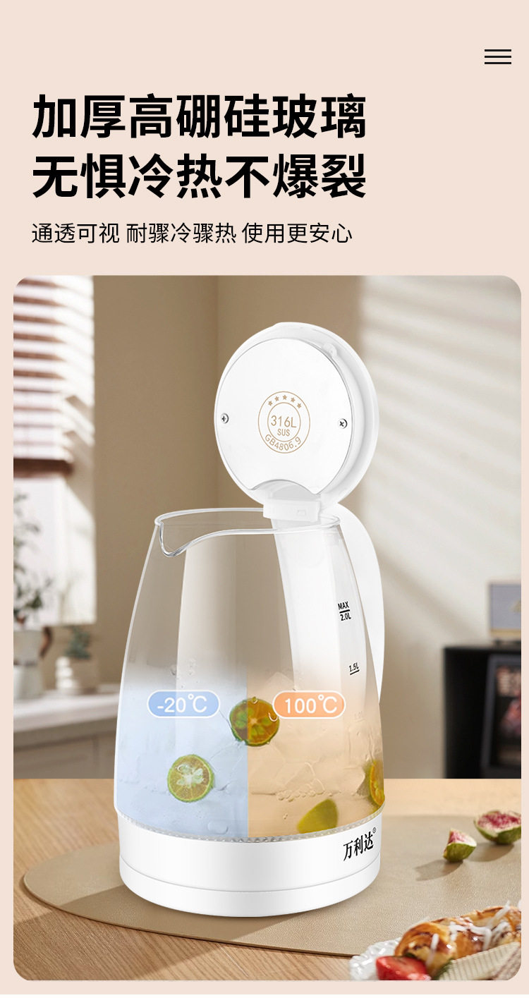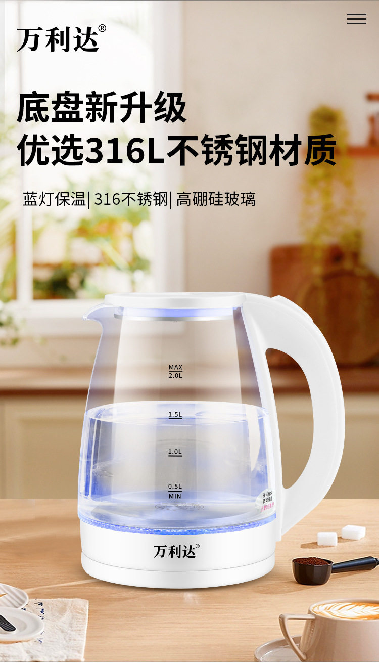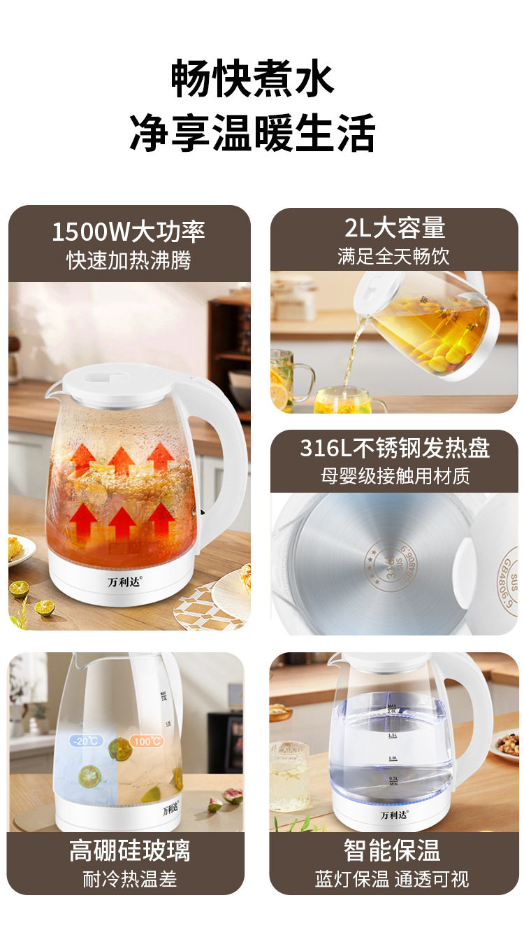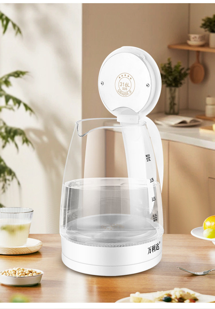 Wanlida Electric Water Kettle Household Gaopeng Glass 316 Stainless Steel Water Kettle Thermal Insulation Integrated Automatic Power Off 2 Liters