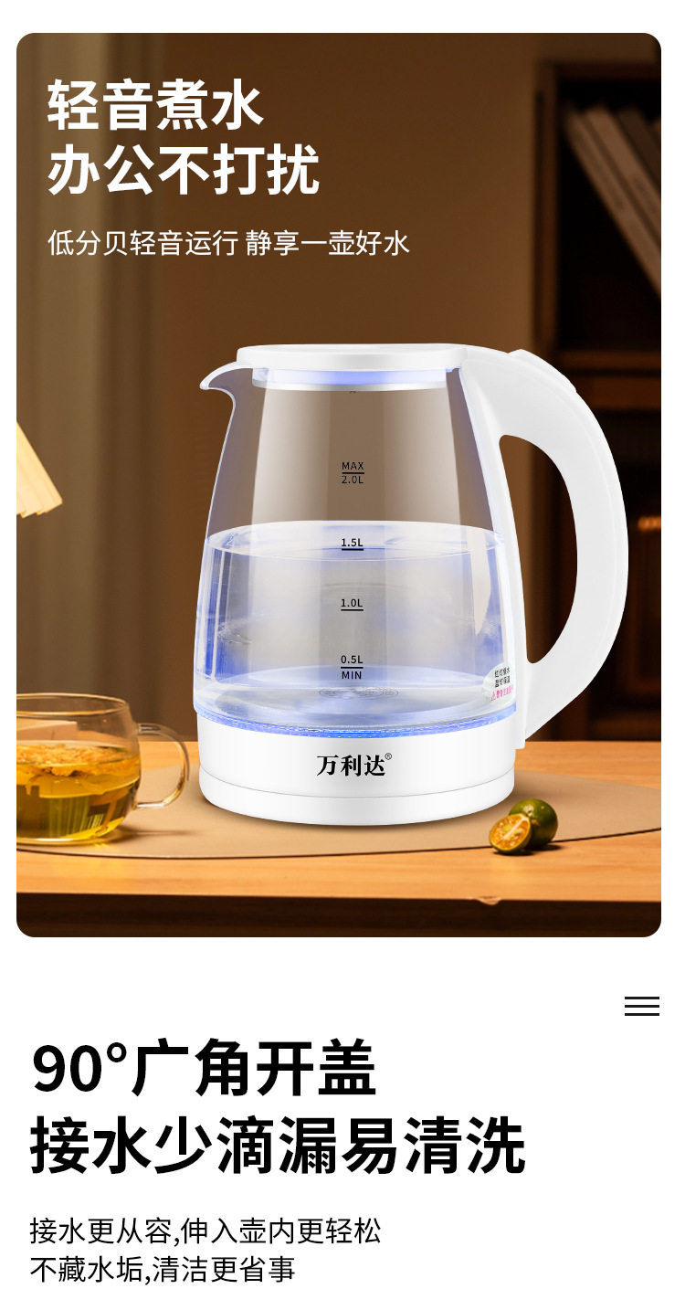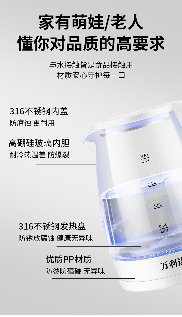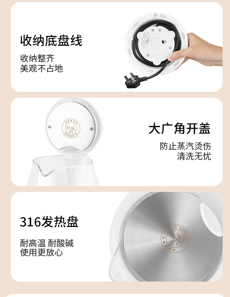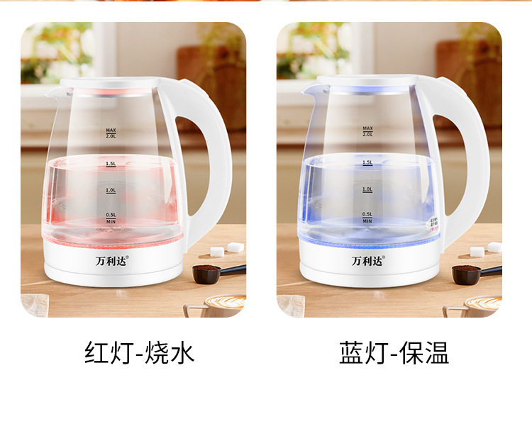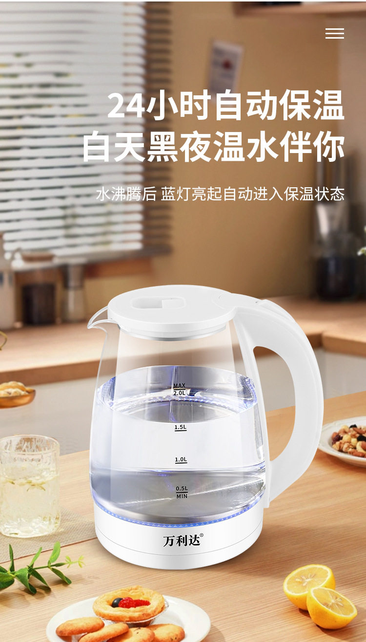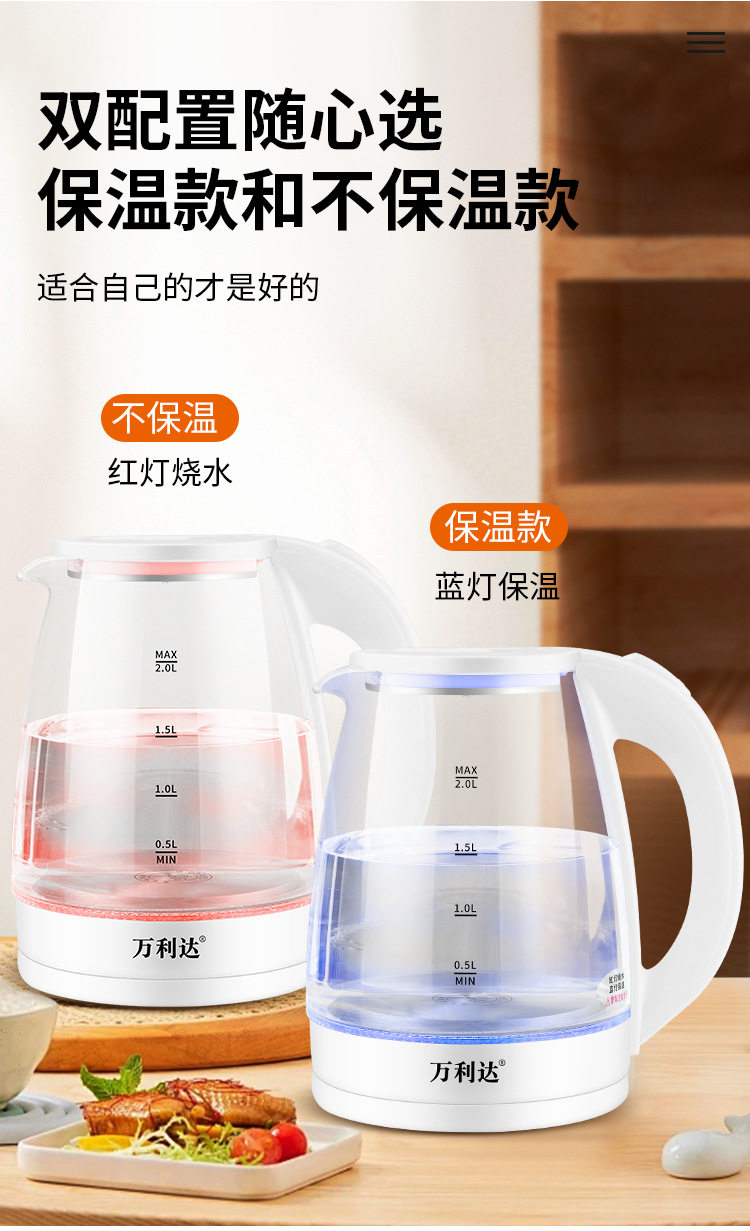 Wanlida Electric Water Kettle Household Gaopeng Glass 316 Stainless Steel Water Kettle Thermal Insulation Integrated Automatic Power Off 2 Liters