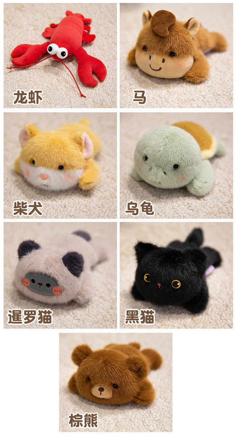 | Color | West highland dog,Frog,Pony,Yellow duck,Sloth,Kapibala,Little lamb,Baby elephant,Fox,Pink rabbit,Lobster,Fat horse,Shiba inu,Turtle,Siamese cat,Black cat,Brown bear |