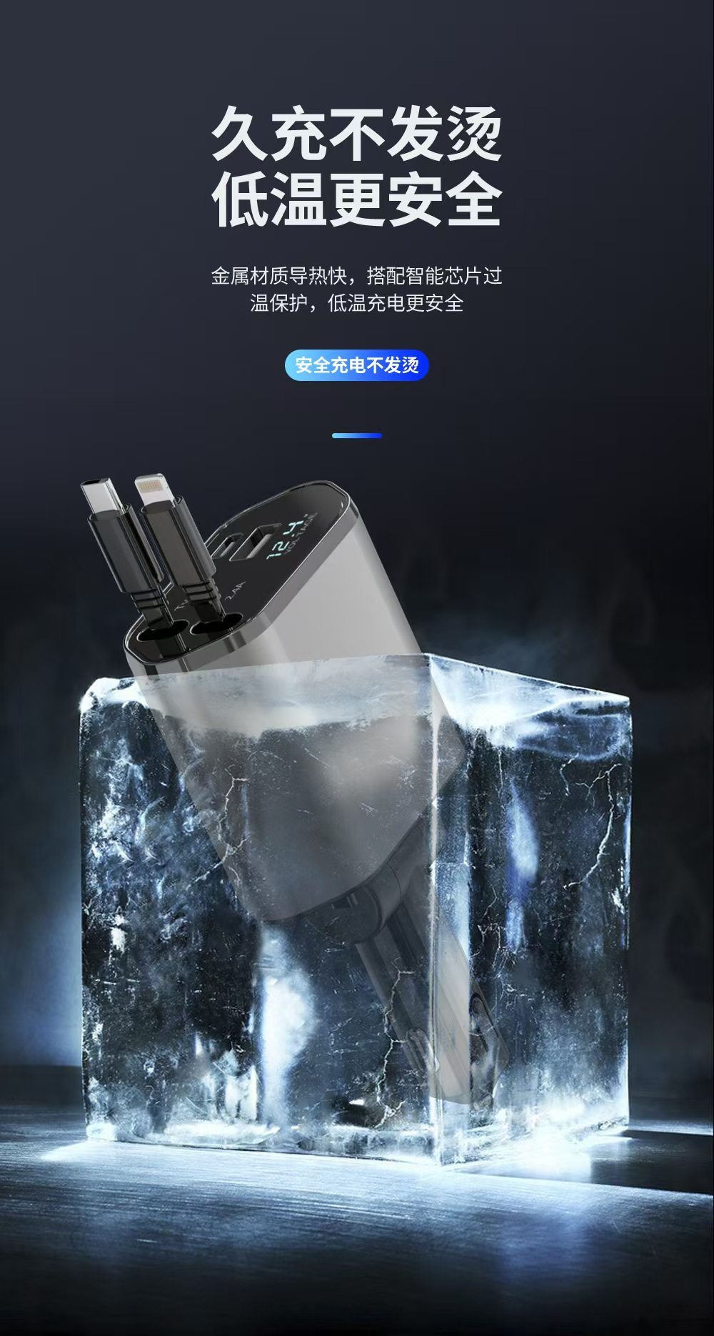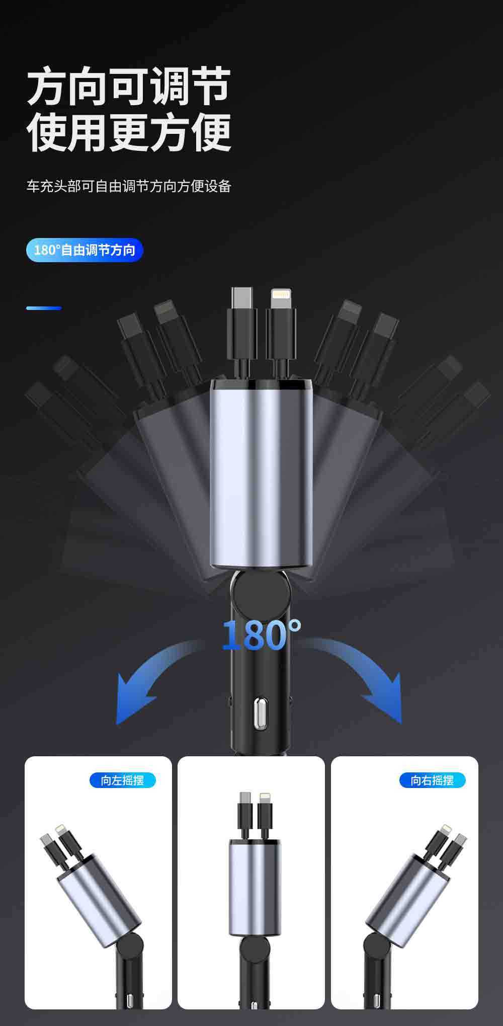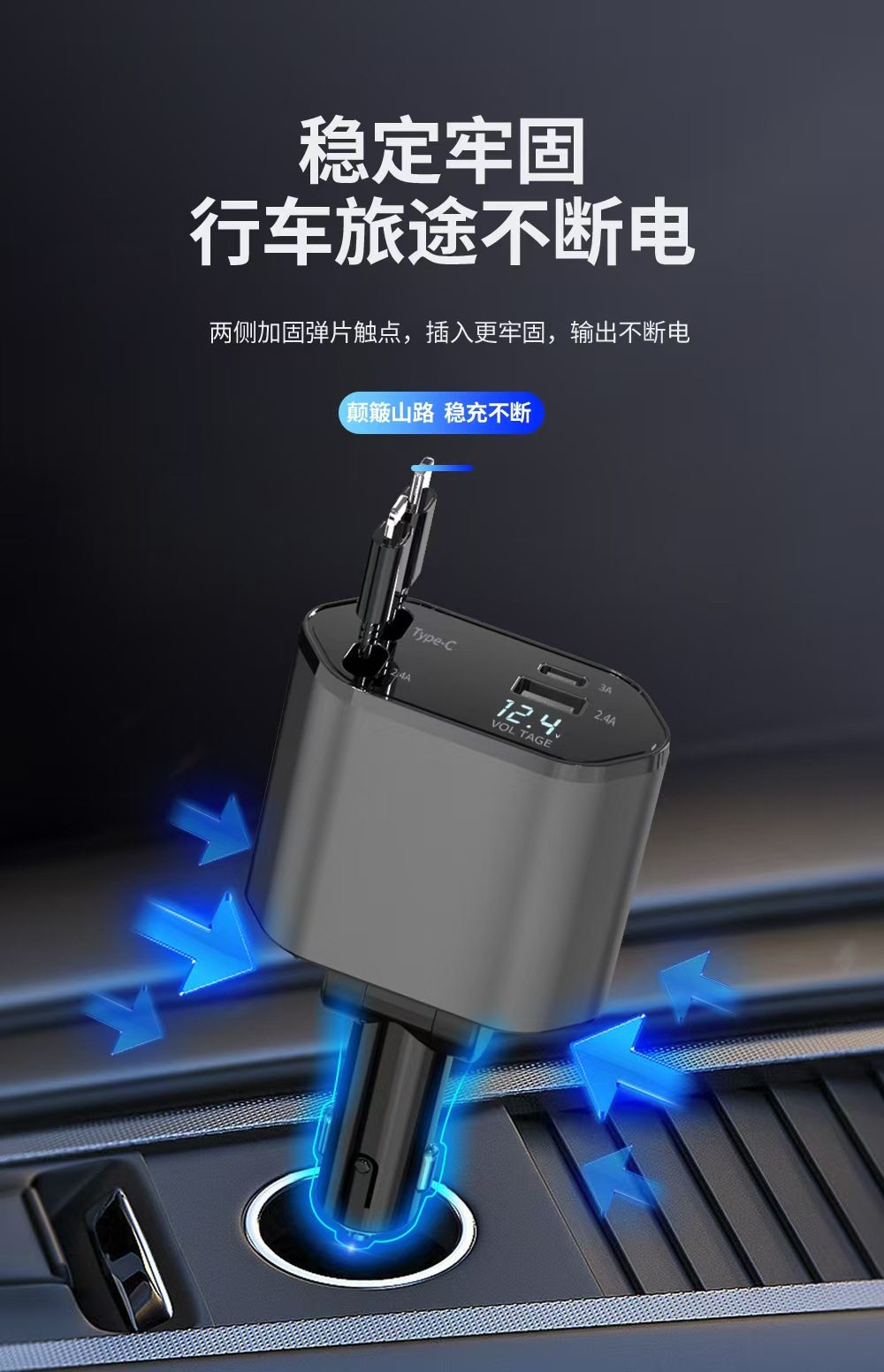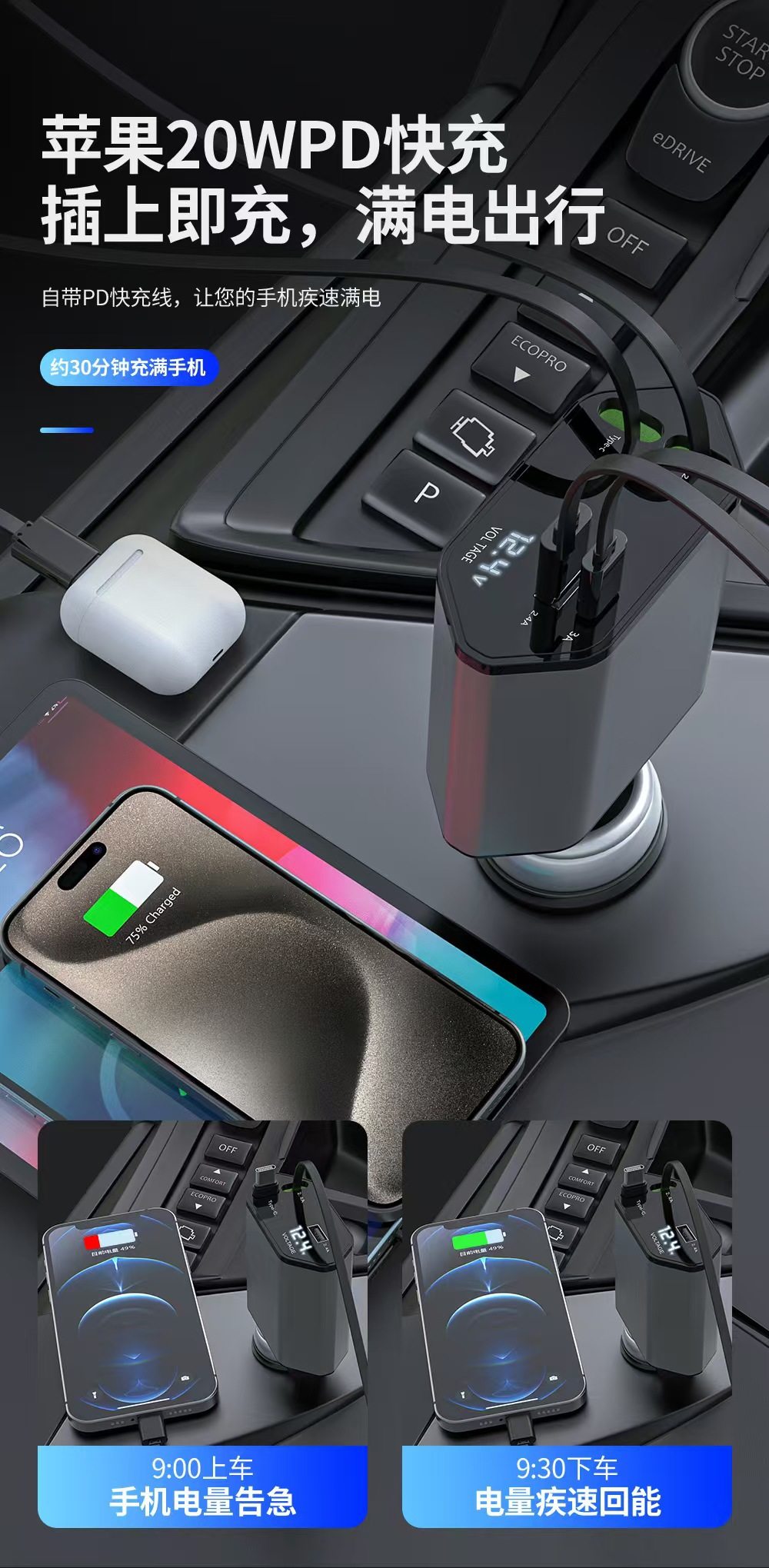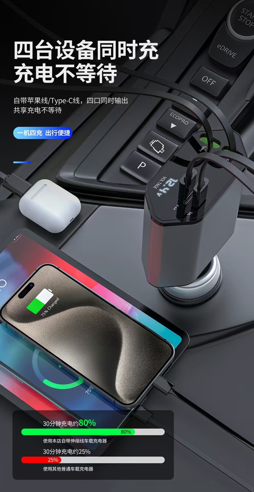 120W Car Charger Super Fast Charging Retractable One to Four Flash Charging Car Charger Cigarette Lighter Suitable for Apple 15 Huawei