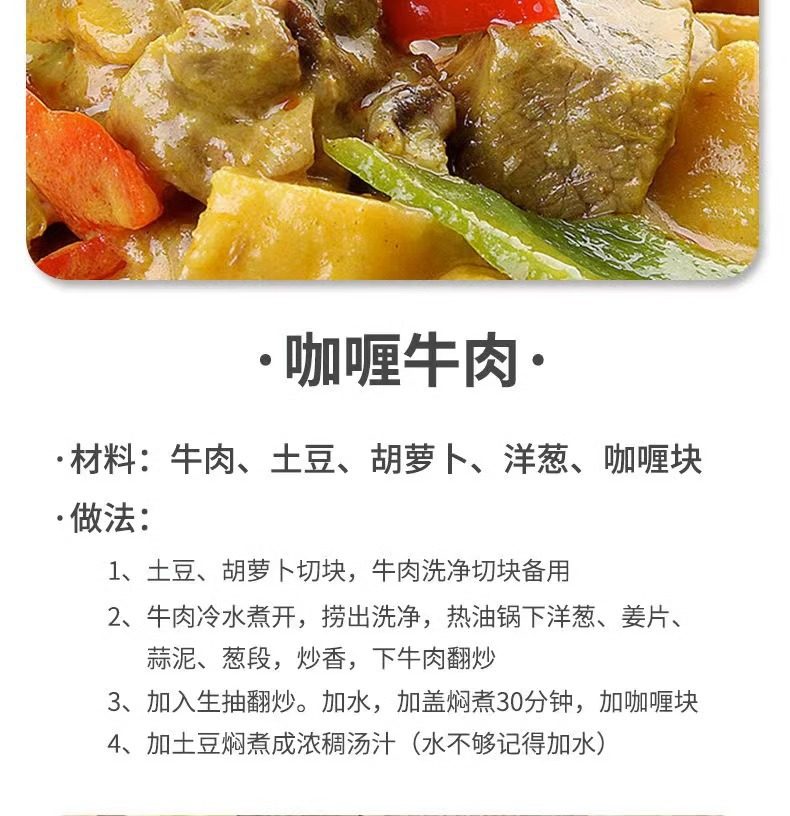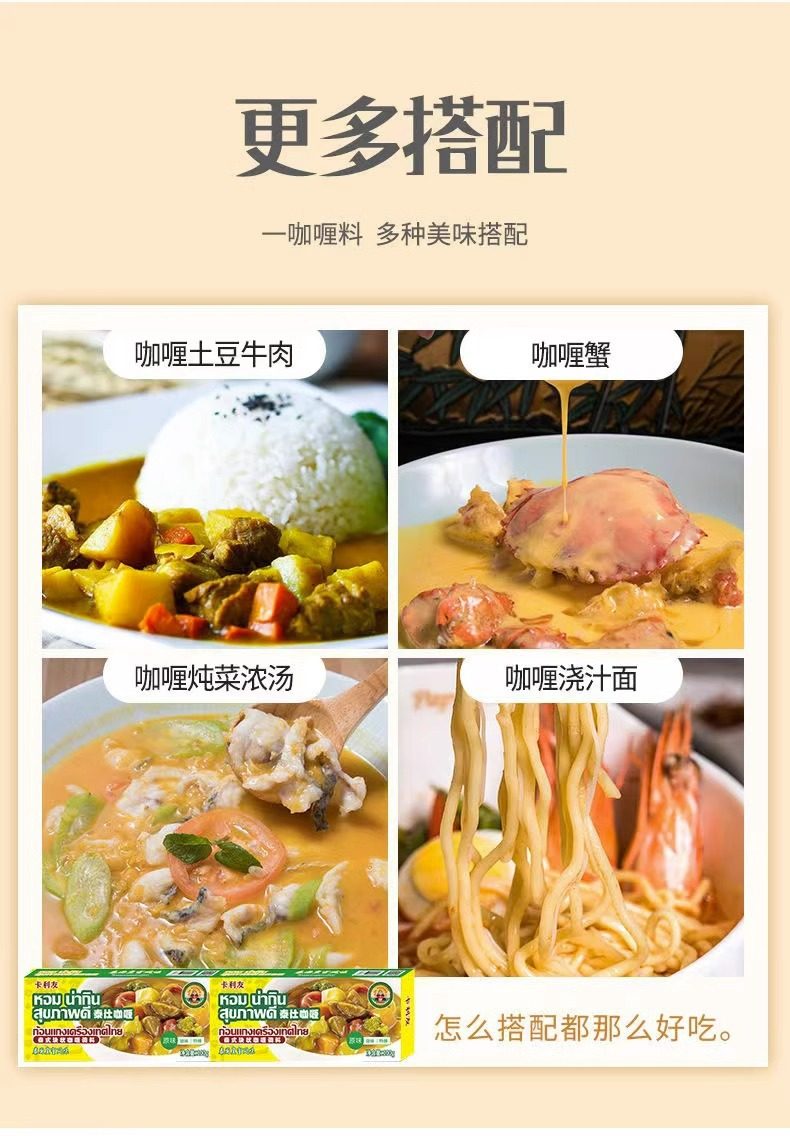 | Packaging specifications | Kaliyou curry mildly spicy 100g*1,Kaliyou curry original 100g*1+ mildly spicy 100g*1+ extra spicy 100g*1,Kaliyou curry original flavor 100g*1,Kaliyou curry original flavor 100g*1+ mild spicy 100g*1,Kaliyou curry extra spicy 100g*1+ mildly spicy 100g*1,Kaliyou curry original flavor 100g*3,Kaliyou curry mild spicy 100g*2+extra spicy 100g*1,Kaliyou curry original flavor 100g*2,Kaliyou curry original flavor 100g*4,Kaliyou curry mildly spicy 100g*3,Kaliyou curry extra spicy 100g*1,Kaliyou curry mildly spicy 100g*2,Kaliyou curry extra spicy 100g*2,Kaliyou curry original flavor 100g*1+extra spicy 100g*1,Kaliyou curry extra spicy 100g*3,Kaliyou curry original flavor 100g*2+ mildly spicy 100g*1,Kaliyou curry original flavor 100g*2+extra spicy 100g*1,Kaliyou curry mildly spicy 100g*2+original flavor 100g*1,Kaliyou curry mildly spicy 100g*4,Kaliyou curry extra spicy 100g*4,Kaliyou curry original flavor 100g*2+ mild spicy 100g*2,Kaliyou curry original flavor 100g*2+extra spicy 100g*2,Kaliyou curry mild spicy 100g*2+extra spicy 100g*2,Kaliyou curry original flavor 100g*5,Kaliyou curry mildly spicy 100g*5,Kaliyou curry extra spicy 100g*5,Kaliyou curry 100g*5 boxes (mixed flavors, please contact customer service for notes) |