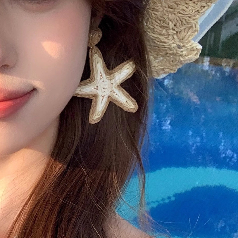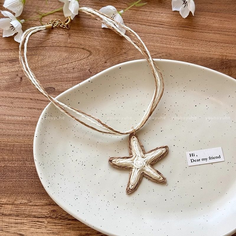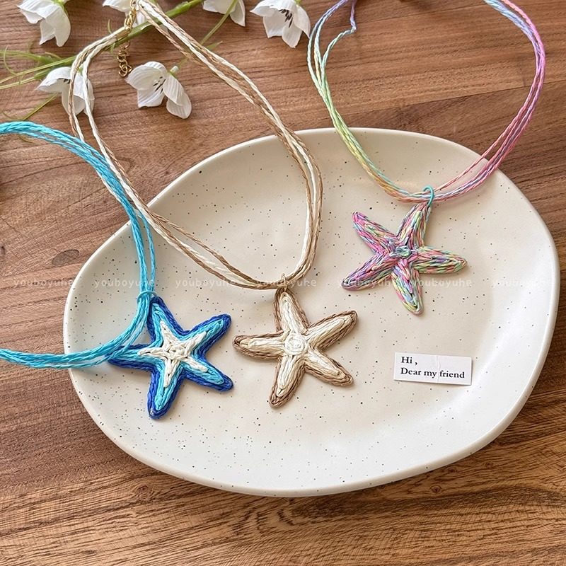 Vacation Island~Blue Straw Starfish Necklace Women's Summer Beach Seaside Resort Style Clavicle Chain Niche Accessories