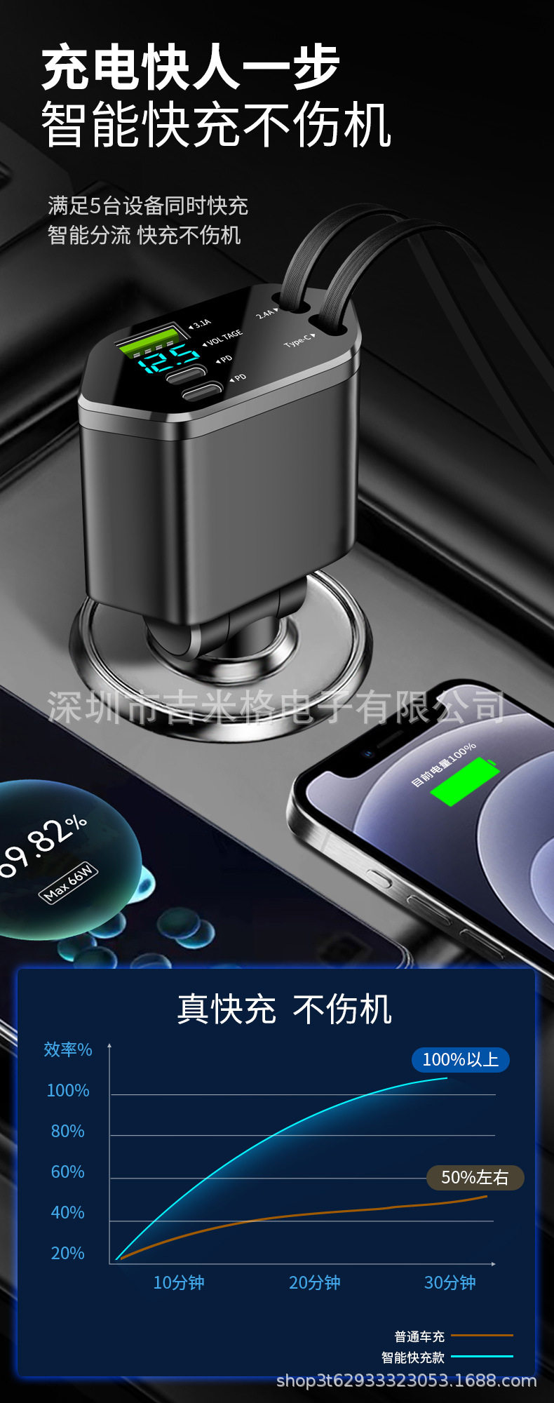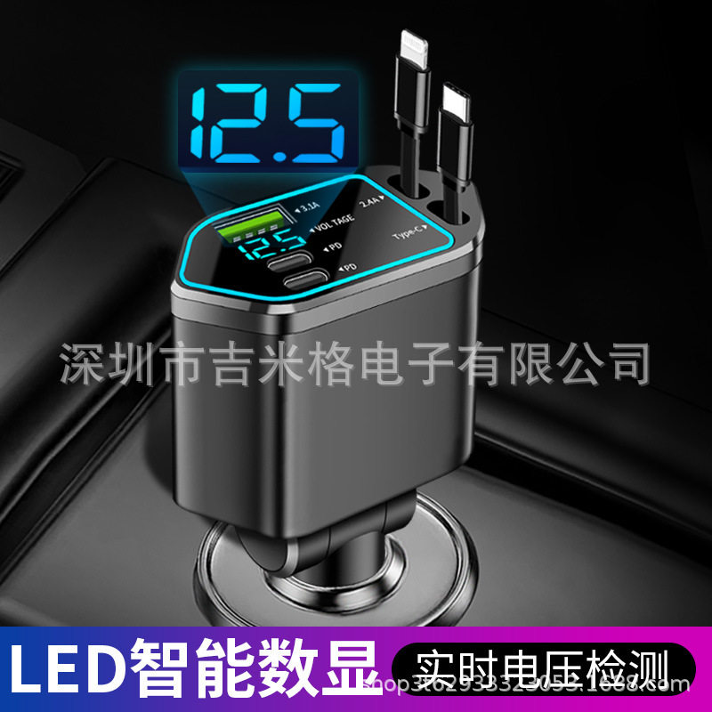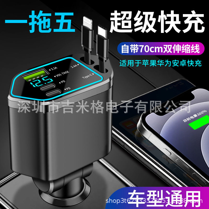 Digital Display Car Charger Retractable Cable Car Charger Pd Car Fast Charger Super Fast Charging Five-In-One Cigarette Lighter Cross-Border
