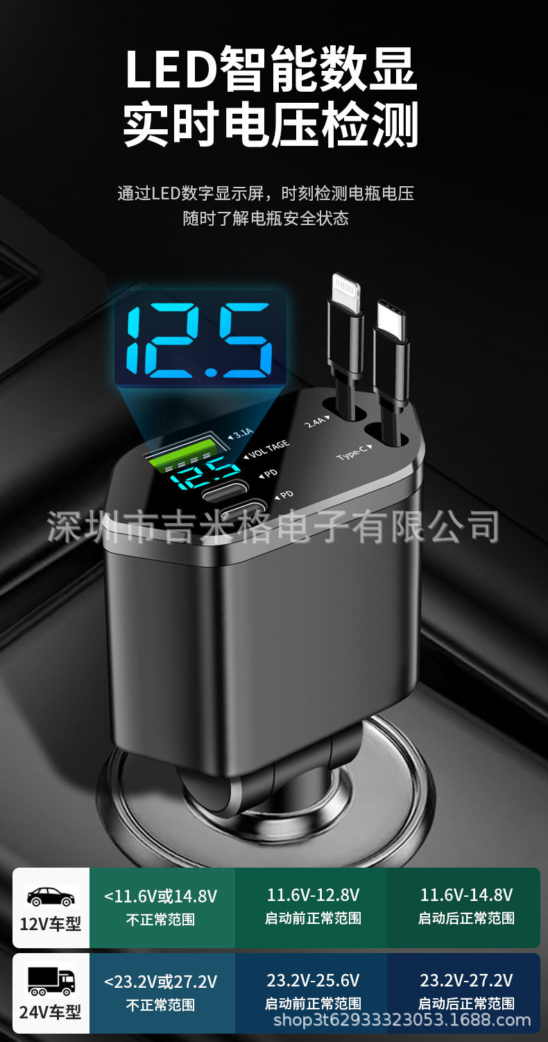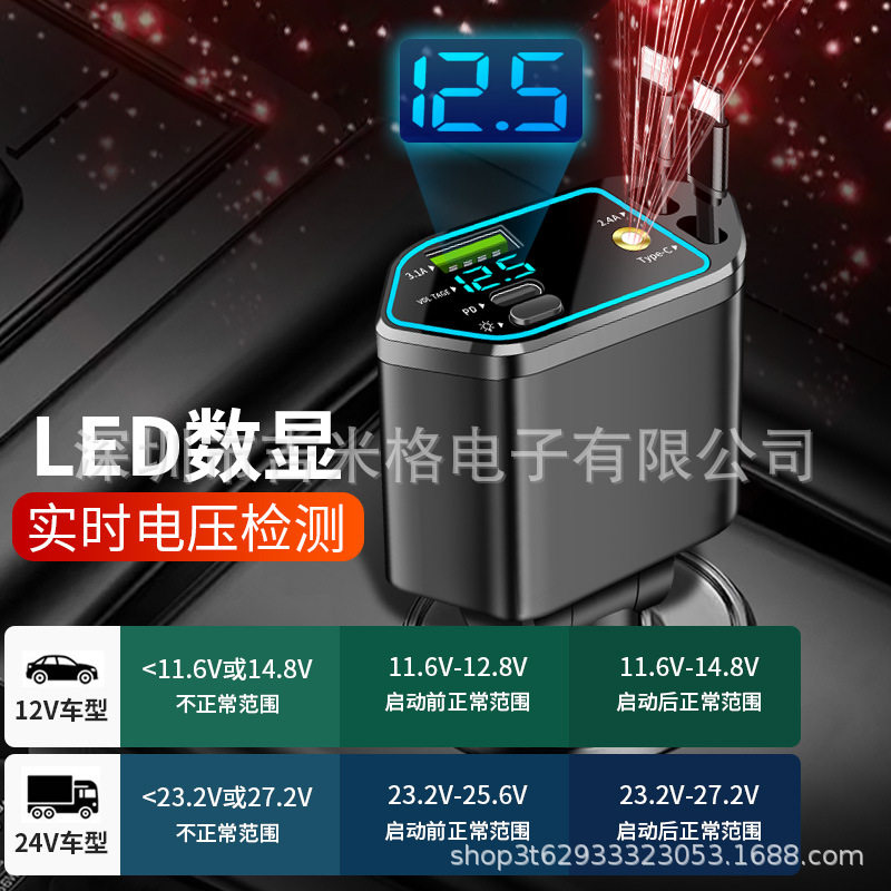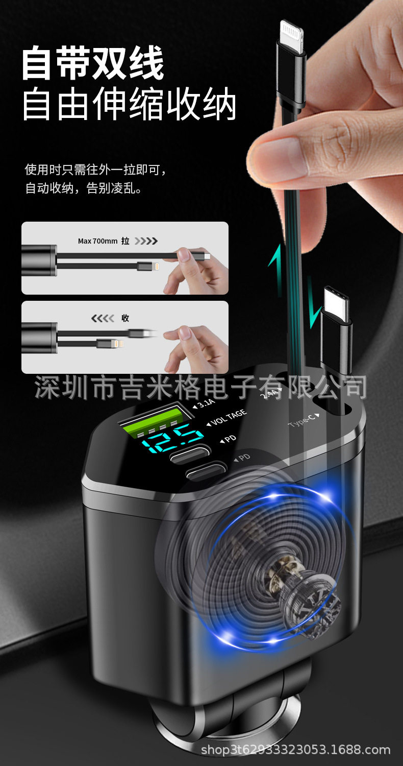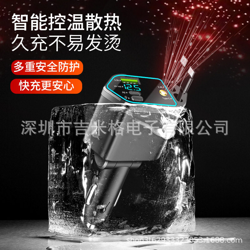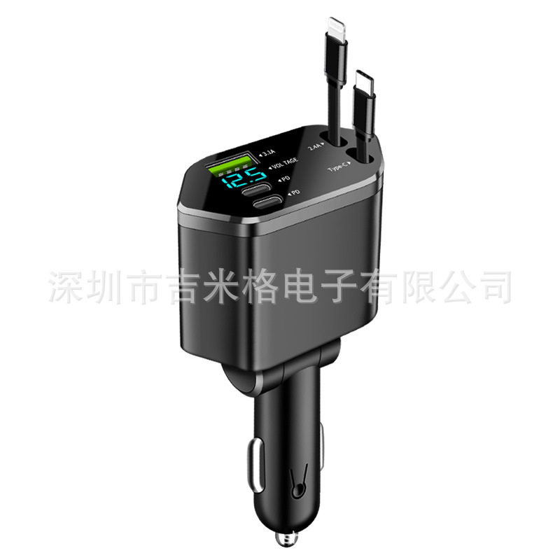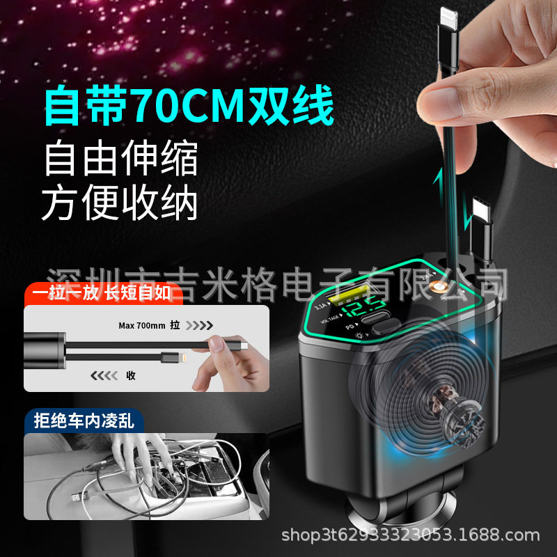 Digital Display Car Charger Retractable Cable Car Charger Pd Car Fast Charger Super Fast Charging Five-In-One Cigarette Lighter Cross-Border