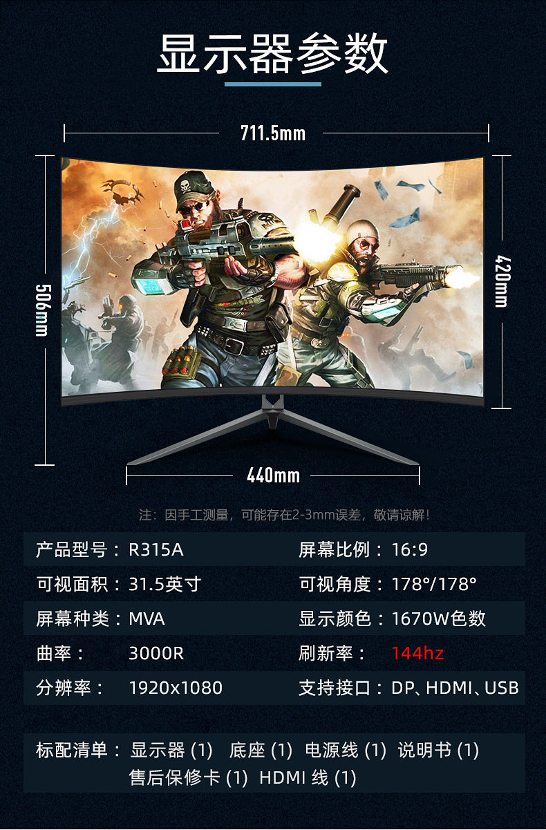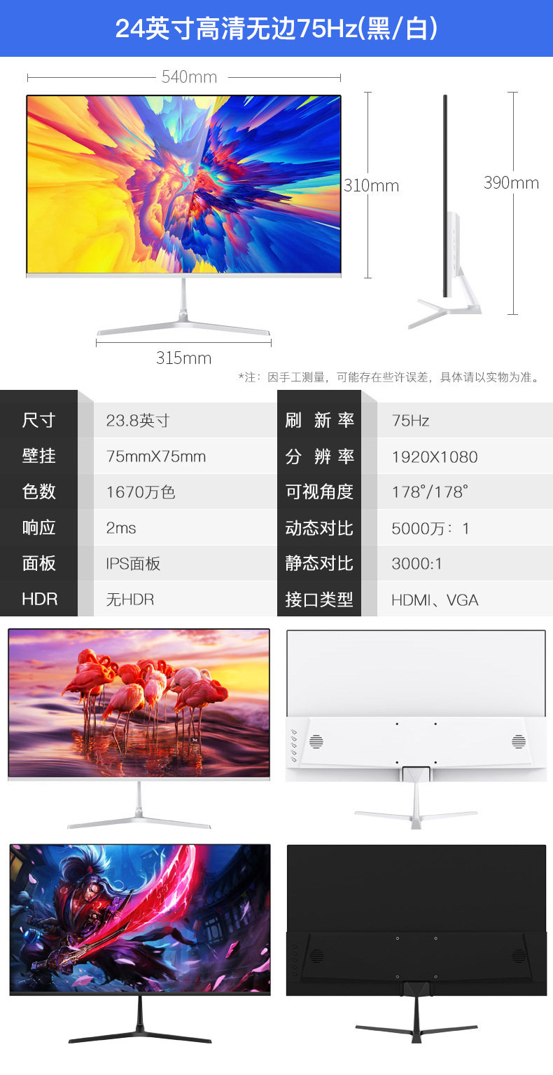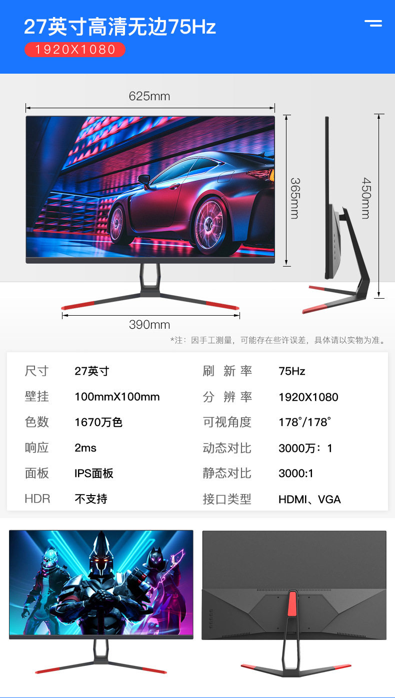 | Size | Orange black 24inch direct face 1k75hz-official standard,Beautiful white 24inch face 1k75hz-official standard,Brown black 24inch curved surface 1k75hz-official standard,Big white 24inch curved surface 1k75hz-official standard,Night black 24inch face 1k165hz-official standard,Atmospheric black 24inch curved surface 1k165hz-official standard,Black and red 27inch face 1k75hz-official standard,Black 27inch curved surface 1k75hz-official standard,White 27inch curved surface 1k75hz-official standard,Black 27inch face 2k 100hz-official standard,Silver black red 27inch face 1k165hz-official standard,Brilliant black 27inch curved surface 1k165hz-official standard,Glacier white 27inch curve 2k75hz (this model is black) - official standard,Small black 27inch curved surface 1k200hz-official standard,Splash black 27inch face 2k 170hz-official standard,Graffiti black 32inch face 1k75hz [monitoring recommendation] - official standard,Elegant black 32inch curved surface 1k75hz [big hot model, must buy - official standard,Apricot white 32inch curved surface 1k75hz (big hot model, must buy - official standard configuration,Matte black 27inch curved surface 2k 165hz (upgraded to 180hz) - official standard,Black matte 32inch curved surface 1k144hz-official standard,Miscellaneous black 32inch curved surface 1k165hz-official standard,Dahei 27inch faces 2k170hz lifting and rotating base - official standard,Big black 32inch curved surface 2k 75hz-official standard,Gray black 32inch curved surface 1k200hz-official standard,Pure black 27inch curved surface 2k180hz lifting and rotating base - official standard,Gray 32inch direct face 2k75hz-official standard,Pure black 32inch curved surface 2k 120hz-official standard,Single black 32inch curved surface 4k75hz (for design only) - official standard,Black gray 32inch direct face 2k165hz-official standard,Dark black gray 32inch curved surface 2k180hz [must buy for games - official standard,Double black gray 32inch curved surface 2k180hz (lifting and rotating) - official standard,Dual black 34inch curved quasi-4k100hz hairtail screen - official standard,Dark gray 34inch curved quasi-4k180hz hairtail screen (hot selling) - official standard,All black 34inch curved quasi-4k180hz hairtail screen with speaker - official standard,All white 34inch curved quasi-4k180hz hairtail screen with speaker - official standard,Single black 34inch curved accurate 4k144hzlg hairtail screen with speaker - official standard |