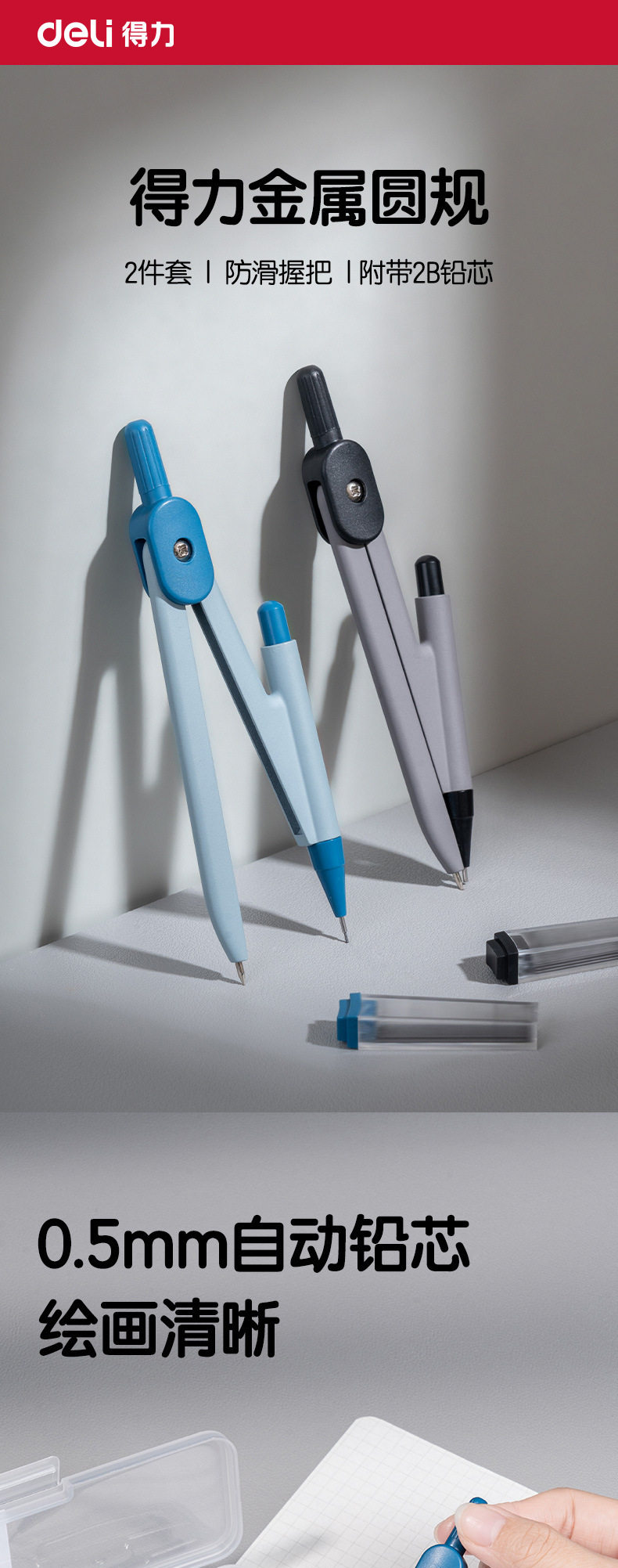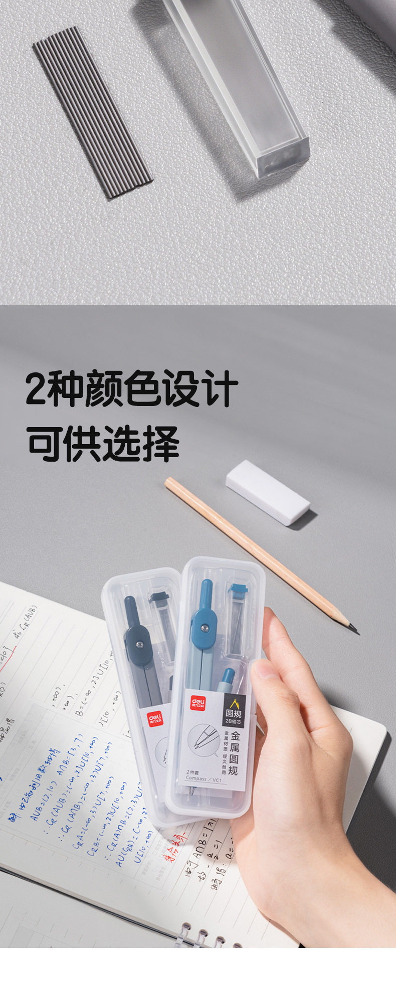 Deli Vc1 Basic Compass 2-Piece Set Comes with 2B Lead Student Examination Drawing Metal Compass