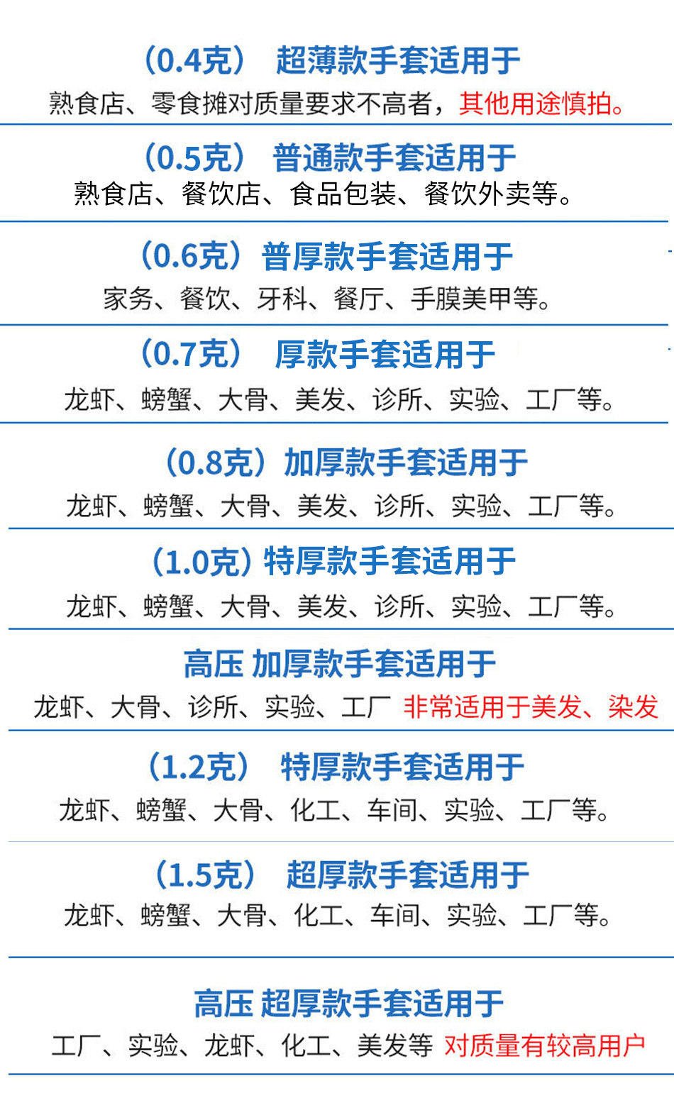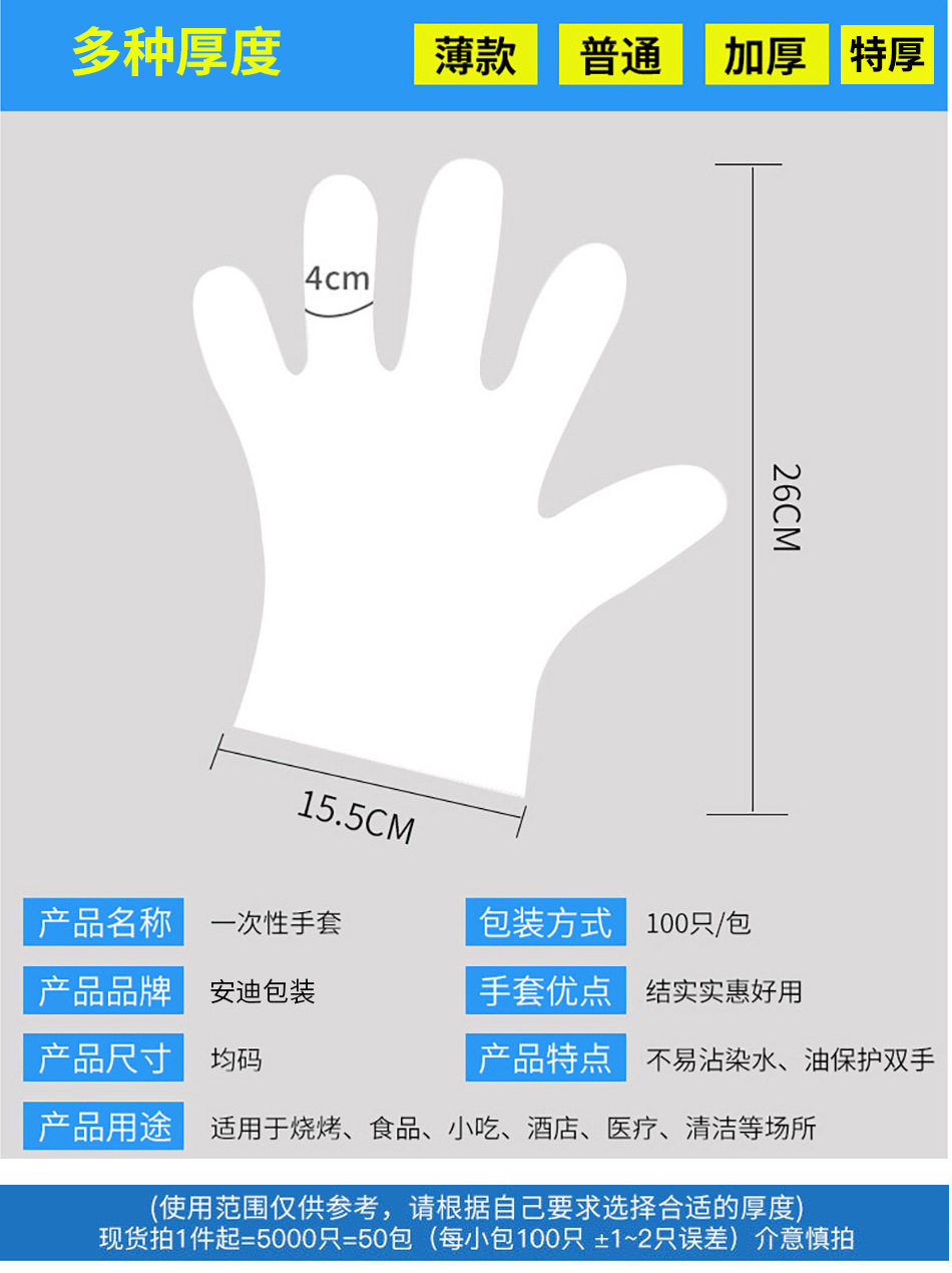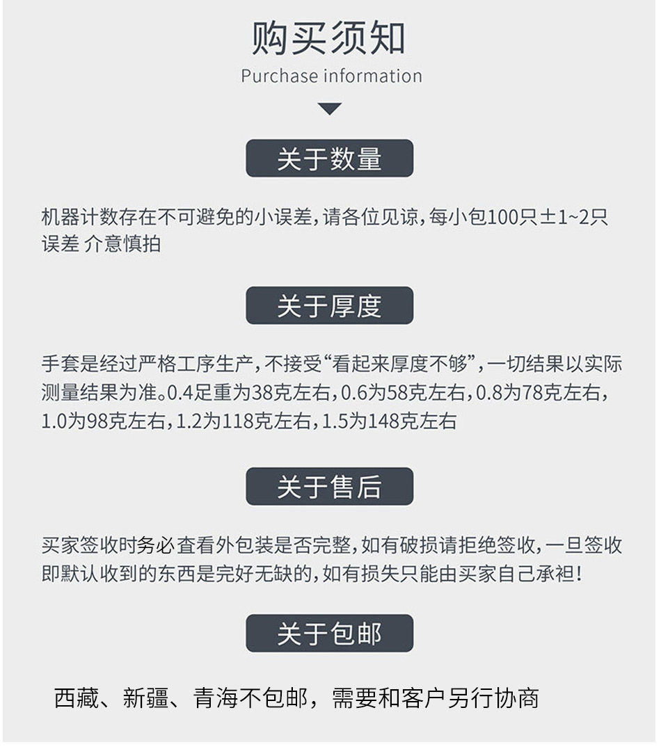 | Specification | 0.4 ultra-thin model [1 pack of 100 pieces],0.5 ordinary thickness [1 pack of 100 pieces],0.6g 1 piece/100 pieces 1 pack,0.7g 1 piece/100 pieces 1 pack,0.8g 1 piece/100 pieces 1 pack,1.0g thickness [1 pack of 100 pieces],1.2g 1 piece/100 pieces 1 pack,1.5g thickness [1 pack of 100 pieces],Independent gloves transparent [2 pieces/pack] 5 small packs,0.4g thick [1 pack of 100 pieces],0.5 thickness [1 pack of 100 pieces] |