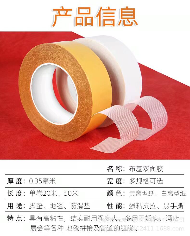 | Specifications and models | Double-sided cloth-based tape yellow release paper; 10mm*10m,Double-sided cloth-based tape yellow release paper; 12mm*10m,Double-sided cloth-based tape yellow release paper; 15mm*10m,Double-sided cloth-based tape yellow release paper; 20mm*10m,Double-sided cloth-based tape yellow release paper; 25mm*10m,Double-sided cloth-based tape yellow release paper; 30mm*10m,Double-sided cloth-based tape yellow release paper; 35mm*10m,Double-sided cloth-based tape yellow release paper; 40mm*10m,Double-sided cloth-based tape yellow release paper; 45mm*10m,Double-sided cloth-based tape yellow release paper; 50mm*10m,Double-sided cloth-based tape yellow release paper; 10mm*20m,Double-sided cloth-based tape yellow release paper; 12mm*20m,Double-sided cloth-based tape yellow release paper; 15mm*20m,Double-sided cloth-based tape yellow release paper; 20mm*20m,Double-sided cloth-based tape yellow release paper; 25mm*20m,Double-sided cloth-based tape yellow release paper; 30mm*20m,Double-sided cloth-based tape yellow release paper; 35mm*20m,Double-sided cloth-based tape yellow release paper; 40mm*20m,Double-sided cloth-based tape yellow release paper; 45mm*20m,Double-sided cloth-based tape yellow release paper; 50mm*20m |