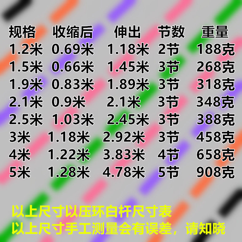 | Specification | 1.2m (two sections contracted)/see pictures for detailed dimensions,1.5m (three sections contracted)/see pictures for detailed dimensions,1.9m (three sections contracted)/see pictures for detailed dimensions,2.1m (three sections contracted)/see pictures for detailed dimensions,2.5m (three sections contracted)/see pictures for detailed dimensions,3m (three sections contracted) /see pictures for detailed dimensions,4m (four sections contracted)/see pictures for detailed dimensions,5m (five sections shrink)/see pictures for detailed dimensions |