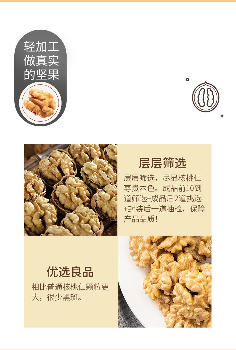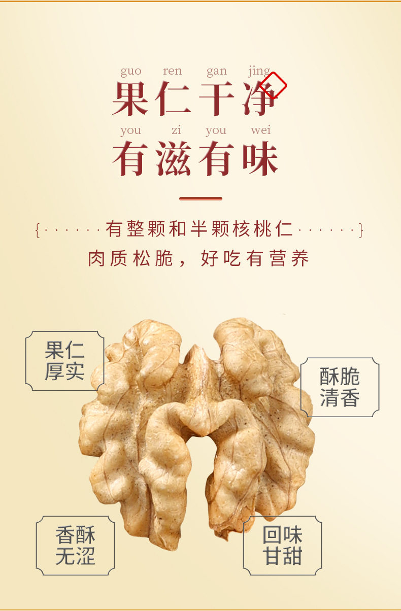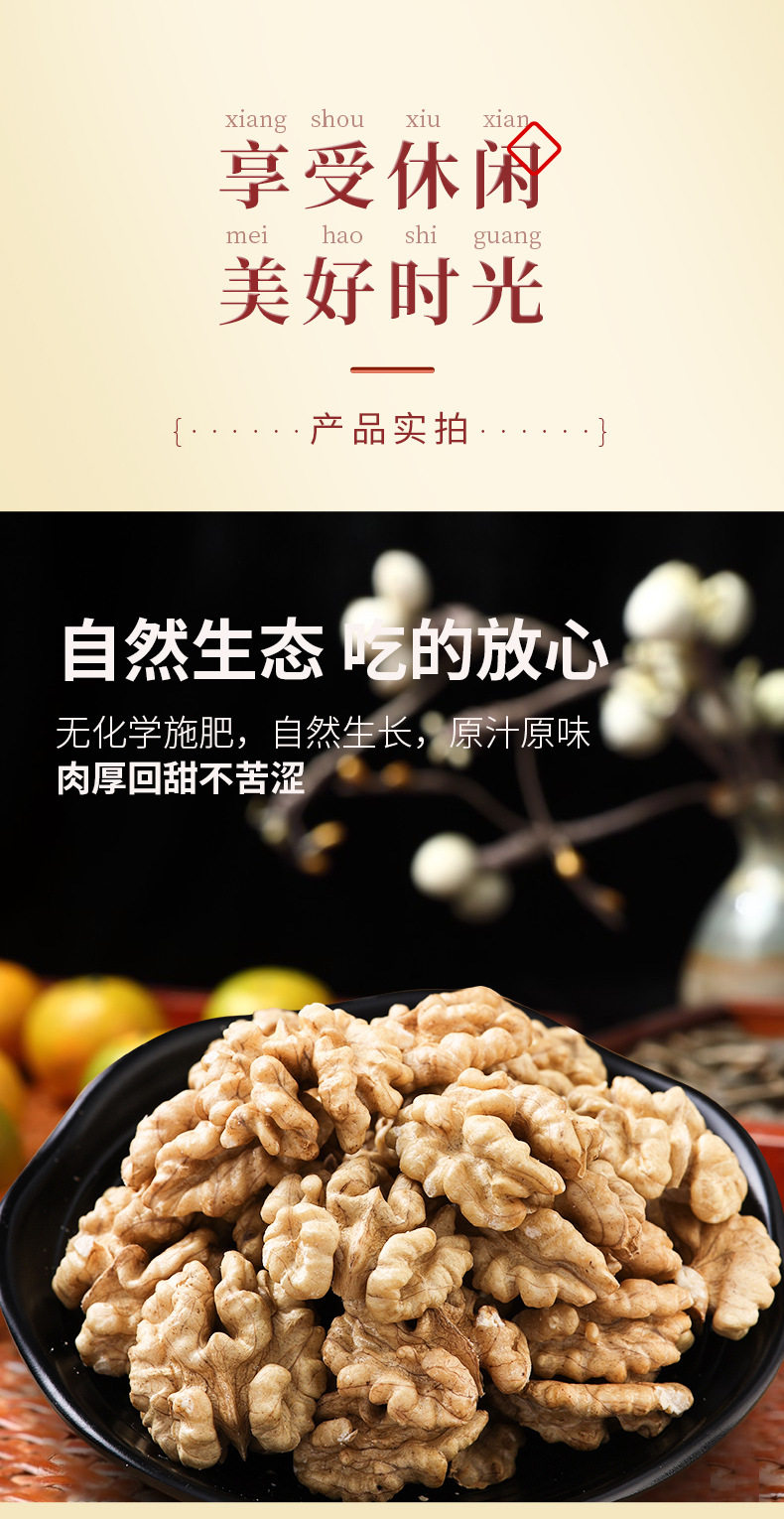 | Packaging specifications | 200g raw walnut kernels x 1 bag [try it early],500g raw walnut kernels x 1 bag【 0.5kg 】,500g raw walnut kernels x 2 bags【 1.0kg 】,500g raw walnut kernels x 3 bags【 1.5kg 】,500g raw walnut kernels x 5 bags【 2.5kg 】 |