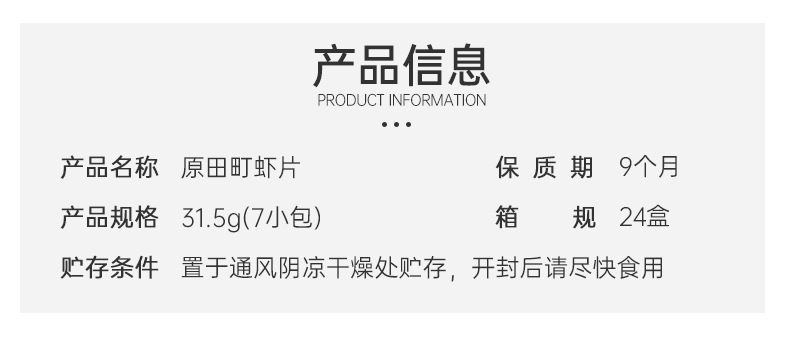| Packaging specifications | As of june 26th, cod & shrimp crisps 31.5g (7 packs)/box, shelf life: 9 months,As of june 26th, high calcium shrimp chips 31.5g (7 packs)/box, shelf life 9 months |