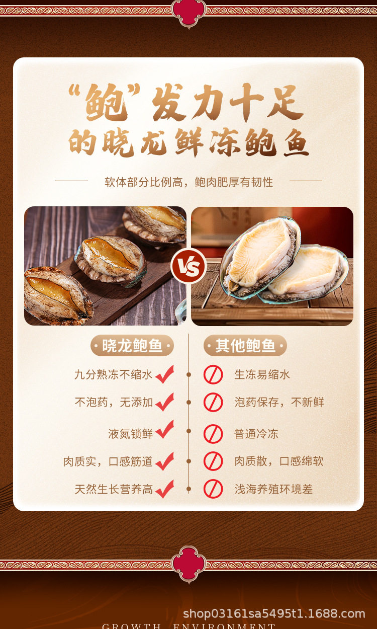 | Packaging specifications | Extra large size 3-8 heads/jin [big and plump],Extra large 8-12-head abalone [fleshy and fleshy],15 large abalone [full meat] |