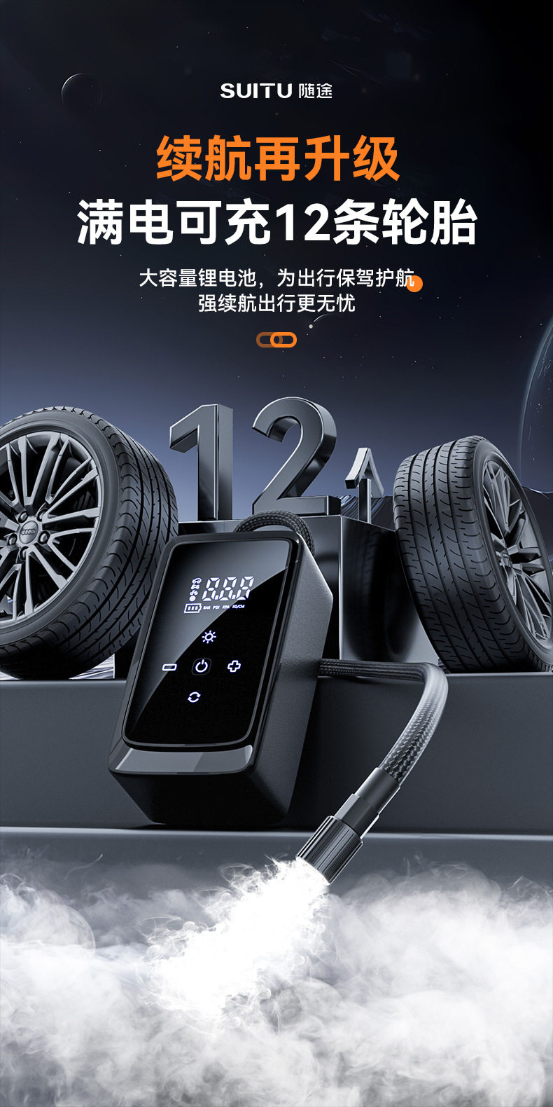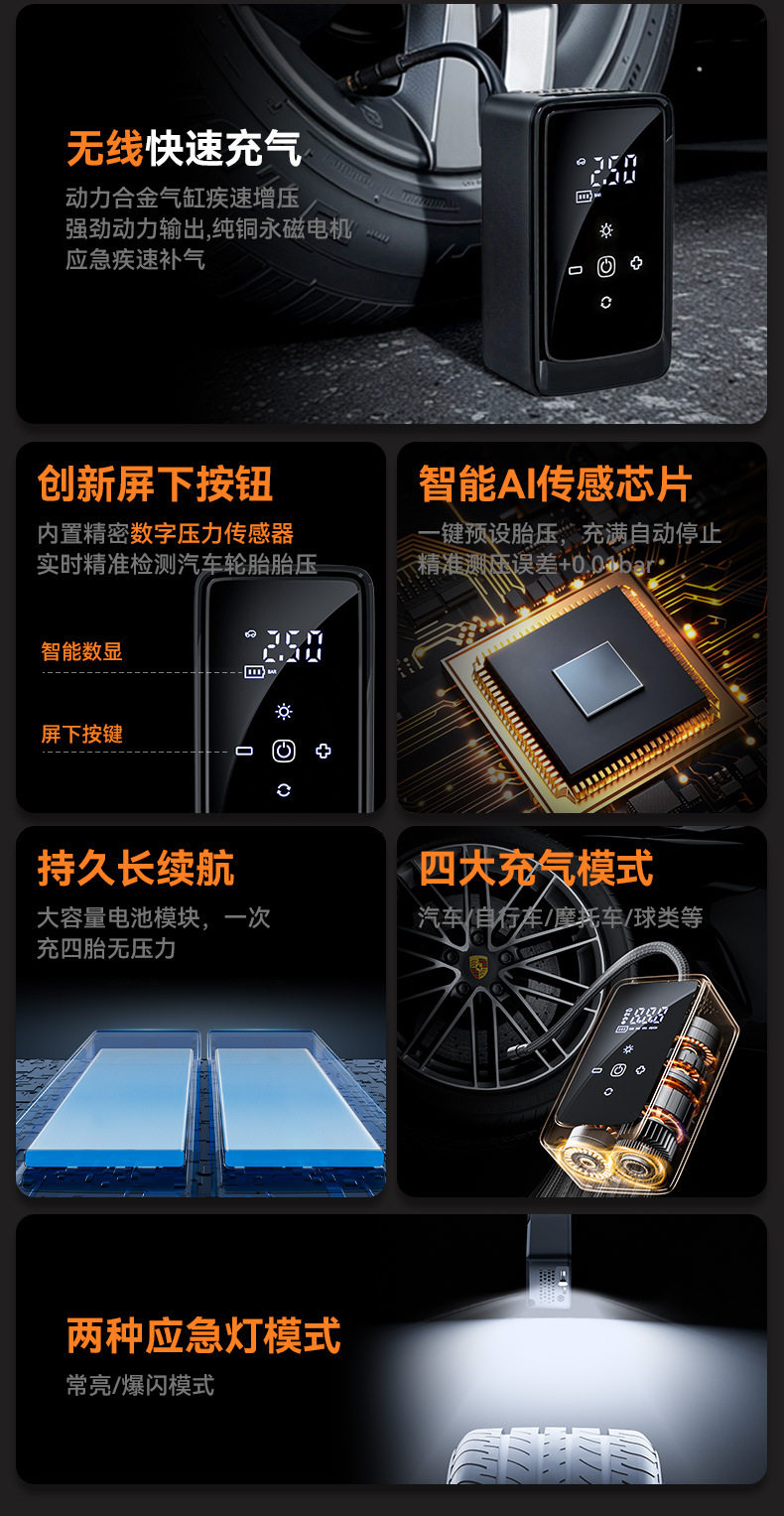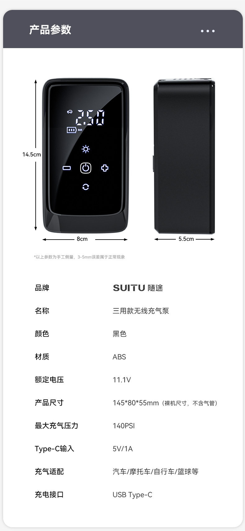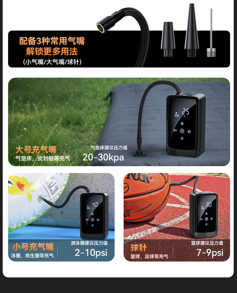 | Specification | Three-way wireless air pump + usb + dc model |