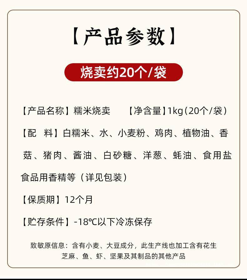 | Packaging specifications | Sanquan glutinous rice shaomai 1.0kg [about 20 pieces] |