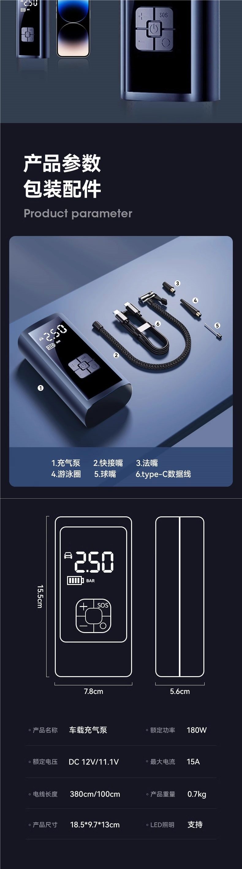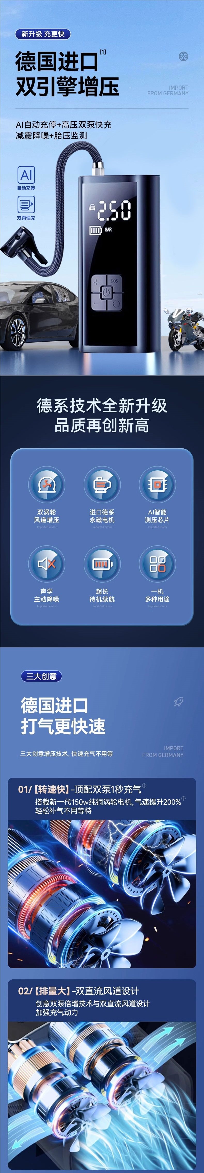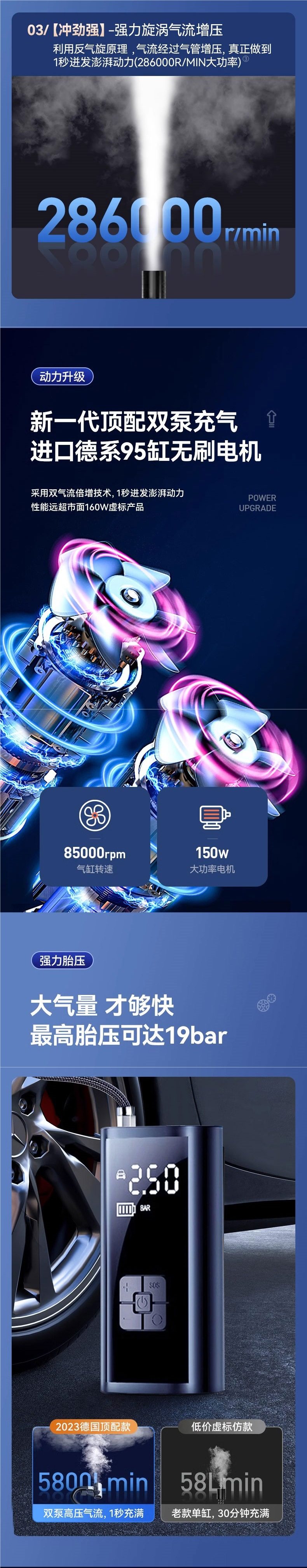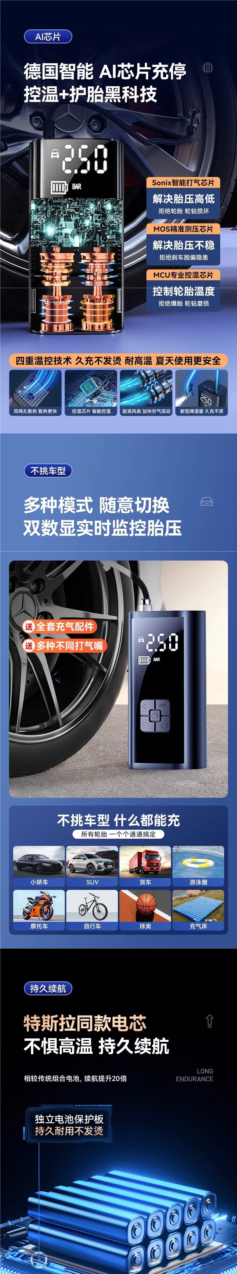 | Specification | [germany imported wired model] 8599999 pump driving force + free inflatable set + storage bag,[wireless flagship model imported from germany] 8999999 pump driving force + free inflatable set + storage bag,[german imported brushless luxury model] 9999999 pump driving force + free inflatable set + storage bag,[german imported brushless supreme model] 9999999 pump driving force + free inflatable set + storage bag,[german imported brushless three-purpose power bank version] 99999999 pump driving force ★ Plug-in/rechargeable + emergency lighting + storage bag + inflatable set,[german imported brushless three-purpose supreme model] 99999999 pump driving force ★ Plug-in/rechargeable dual-use + used as power bank + emergency lighting + storage bag + tire repair |