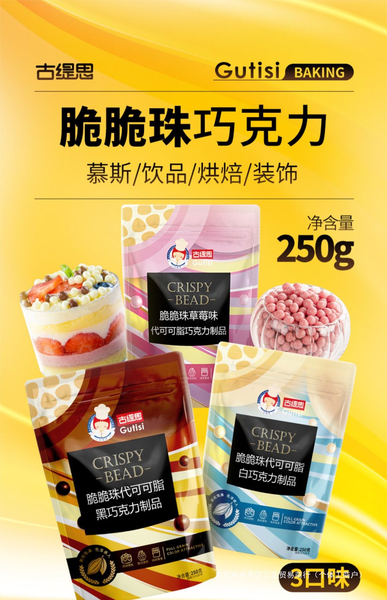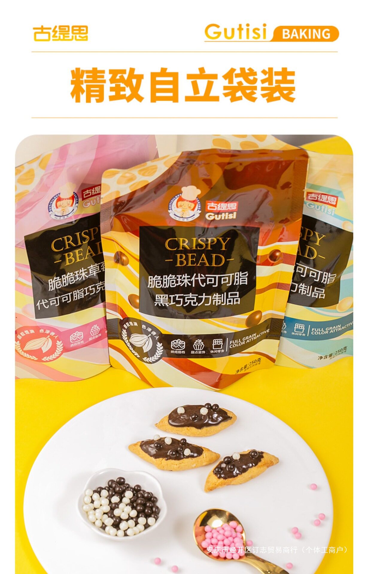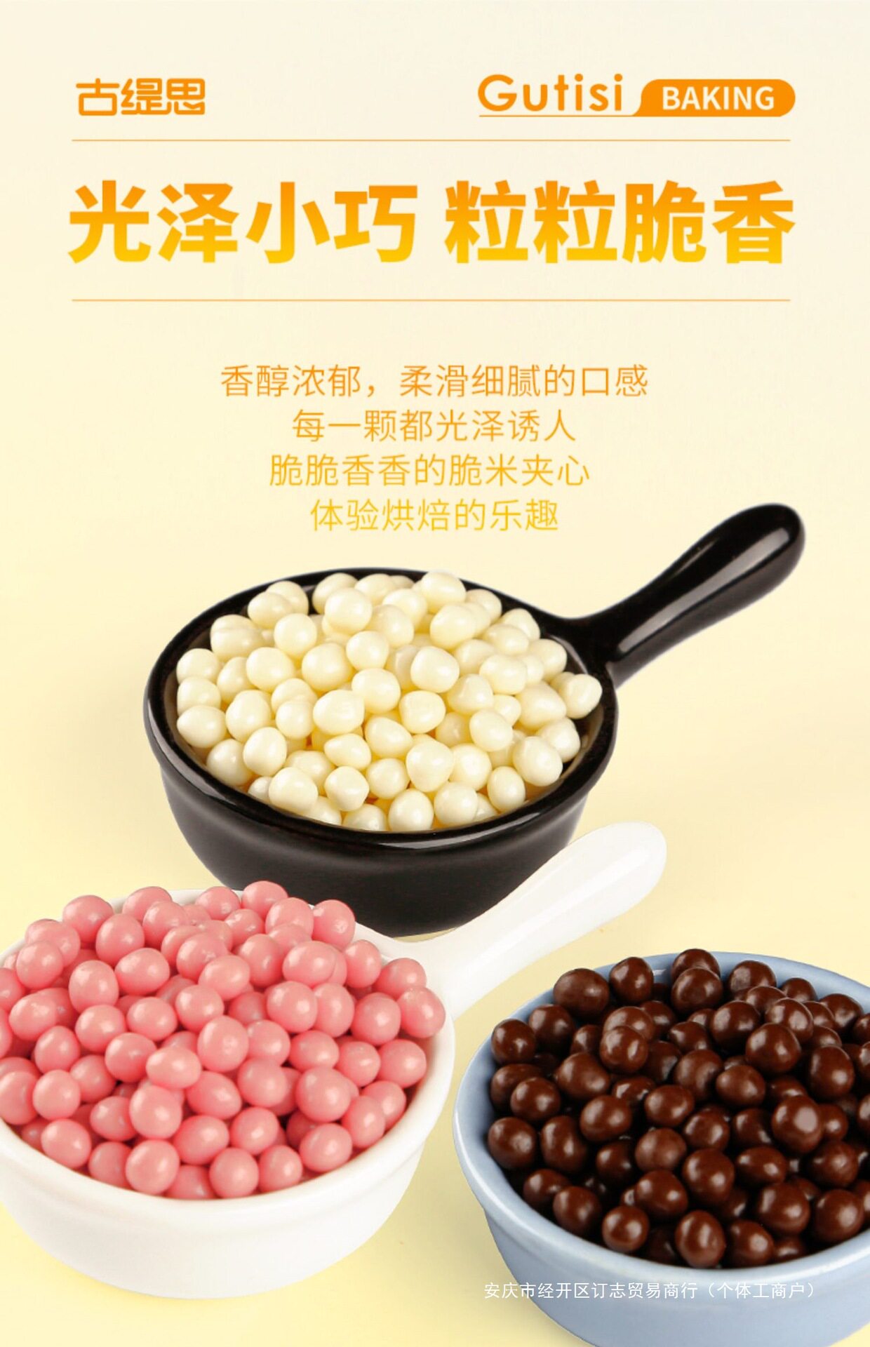 | Packaging specifications | Black pearl rice krispie chocolate 250g,White pearl rice krispie chocolate 250g,Strawberry flavored rice crispy chocolate 250g,4mm black pearl rice crispy chocolate 250g,Black pearl rice krispie chocolate 250g*2,White pearl rice krispie chocolate 250g*2,Dark chocolate crispy beads 250g + strawberry flavored chocolate crispy beads 250g,Strawberry flavored chocolate crisp beads 250g + white chocolate crisp beads 250g,Popping candy dark chocolate 200g,Cranberry flavored chocolate 250g (red),Popping candy dark chocolate 200g*2 bags,Cranberry flavored chocolate 250g (red)*2 bags,Dark chocolate crispy beads 250g + white chocolate crispy beads 250g |
