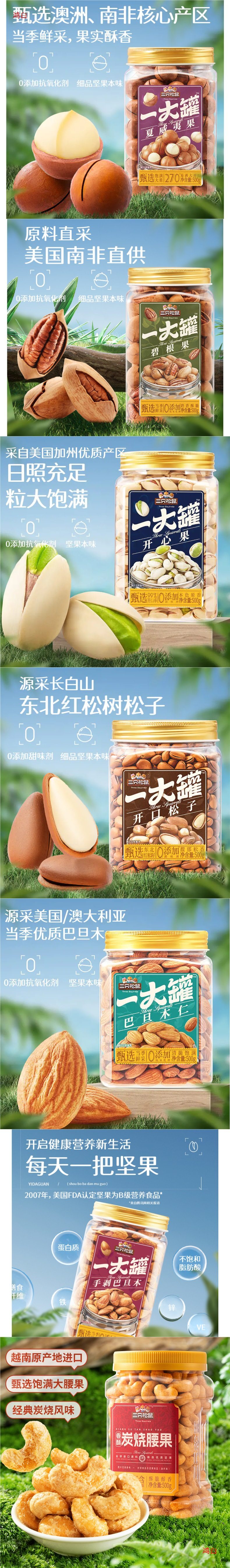 | Packaging specifications | Canned hand-peeled almonds 500g,Canned charcoal roasted cashew nuts 500g,Canned pistachios 500g,Canned open pine nuts 500g |