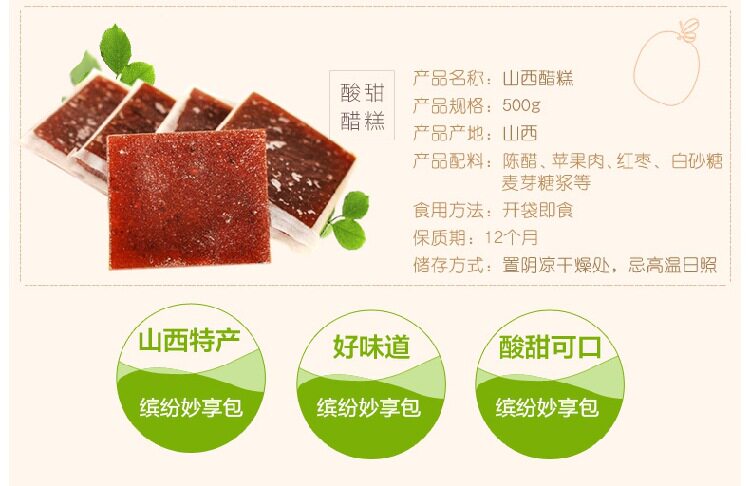 | Packaging specifications | Dahuashu shanxi vinegar cake 128g pack,Dahuai shujiao fruit cake 128g pack,Dahuai shu wild sour date cake 128g per pack,Dahuashu shanxi vinegar cake 258g pack,Dahuai shu sea buckthorn fruit cake 258g pack,Dahuai shu red date slices 258g per pack,Dahuaiju ginger brown sugar red date cake 258g pack,Dahuai shu shanxi vinegar cake 500g pack,Dahuashu shanxi vinegar cake 128g two packs,Dahuai shujiao fruit cake 128g two packs,Dahuai shu wild sour date cake 128g two packs,Dahuai shu shanxi vinegar cake 258g two packs,Dahuai shu sea buckthorn fruit cake 258g two packs,Dahuai shu red date slices 258g two packs,Dahuai shu ginger brown sugar red date cake 258g two packs,258g shanxi vinegar cake and sea buckthorn fruit cake each,258g dahuaishu 4 flavors each pack,Dahuashu shanxi vinegar cake 500g two packs,Dahuai shu 128g three flavors each pack |