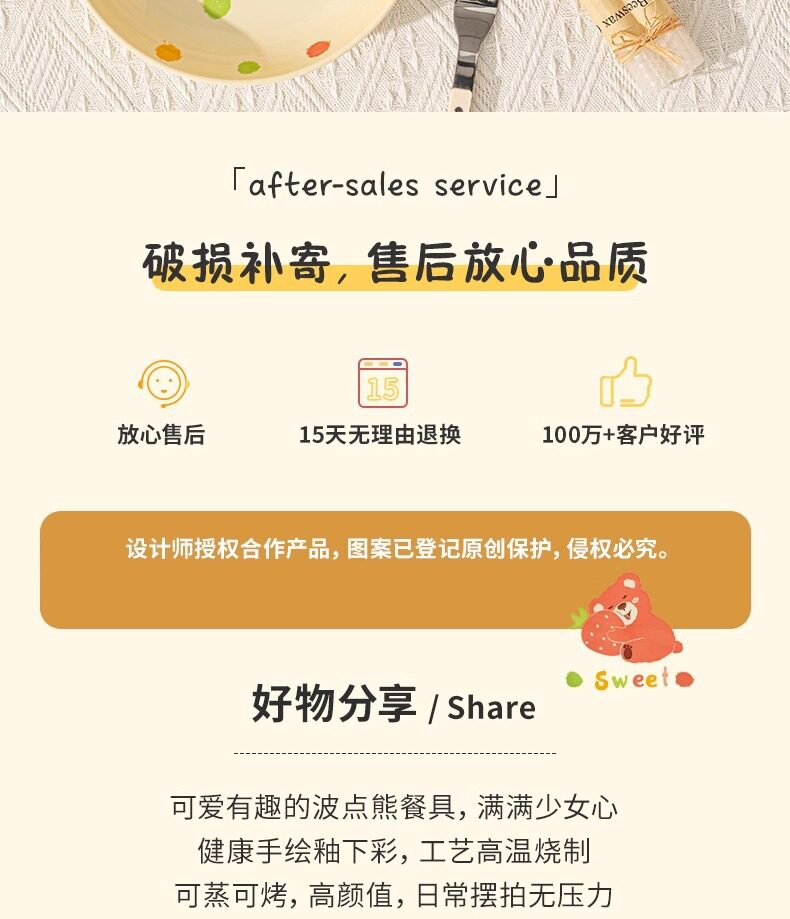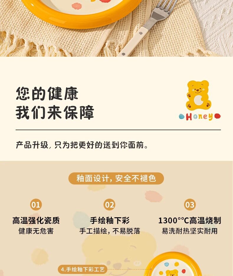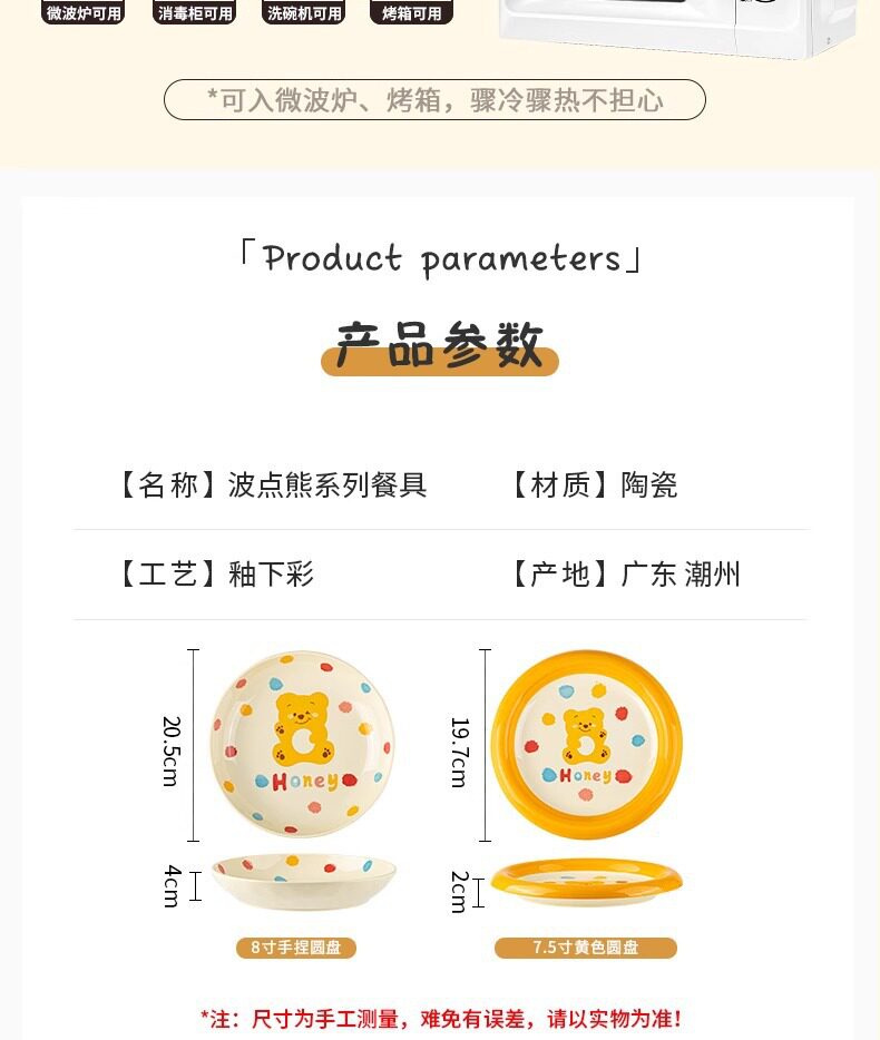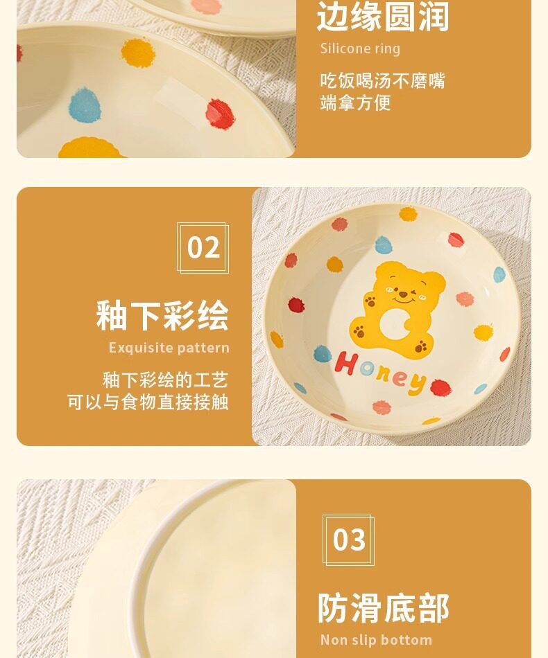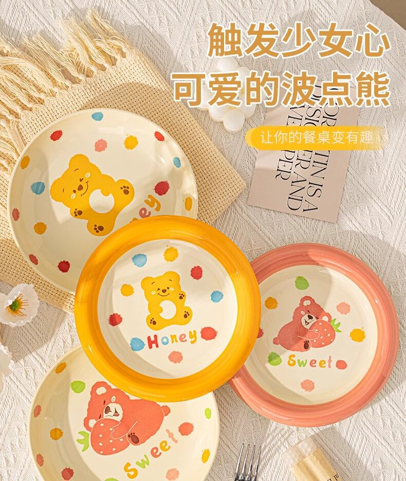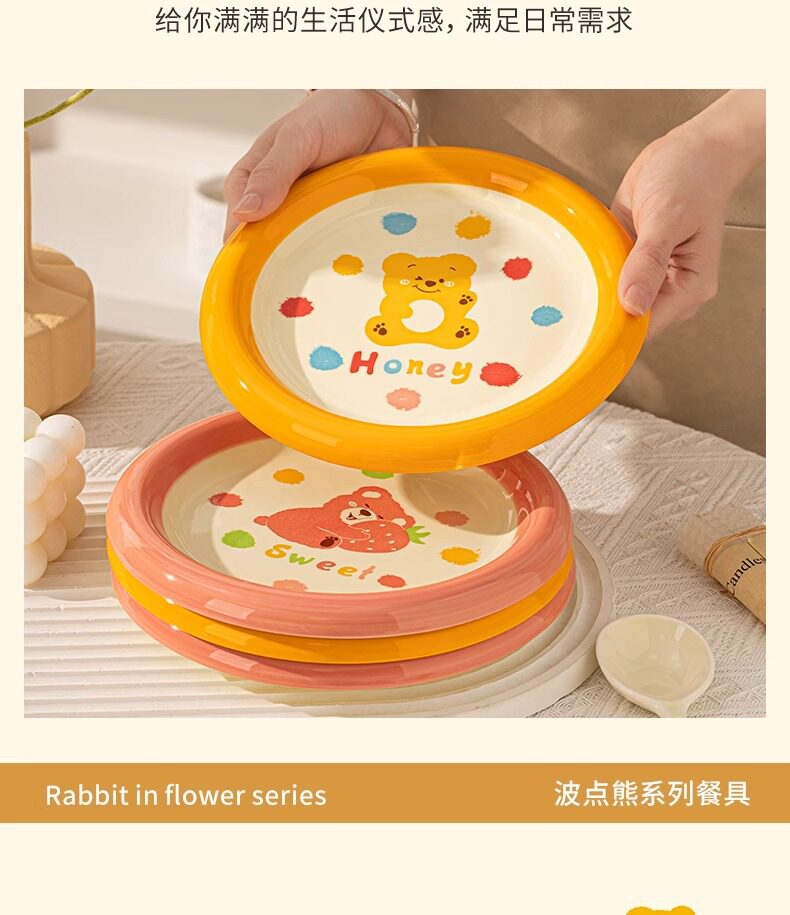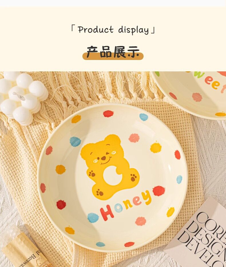 | Color | Little red bear 4inch gourd cup,Little red bear 4.7-inch rice bowl,Little red bear 6inch noodle bowl,Little red bear 7.5inch disc,Little red bear 8inch pinch plate,Little yellow bear 4inch gourd cup,Little yellow bear 4.7-inch rice bowl,Little yellow bear 6inch noodle bowl,Little yellow bear 7.5inch disc,Little yellow bear 8inch hand pinch plate |
