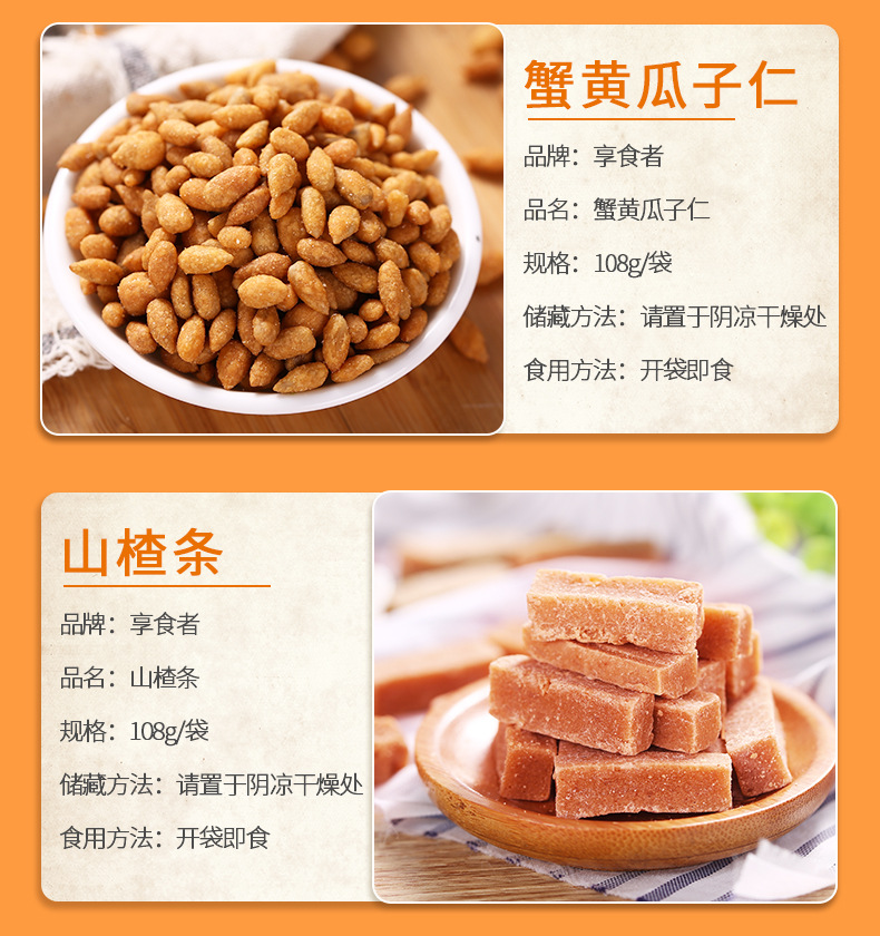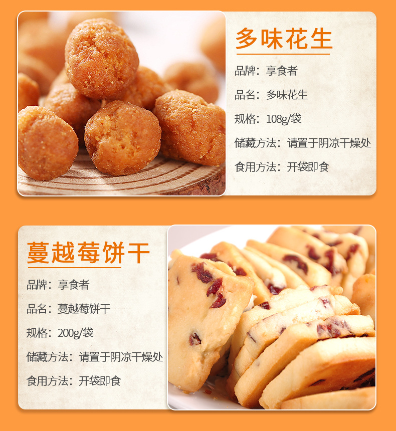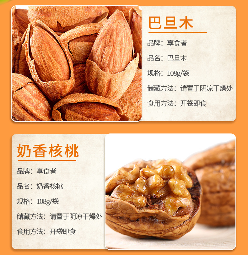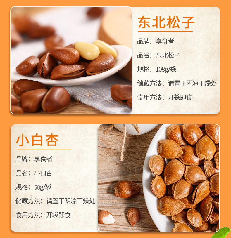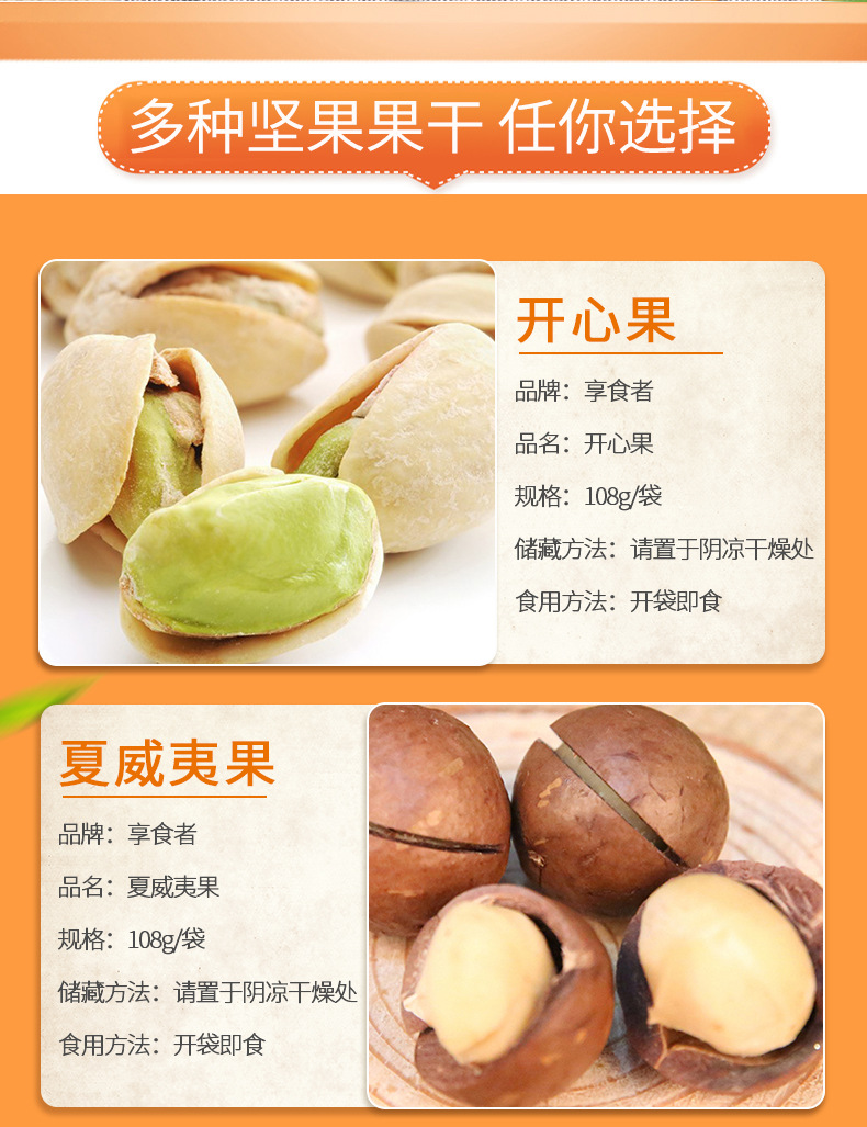 | Packaging specifications | Macadamia nuts 108g,Pistachios 108g,Pecans 108g,Charcoal roasted cashew nuts 108g,Milky walnut 108g,Almonds 108g,Northeast pine nuts 108g,Small apricot 108g,Ruoqiang jujube 108g,Fried rice 108g,Orchid beans 108g,Crab melon seeds 108g,Garlic green beans 108g,Hawthorn strips 108g,Multi-flavor peanuts 108g,Japanese rice crust 100g,Pork jerky 80g,Red raisins 100g,Sweet chestnut kernel 40g,Dried mango 108g,Dried yellow peach 100g,Dried strawberries 80g,Dried pineapple 100g,Banana chips 100g,Instant noodle balls 90g,Dried blackcurrant 80g,Dried cranberries 80g,Sharp corners and crispy 80g,Daily nuts h1 16g,Daily nuts type b 25g,Daily nuts d3 20g,Canned daily nuts 500g |