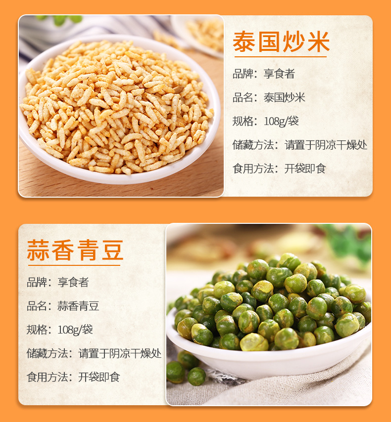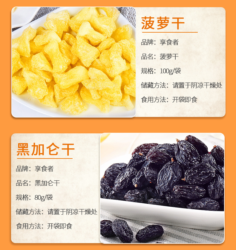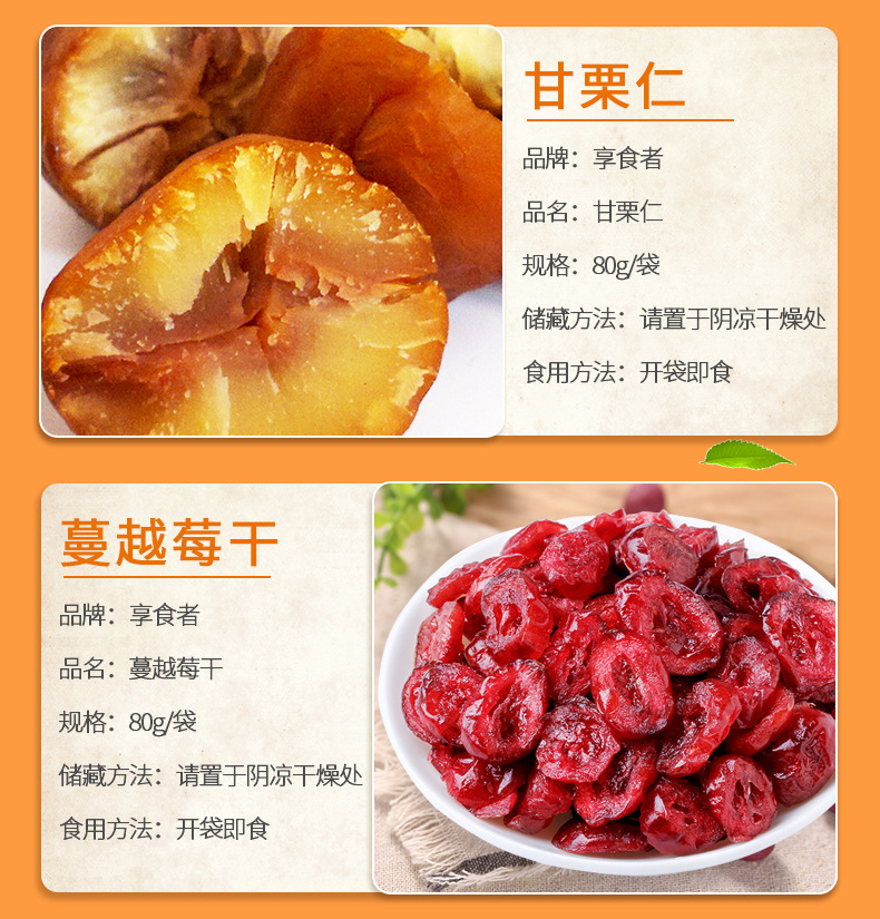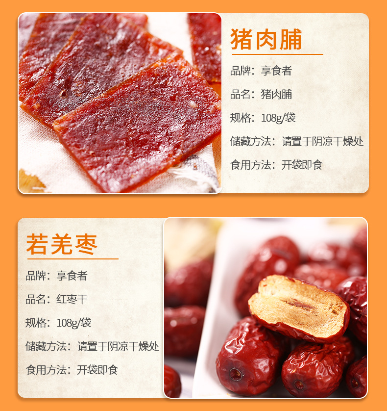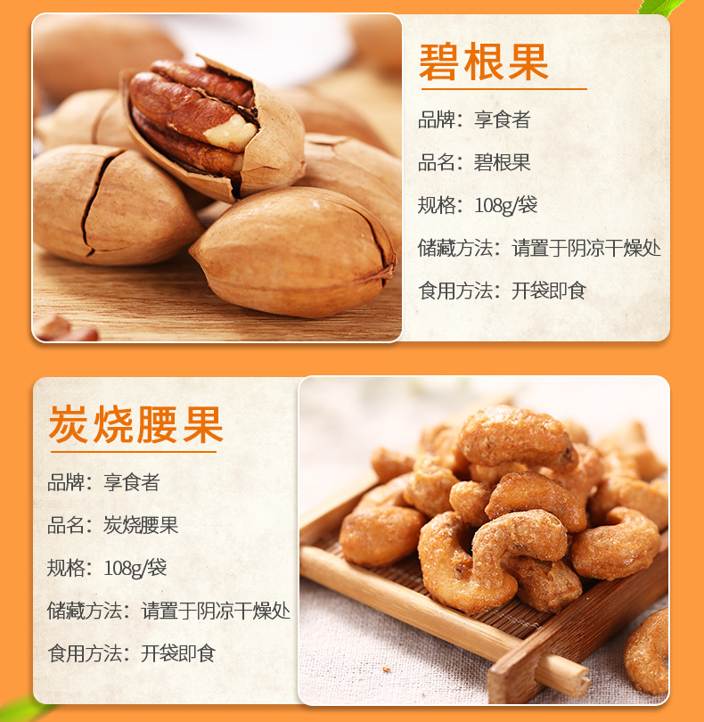 | Packaging specifications | Macadamia nuts 108g,Pistachios 108g,Pecans 108g,Charcoal roasted cashew nuts 108g,Milky walnut 108g,Almonds 108g,Northeast pine nuts 108g,Small apricot 108g,Ruoqiang jujube 108g,Fried rice 108g,Orchid beans 108g,Crab melon seeds 108g,Garlic green beans 108g,Hawthorn strips 108g,Multi-flavor peanuts 108g,Japanese rice crust 100g,Pork jerky 80g,Red raisins 100g,Sweet chestnut kernel 40g,Dried mango 108g,Dried yellow peach 100g,Dried strawberries 80g,Dried pineapple 100g,Banana chips 100g,Instant noodle balls 90g,Dried blackcurrant 80g,Dried cranberries 80g,Sharp corners and crispy 80g,Daily nuts h1 16g,Daily nuts type b 25g,Daily nuts d3 20g,Canned daily nuts 500g |