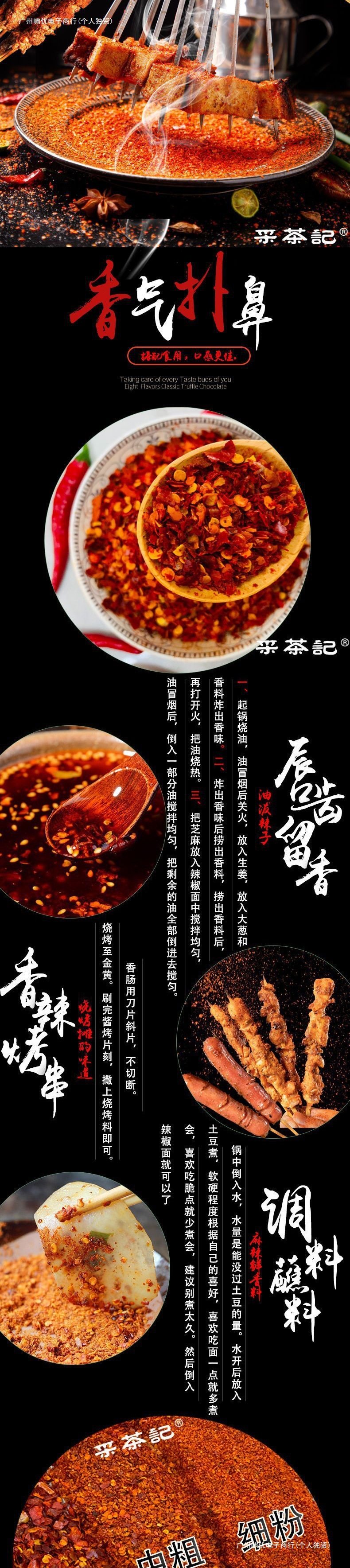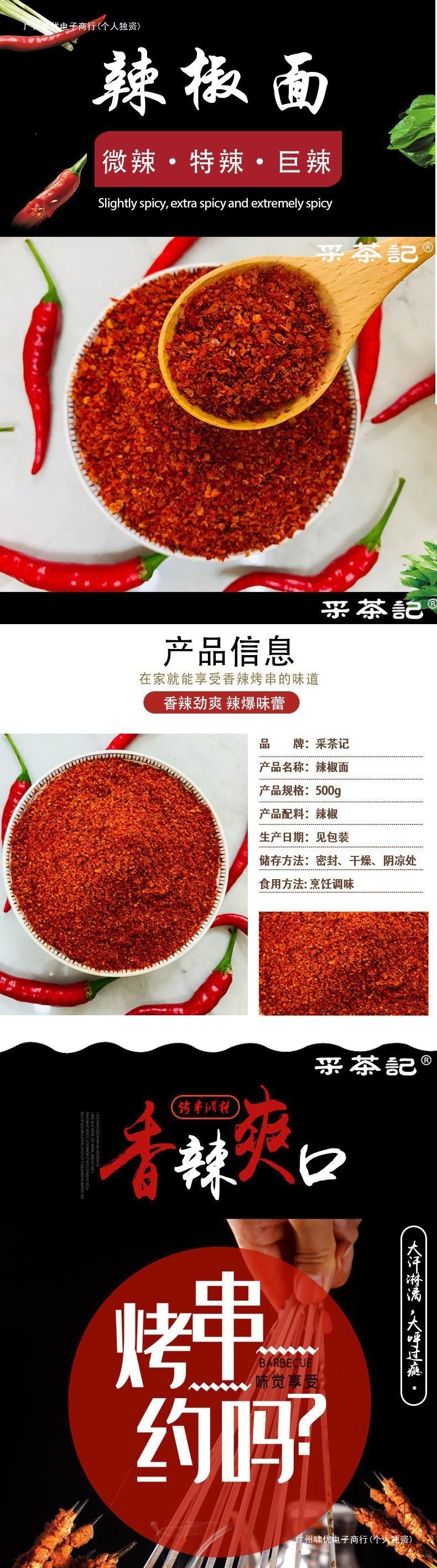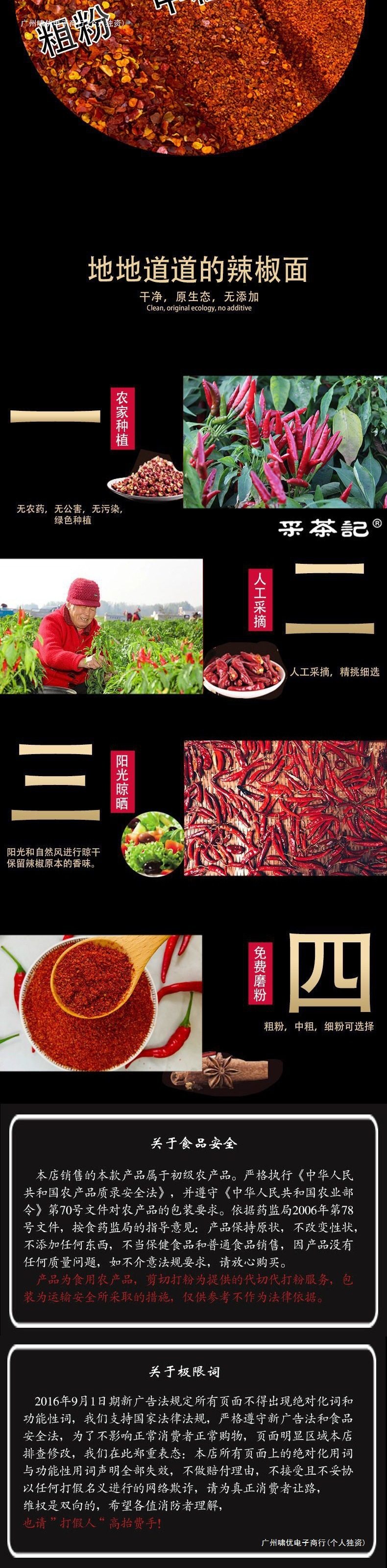 | Packaging specifications | I slightly spicy--fine powder-22g [very small amount],I slightly spicy--coarse powder-100g [special tasting pack],I mildly spicy--fine powder-100g [special tasting pack],2 extra spicy--coarse powder-100g [special tasting pack],2 extra spicy--medium coarse-100g [special tasting pack],2 extra spicy--fine powder-100g [special tasting pack],3 ju spicy--coarse powder-100g [special tasting pack],3 spicy--medium coarse-100g [special tasting pack],3 super spicy--fine powder-100g [special tasting pack],1-1 special fragrance extra fine red oil-100g [special tasting pack],1-1 te xiang medium coarse liangpi oil splashed noodles with red oil - 100g [special offer tasting pack],I slightly spicy--coarse powder-250g [half catty],I slightly spicy--medium coarse-250g [half catty],I slightly spicy--fine powder-250g [half catty],2 extra spicy--coarse powder-250g [half catty],2 extra spicy--medium thick-250g [half catty],2 extra spicy--fine powder-250g [half a pound],3 spicy - coarse powder - 250g [half a pound],3 huge spicy--medium thick-250g [half catty],3 ju spicy--fine powder-250g [half catty],6-1 spicy--medium coarse powder-250g [half catty],1-1 special fragrance extra fine red oil-250g [half a pound],1-1 te xiang medium thick liangpi oil splashed noodles with red oil - 250g [half a pound],I slightly spicy--coarse powder-500g [ 0.5kg affordable pack],I slightly spicy--medium coarse-500g [ 0.5kg affordable pack],I slightly spicy--fine powder-500g [ 0.5kg affordable pack],2 extra spicy--coarse powder-500g【0.5kg affordable pack】,2 extra spicy--medium thick-500g [ 0.5kg affordable pack],2 extra spicy--fine powder-500g【0.5kg affordable pack】,3 spicy-coarse powder-500g【0.5kg affordable pack】,3 huge spicy--medium thick-500g [ 0.5kg affordable pack],3 spicy--fine powder-500g【0.5kg affordable pack】,1-1 special fragrance extra fine red oil-500g【0.5kg affordable pack】,1-1 te xiang medium coarse liangpi oil splashed noodles with red oil-500g [ 0.5kg affordable pack],I slightly spicy--coarse powder-1000g【1.0kg pack】,I slightly spicy--medium thick-1000g【1.0kg pack】,I slightly spicy--fine powder-1000g【1.0kg pack】,2 extra spicy--coarse powder-1000g【1.0kg pack】,2 extra spicy--medium thick-1000g【1.0kg pack】,2 extra spicy--fine powder-1000g【1.0kg pack】,3 spicy-coarse powder-1000g【1.0kg pack】,3 spicy--medium thick-1000g【1.0kg pack】,3 spicy--fine powder-1000g【1.0kg pack】 |