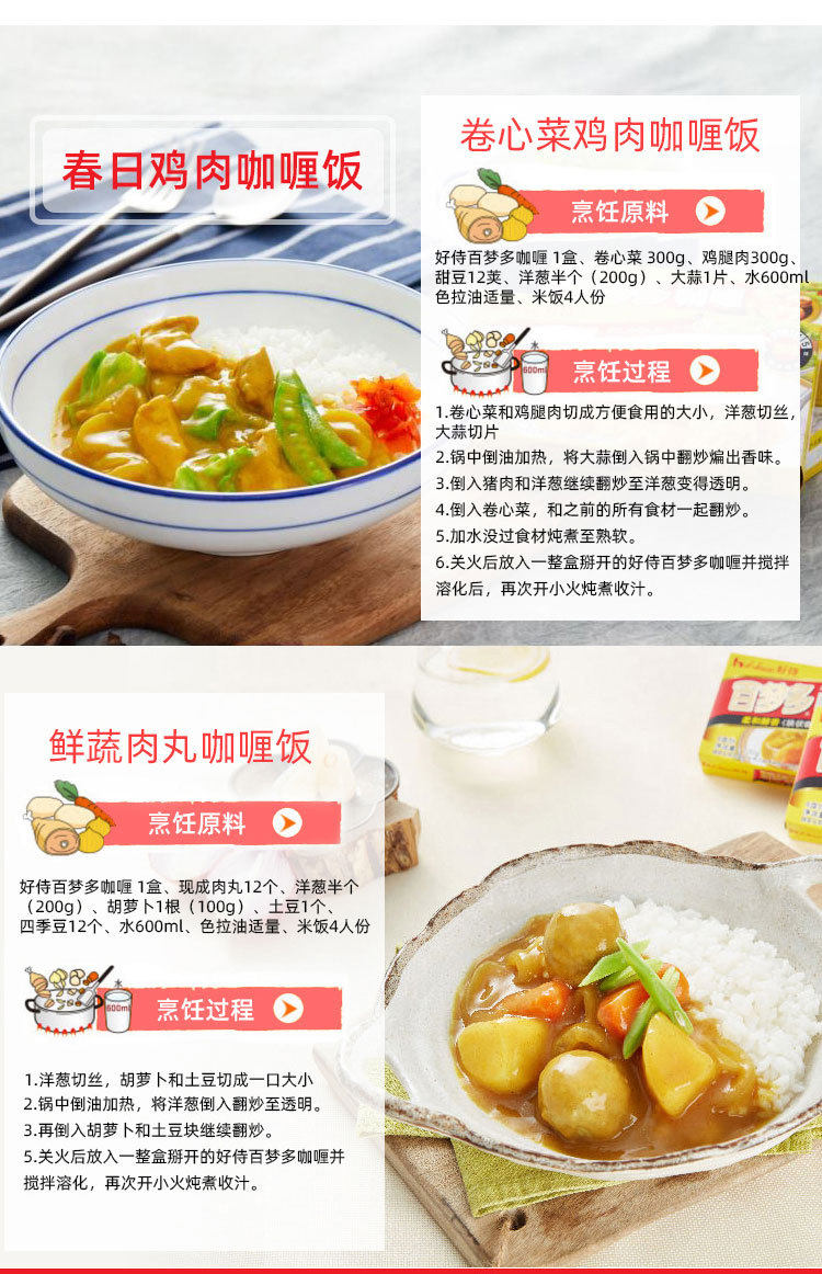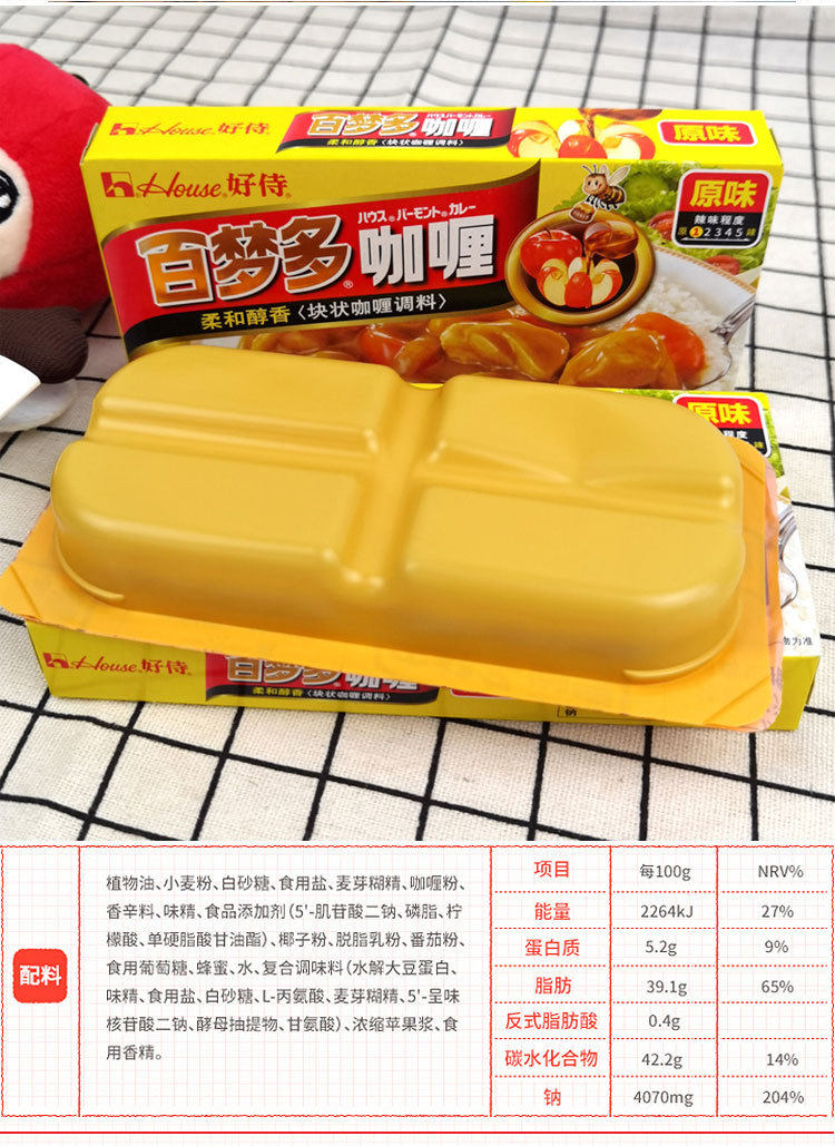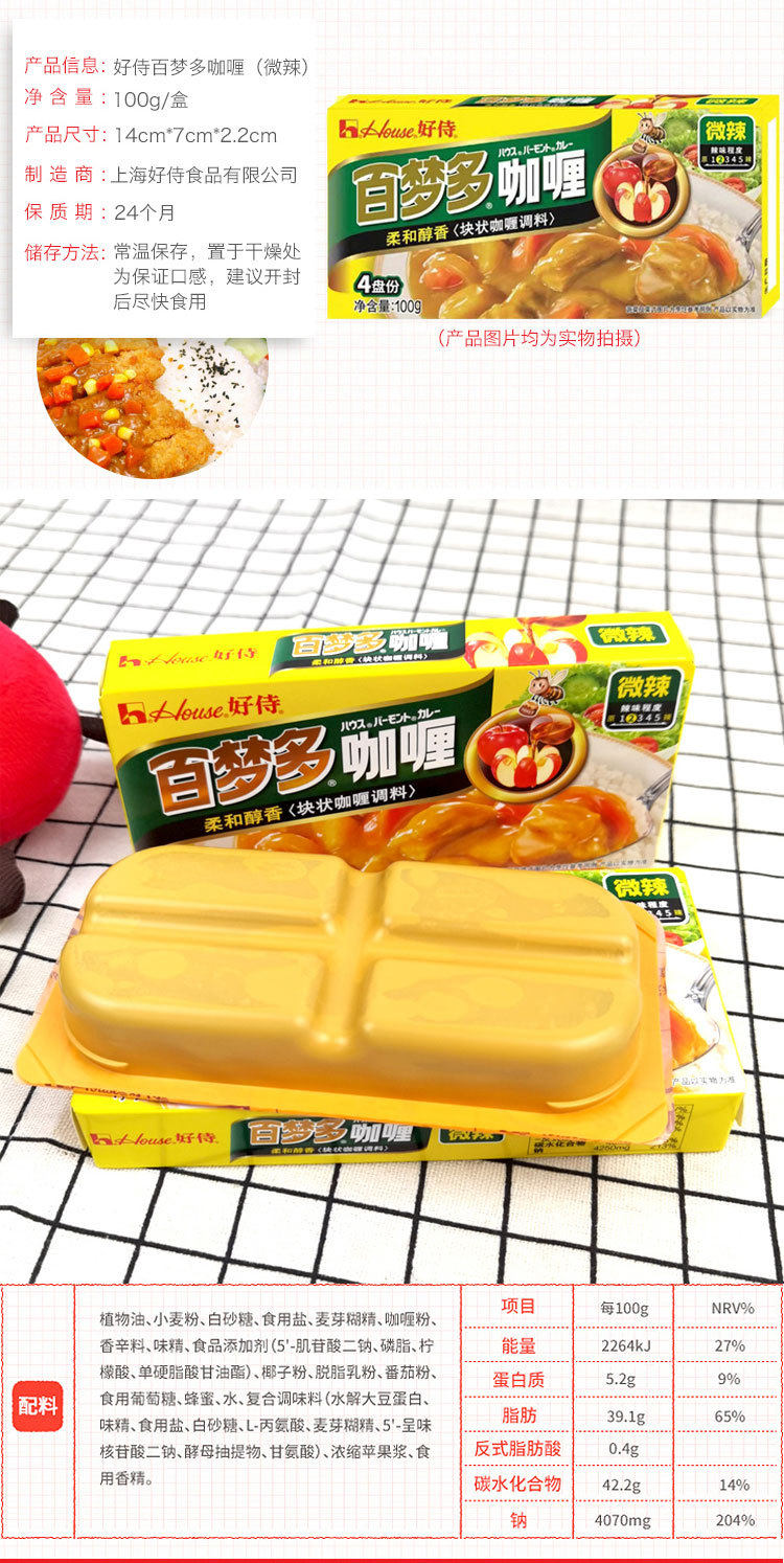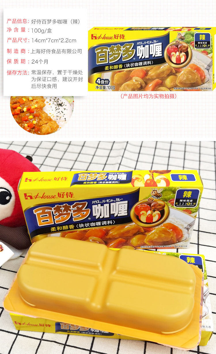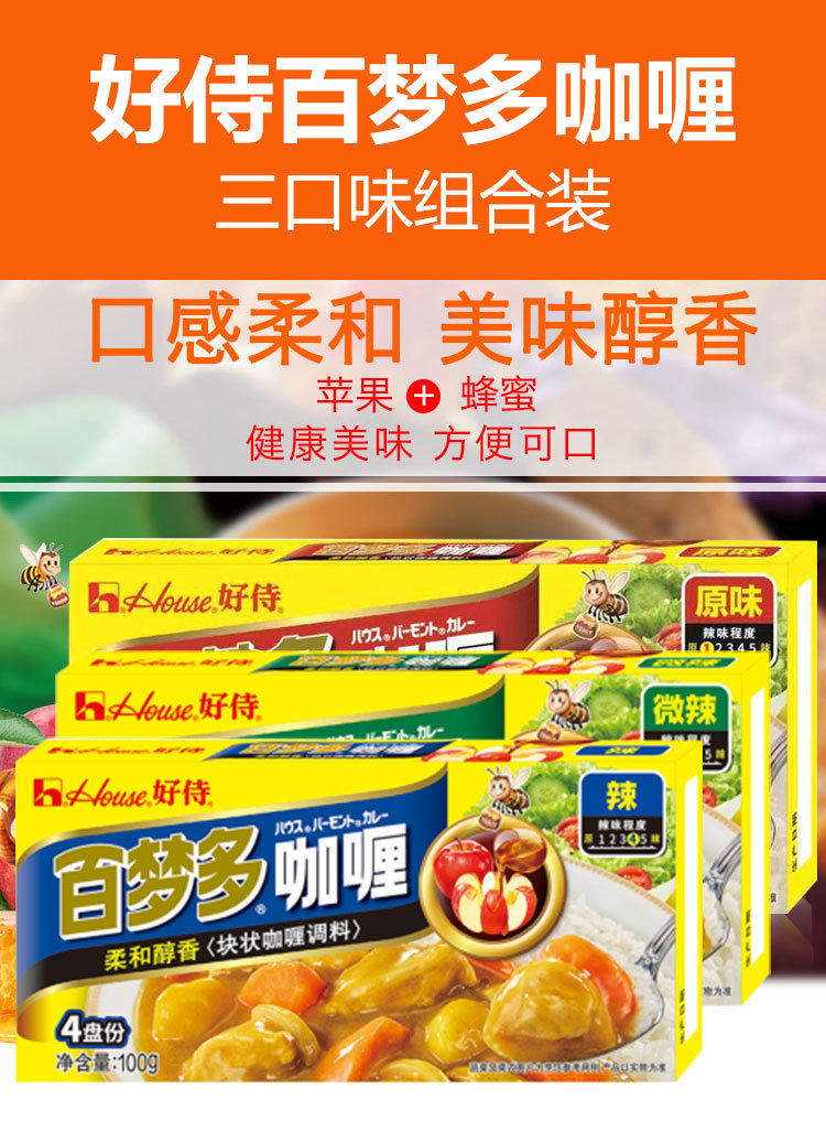 | Packaging specifications | 100g haoshi baimengduo curry no. 1 original flavor*1 box,100g haoshi baimengduo curry no. 2 slightly spicy * 1 box,100g haoshi baimengduo curry no. 4 spicy*1 box |