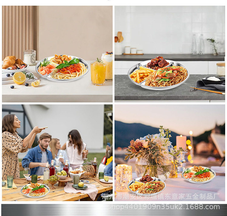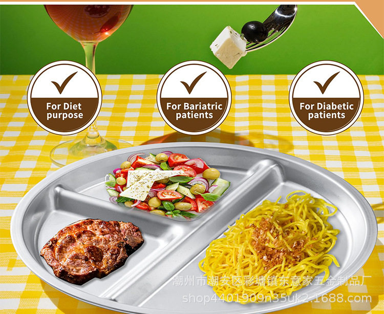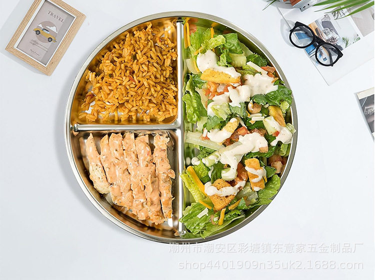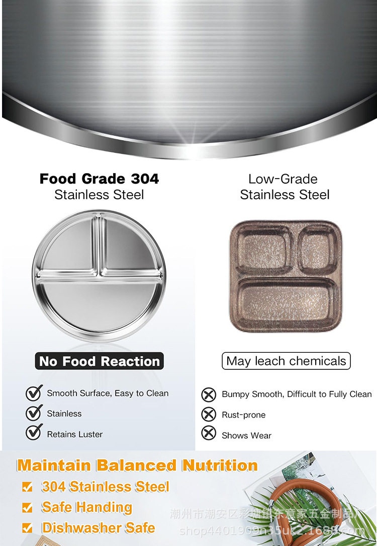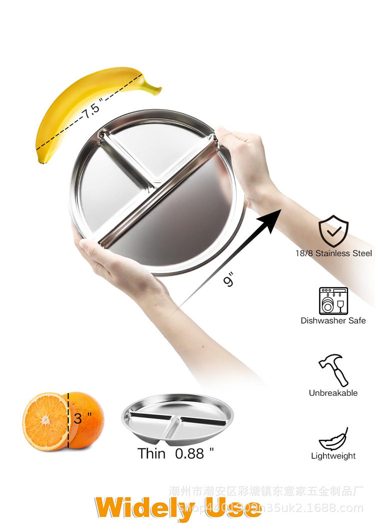 Amazon New Product Dinner Plate Children's Tableware Food-Grade Fat-Reducing Plate Non-Slip Feeding 304 Stainless Steel Three-Compartment Dinner Plate