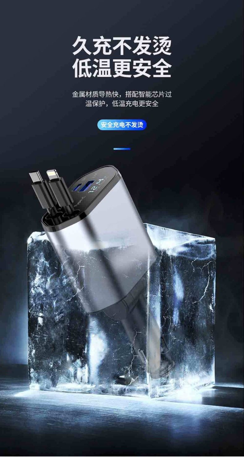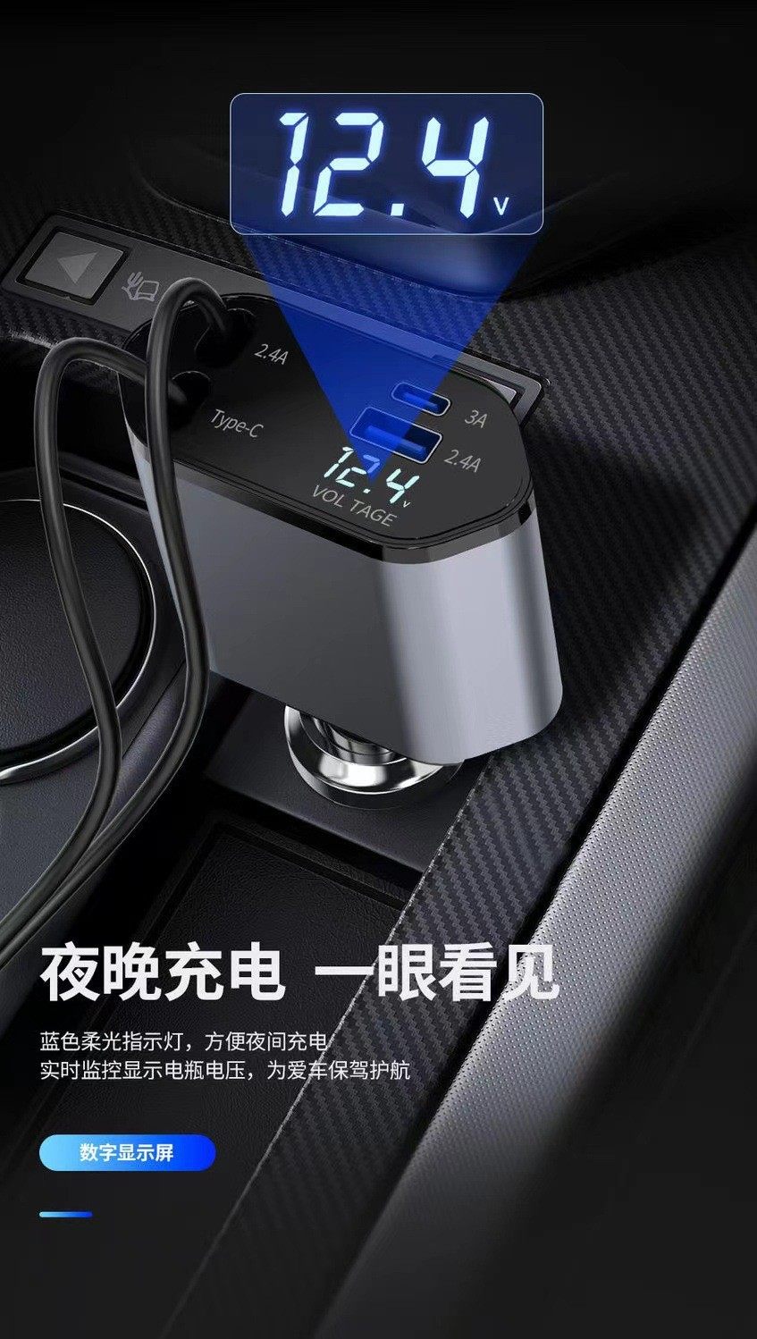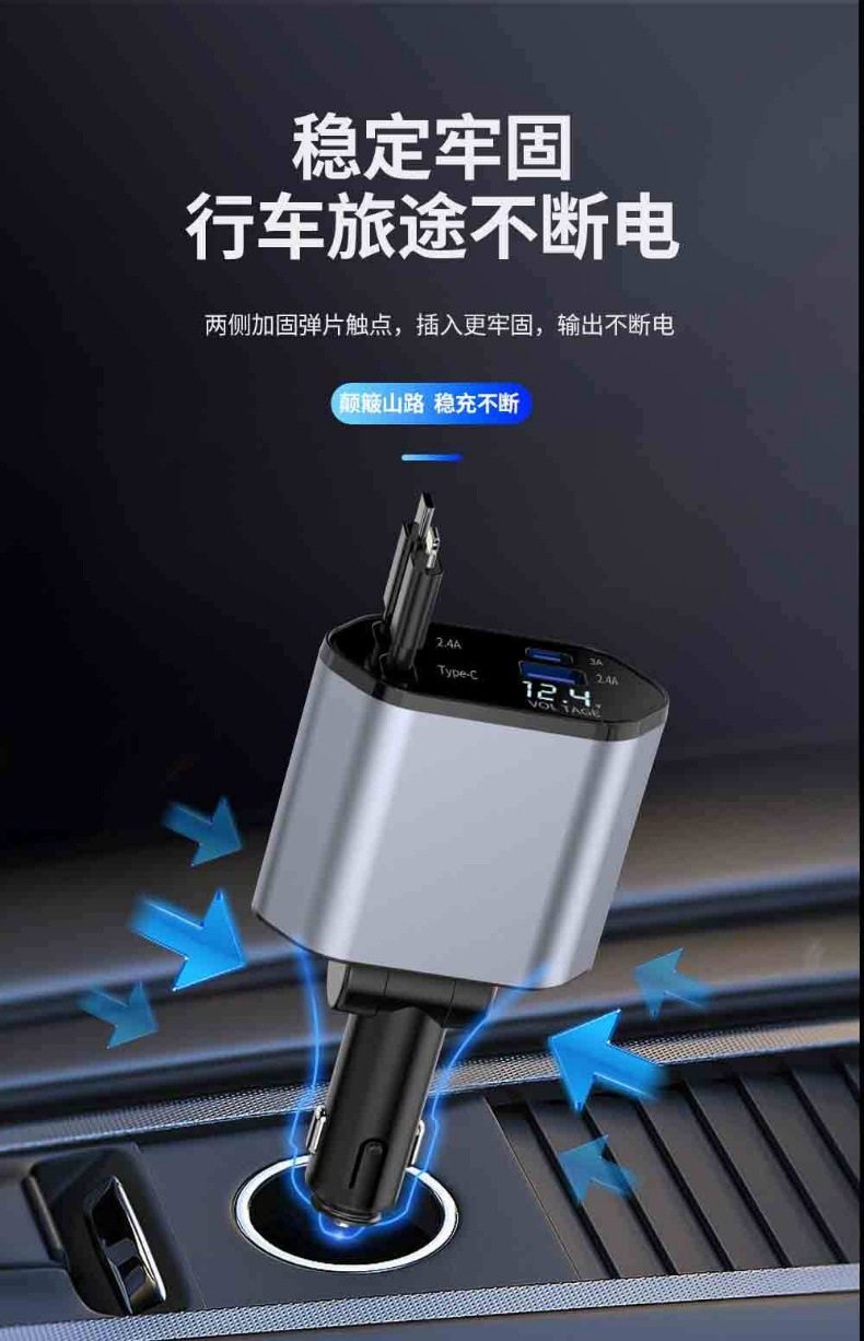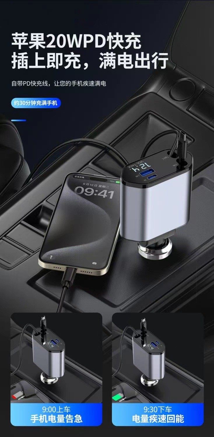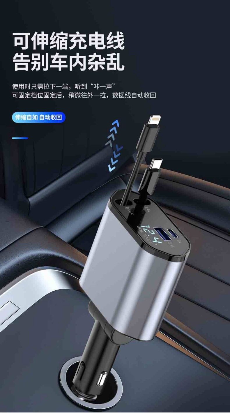 Cross-Border Popular 120W Car Charger Multifunctional Fast Charging Universal Retractable Alloy Digital Display One-To-Four Flash Charging Car Charger