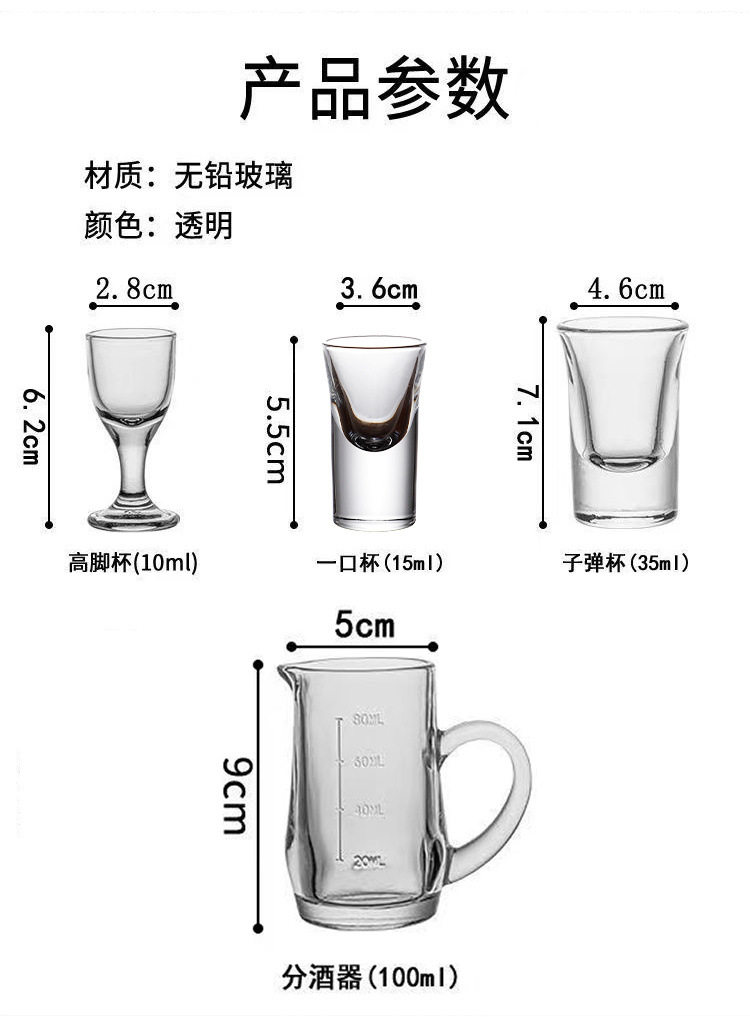 | Color | 6 goblets 10ml,2 wine dispensers 100ml,2 goblets + 2 wine dispensers,4 goblets + 4 wine dispensers,6 goblets + 6 wine dispensers,2 cups + 2 wine dispensers,4 cups + 4 wine dispensers,6 cups + 6 wine dispensers,6 cups of 15ml,8-angle cups 6 pieces 45ml,Bullet cup 6 pieces 30ml,6 rum glasses 75ml,4 wine dispensers 100ml,6 wine dispensers 100ml |